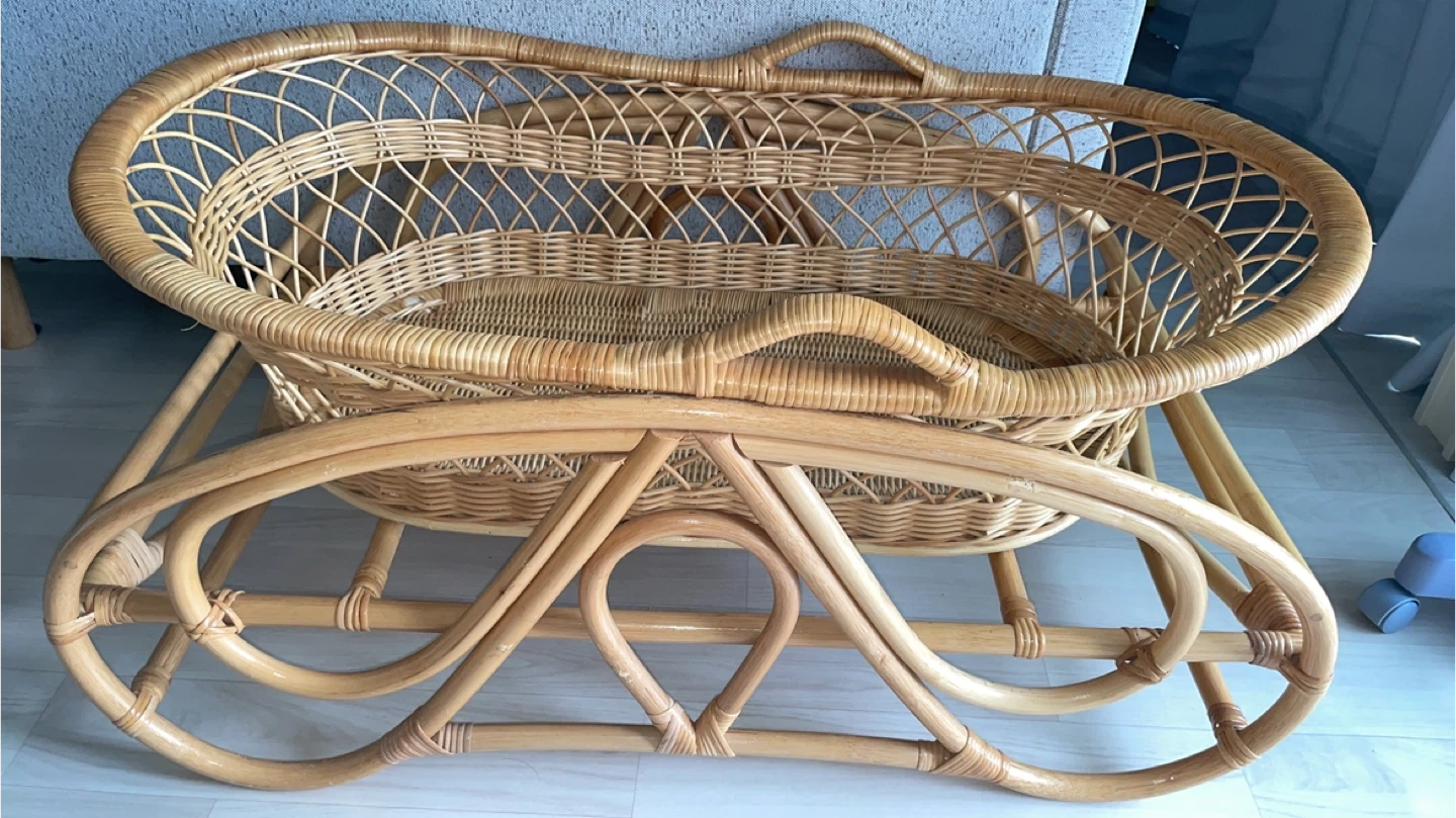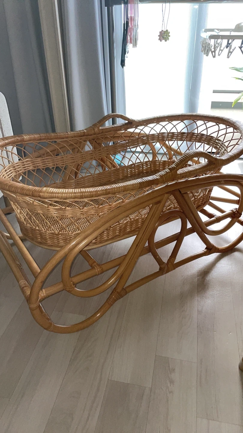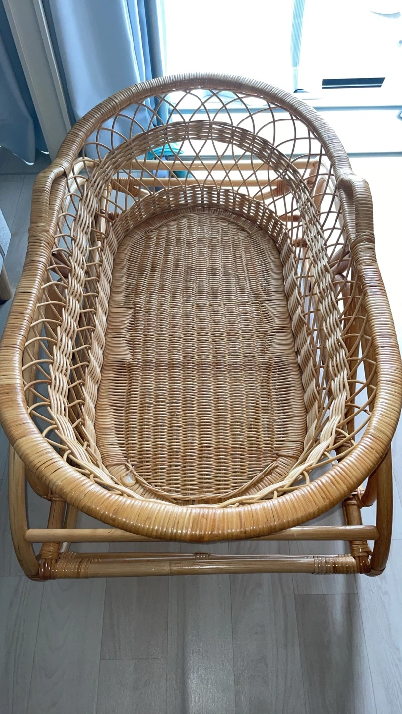 ラタンのベビーベッド&ゆりかごです。 - 素材: ラタン - デザイン: オーバル型 - 特徴: 持ち手付き - スタイル: ナチュラル - 用途: ベビー用ゆりかご ご覧いただきありがとうございます。 足の部分を反対にするとゆりかご↔︎ベッドとして利用できます。 セカンドベッドとしても利用可能です。 頂き物のため、メーカーや使用期間などは不明です。 中古品であることご了承ください