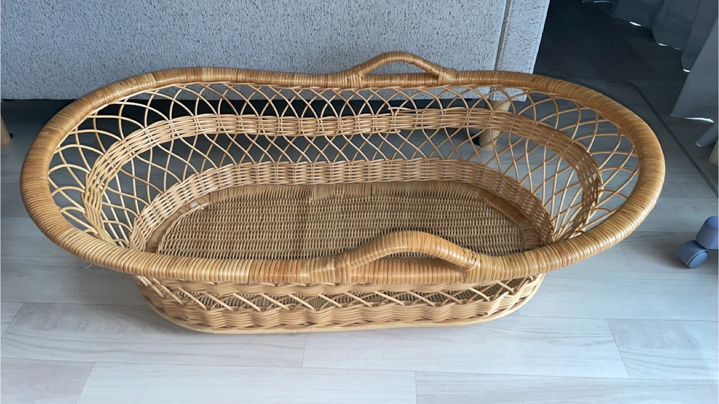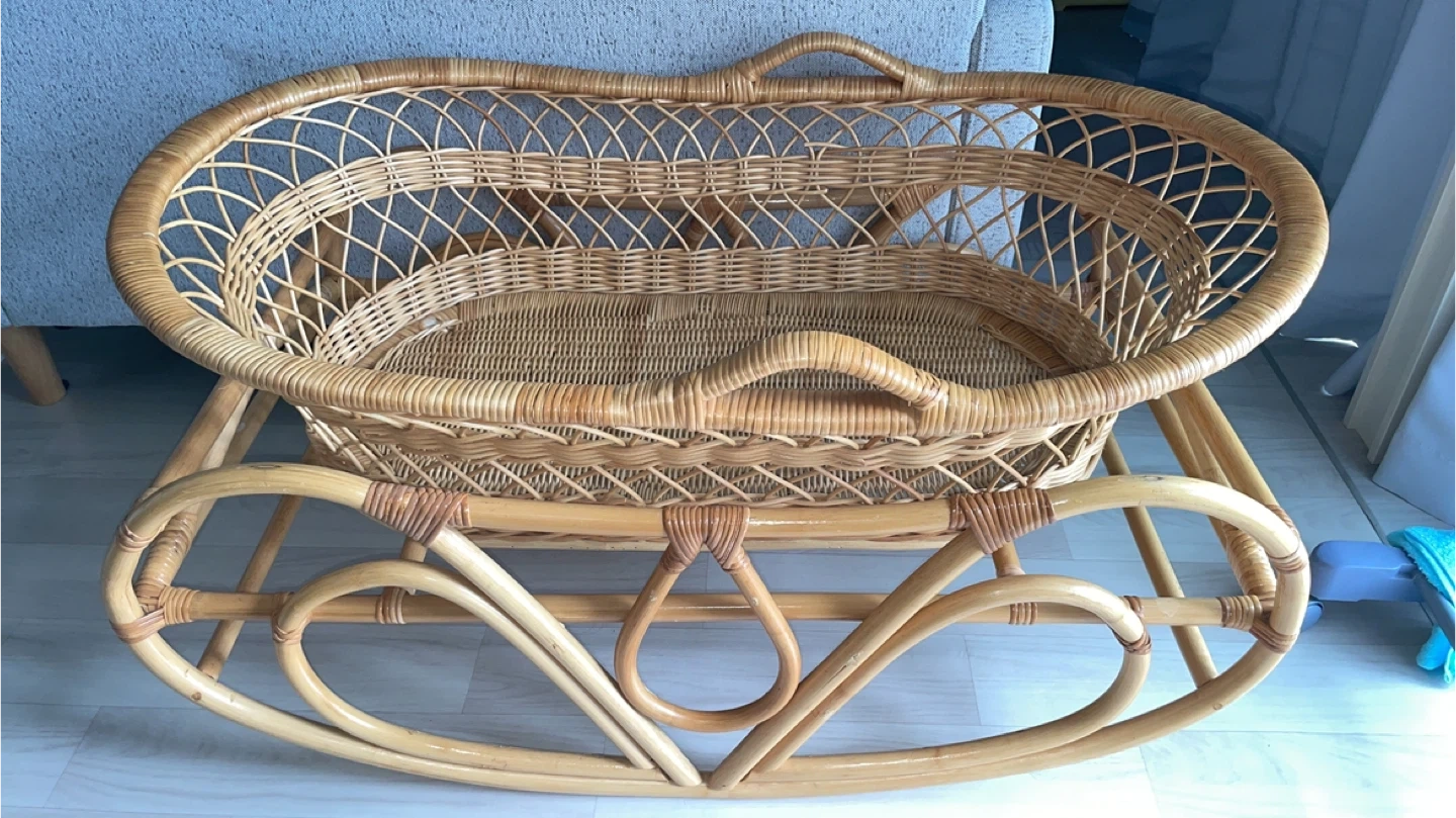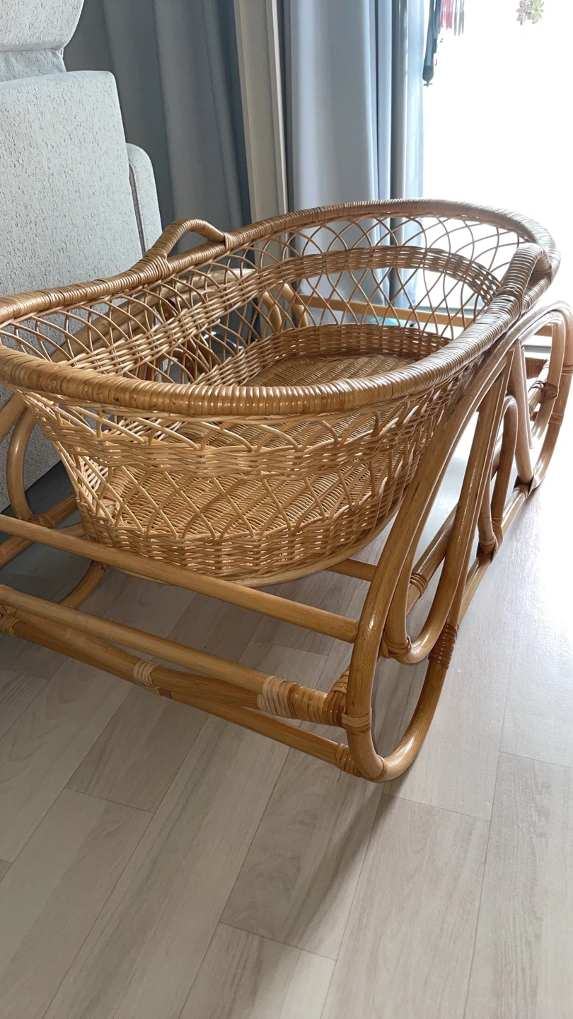 ラタンのベビーベッド&ゆりかごです。 - 素材: ラタン - デザイン: オーバル型 - 特徴: 持ち手付き - スタイル: ナチュラル - 用途: ベビー用ゆりかご ご覧いただきありがとうございます。 足の部分を反対にするとゆりかご↔︎ベッドとして利用できます。 セカンドベッドとしても利用可能です。 頂き物のため、メーカーや使用期間などは不明です。 中古品であることご了承ください