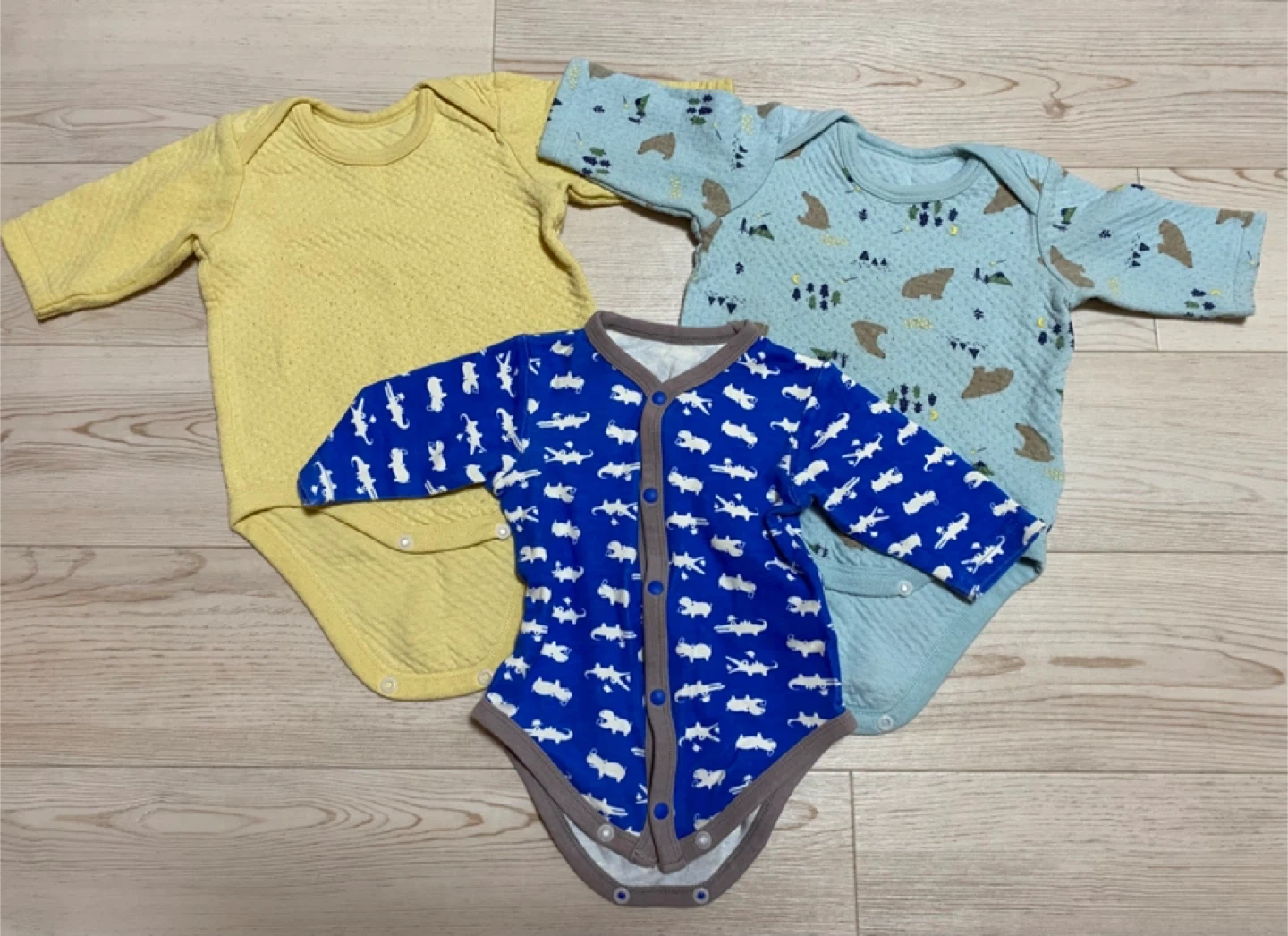 ベビー服 3枚セットです 前開きロンパース 60cm 他2枚 70cm ※タグがついていないものあります 後ろの2枚はやや厚手の素材でできています。 毛玉など使用感ありますが、まだまだお使いいただけると思います(^^) 中古品であることご了承ください