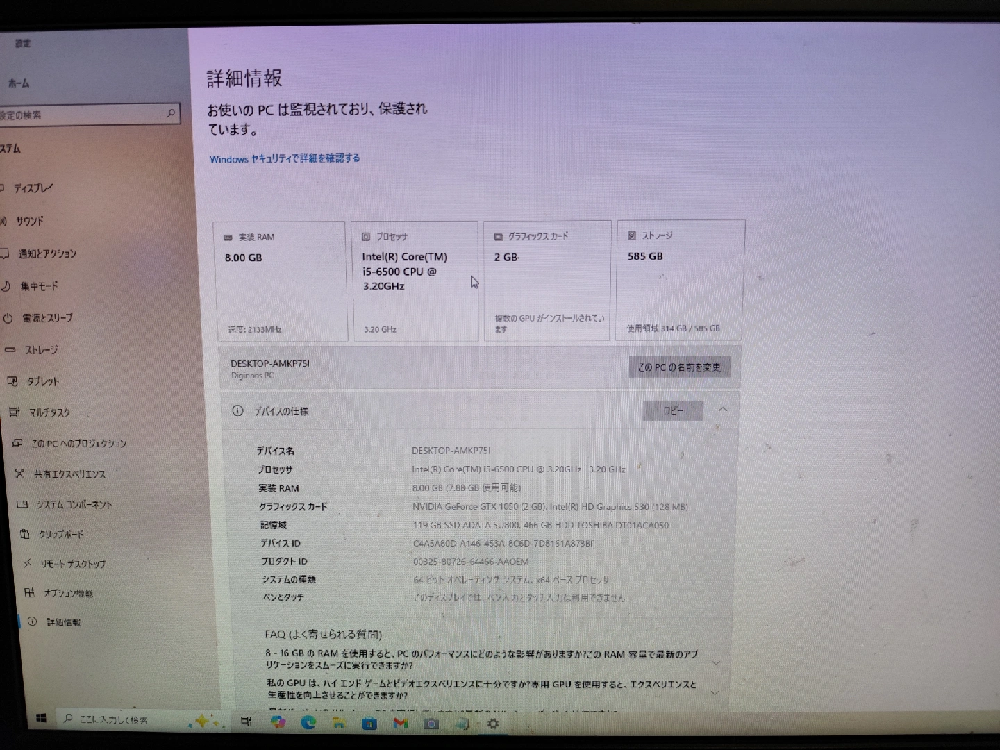 ゲーミングデスクトップ本体、BenQのゲーミングモニター、Logicoolのゲーミングマウス、ELECOMのキーボード、その他各種コードおまとめ(hdmiコード、DualLINEコード、モニターとパソコンの電源コード2個) ※パソコンのスペック 実装 RAM 8.00 GB 速度:2133MHz 3.20 GHz DESKTOP-AMKP751 Diginnos PC ① デバイスの仕様 デバイス名 プロセッサ 実装 RAM グラフィックスカード 記憶域 デバイス ID プロダクト ID システムの種類 ペンとタッチ ◎プロセッサ Intel(R) Core(TM) i5-6500 CPU @ 3.20GHz グラフィックスカード 2 GB ストレージ 585 GB 複数のGPUがインストールされています 使用領域 314GB/585 GB このPCの名前を変更 DESKTOP-AMKP751 Intel(R) Core(TM) i5-6500 CPU @ 3.20GHz 3.20 GHz 8.00 GB (7.88 GB 使用可能) NVIDIA GeForce GTX 1050 (2 GB), Intel(R) HD Graphics 530 (128 MB) 119 GB SSD ADATA SU800, 466 GB HDD TOSHIBA DT01ACA050 4A5A80D-A146-453A-8C6D-708161A873BF 00325-80726-64466-AAOEM 64 ビット オペレーティング システム、x64 ベース プロセッサ このディスプレイでは、ペン入力とタッチ入力は利用できません ※動作確認済み ※パソコン初期化済み ※全体的に損傷や傷などありますが、動作には全く問題ありません 自宅まで、引き取ってくれる方探しています