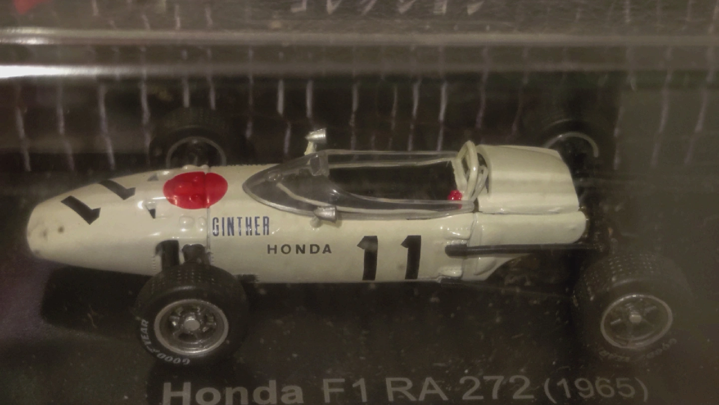 ホンダのF1 RA 272 (1965)のミニカーです。 ・ブランド:ホンダ ・車種:F1 RA 272 ・年式:1965年 ・状態:中古品、箱付き ・備考:GINTHER HONDA 11 コレクションボックス付 未使用未開封