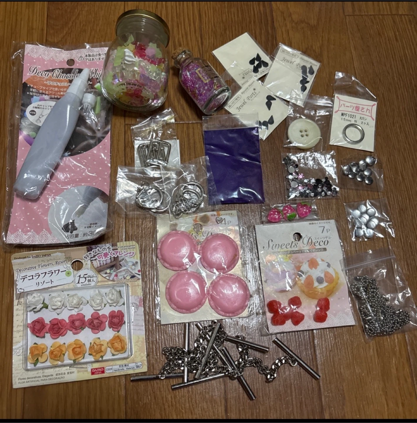 ハンドメイド用品 デコレーションホイップ ビーズ 丸カン ボタン デコパーツ マカロン いちご お花(バラ) ベルトバックル キーホルダーチェーン レジン用カラーパウダー ボールチェーン などのセットです ボールチェーンと大きいビーズとチェーンのみ開封済み お引越しに伴い10/5~10/16にお取引できる方を探しております。(日にち、場所応相談) 10/5は夜のみ。 日にち前にずらす事はできますが、16日以降は部屋を出てしまうためお取り引き不可です。 こちら生田駅でのお取り引き優先>小田急線内、新宿、池袋でのお取り引きも日により可能になりますので、ご相談ください! 纏めて購入いただける方優先致します。 他に出品しているものと纏めて購入していただける場合値引き可能です!