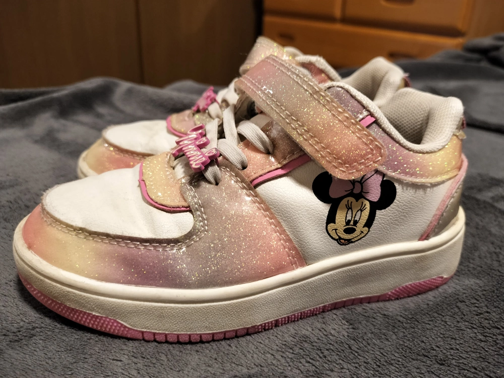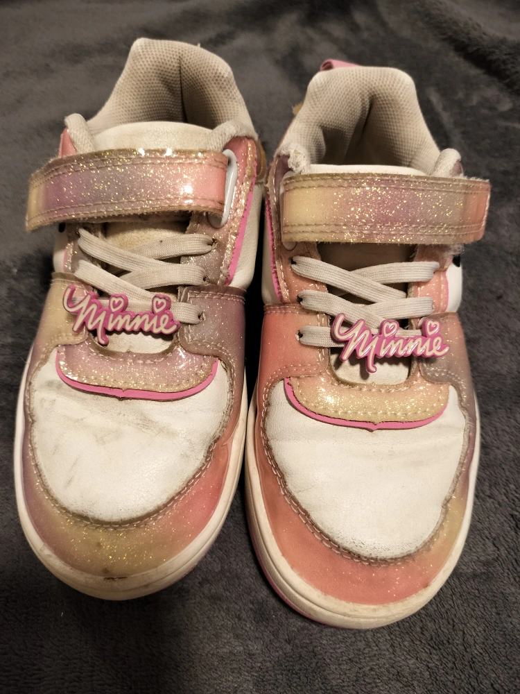 ミニーのスニーカーです。 ・色:ピンク、ホワイト ・サイズ:17cm ・全体的に使用感あり とても履き心地が良いので使い続けたいのですが、娘はこのサイズでは足りなくなってしまいました。 中古品であることご了承ください