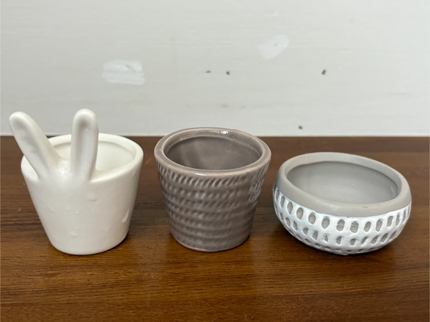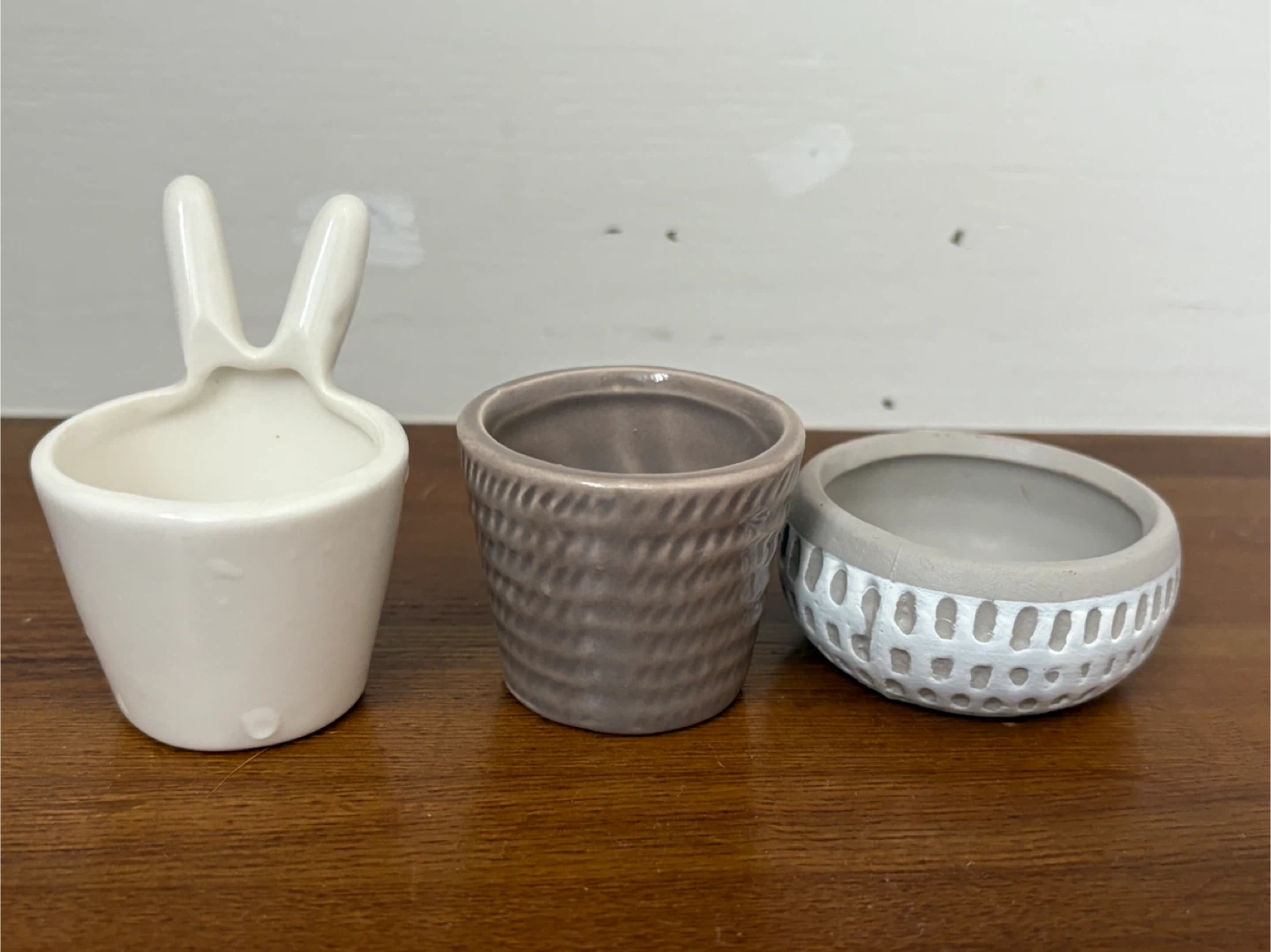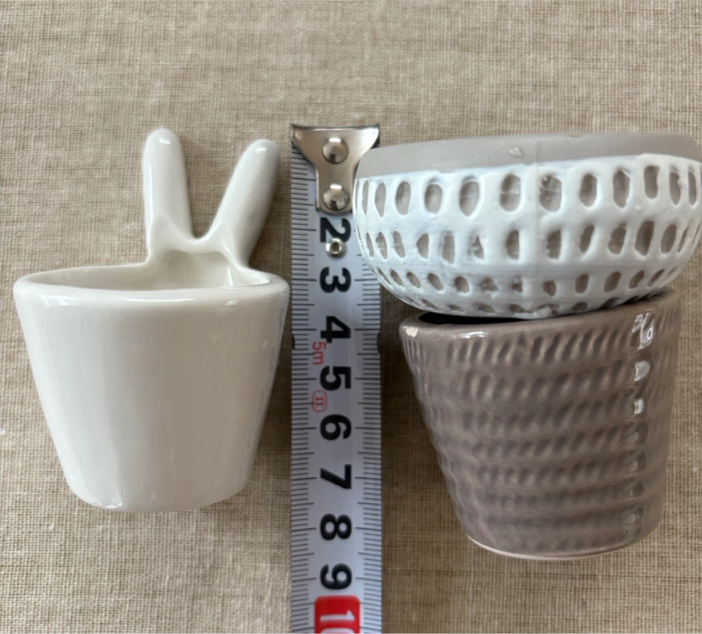 ミニ植木鉢3個セットです ・ウサギ耳付き:白、高さ約6cm ・編み込み風:茶色、高さ約5cm ・穴あき模様:グレー、高さ約4cm ・全て内径約4cm 未使用品です。 小さい植物や、アクセサリーや小物入れに。 プロフ一読お願いします。 引き渡し場所も、良くご確認ください。 三軒茶屋駅より距離があり、徒歩かバスになります。