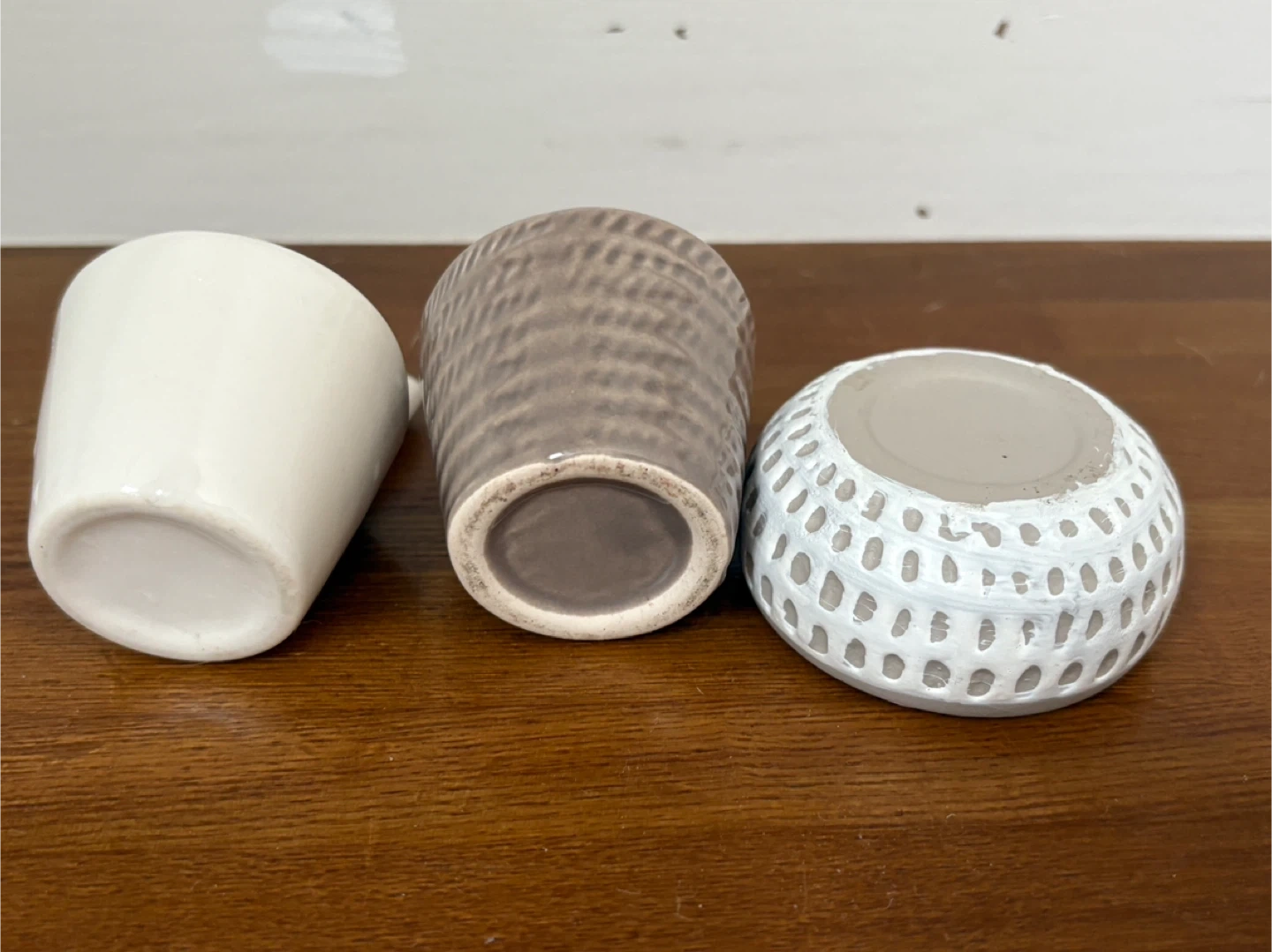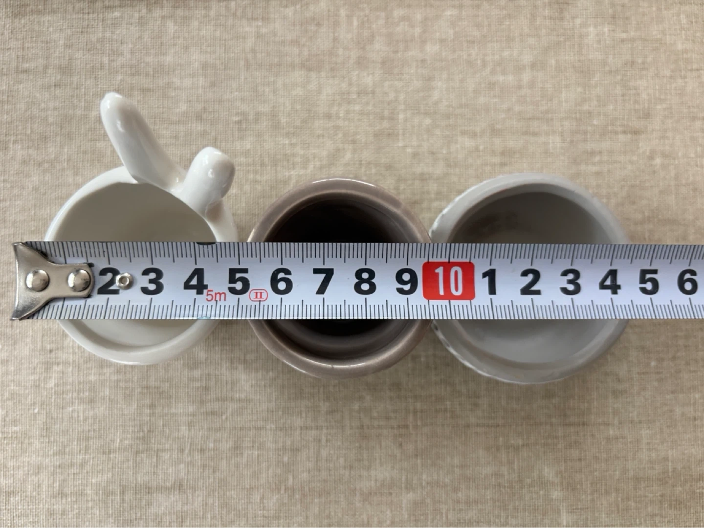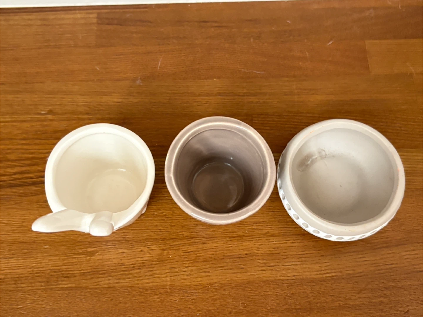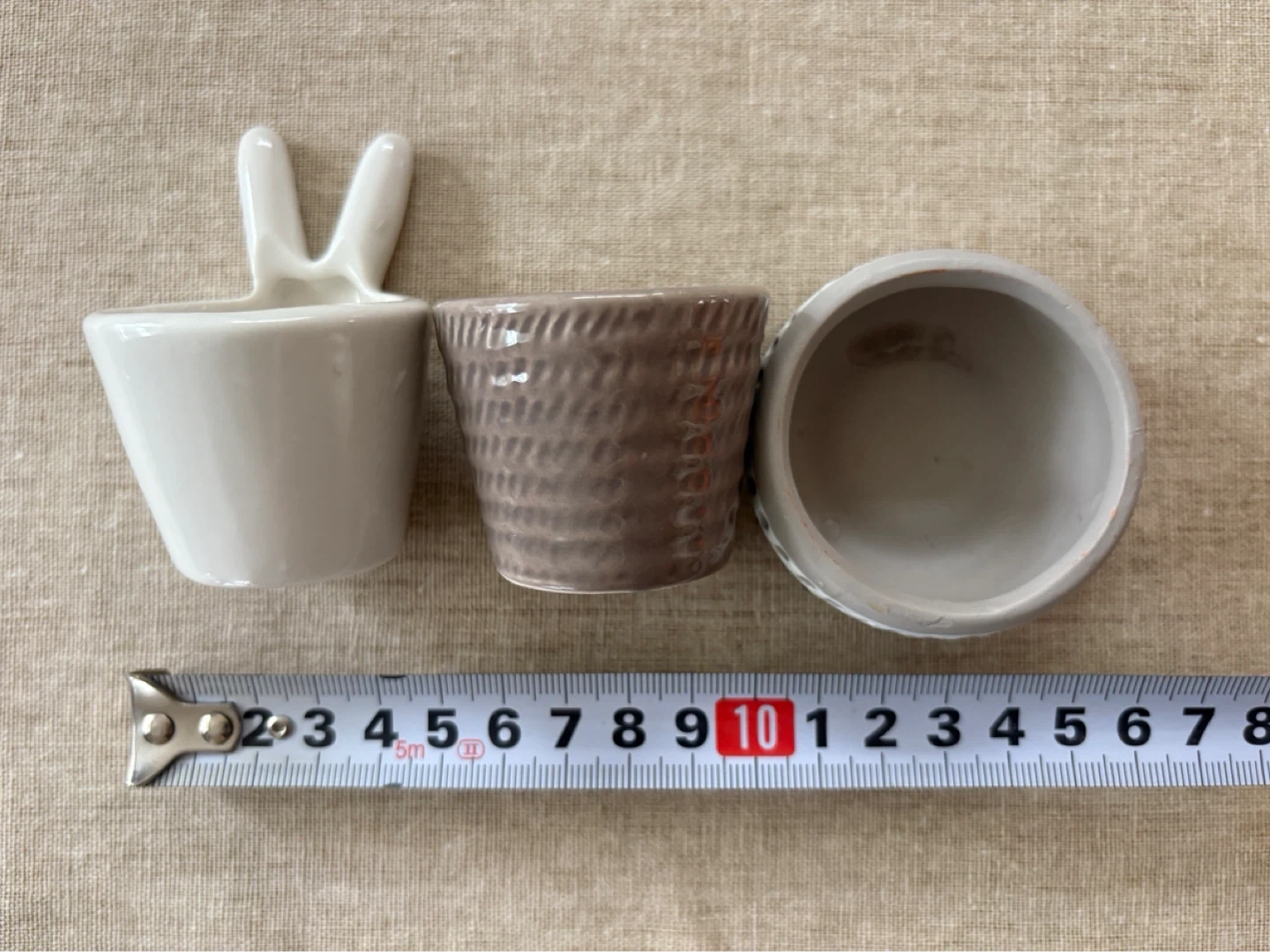 ミニ植木鉢3個セットです ・ウサギ耳付き:白、高さ約6cm ・編み込み風:茶色、高さ約5cm ・穴あき模様:グレー、高さ約4cm ・全て内径約4cm 未使用品です。 小さい植物や、アクセサリーや小物入れに。 プロフ一読お願いします。 引き渡し場所も、良くご確認ください。 三軒茶屋駅より距離があり、徒歩かバスになります。
