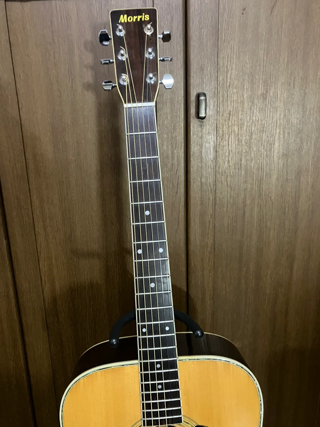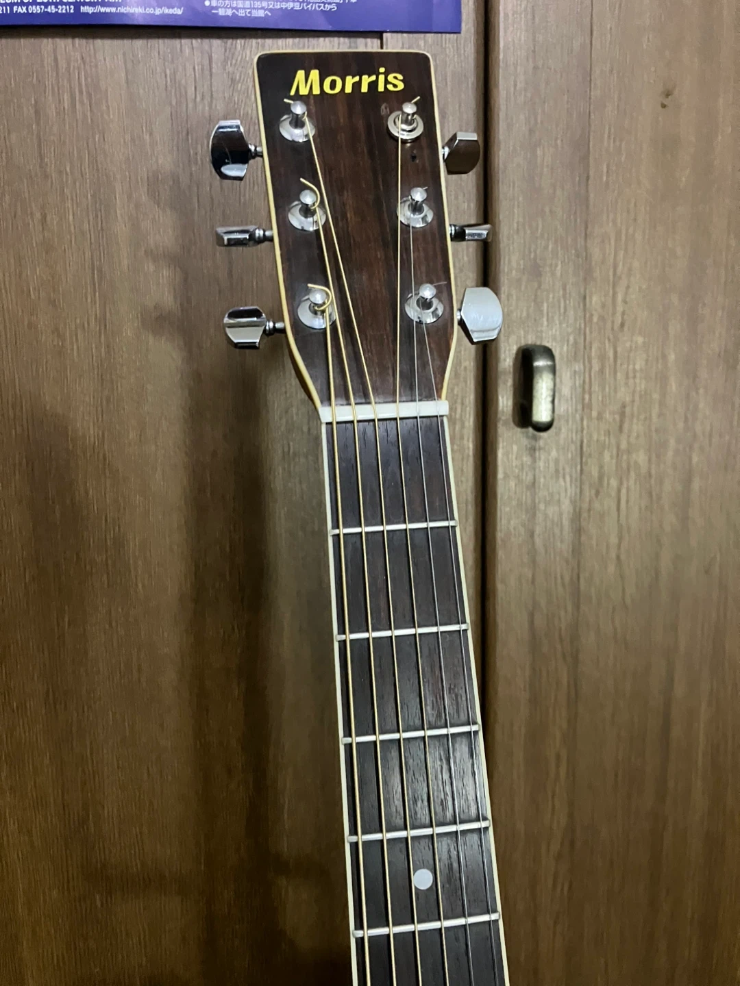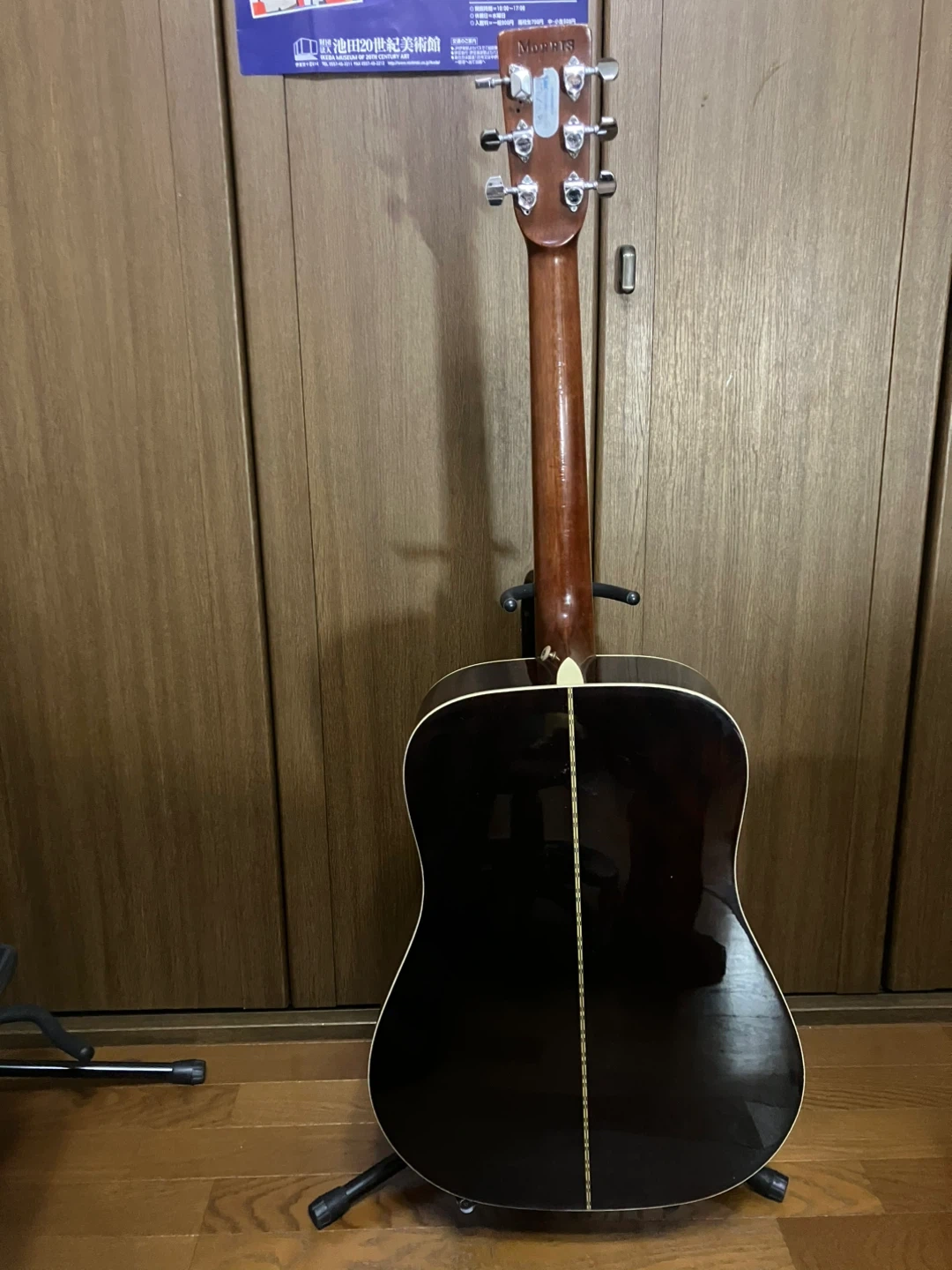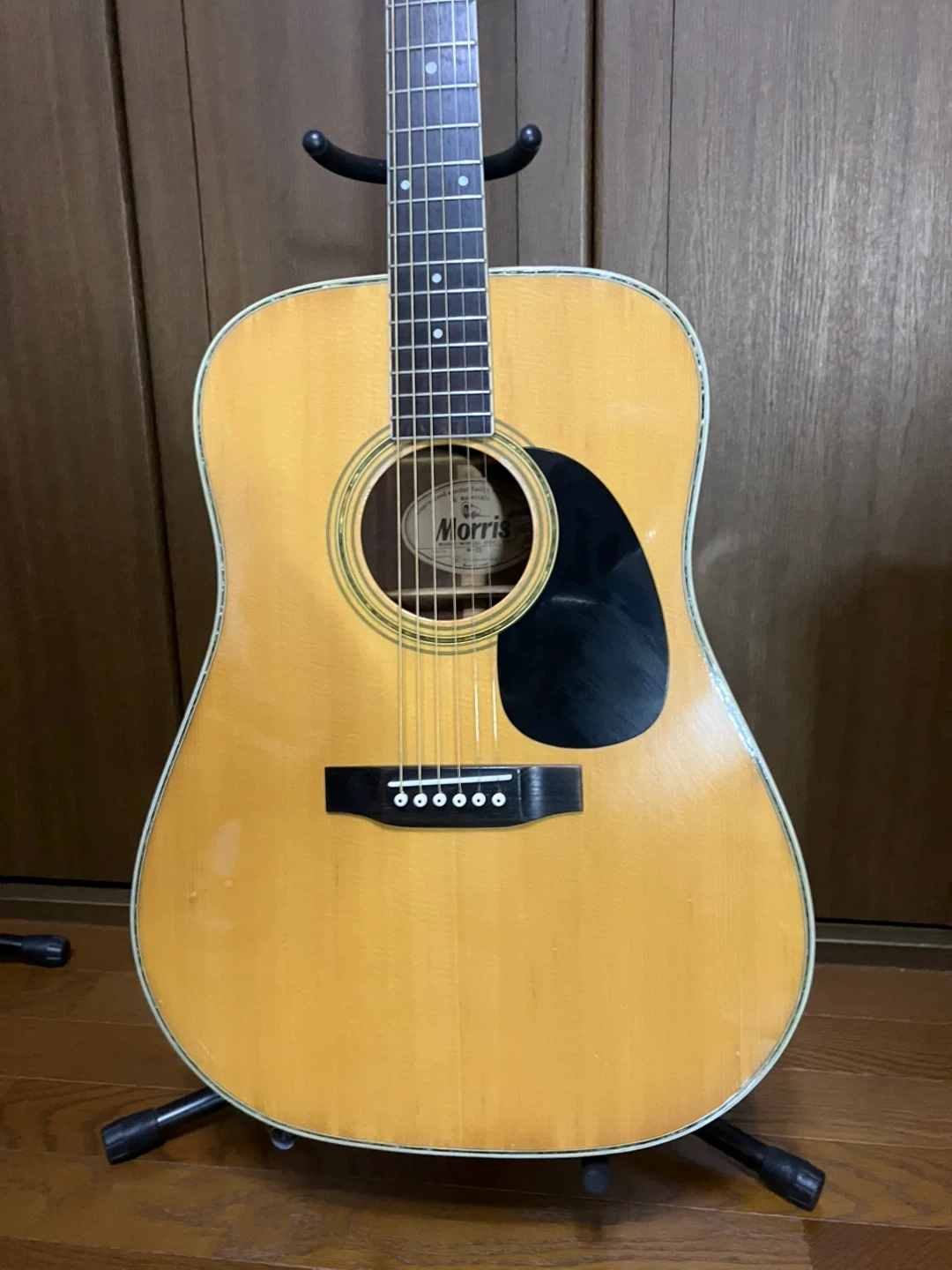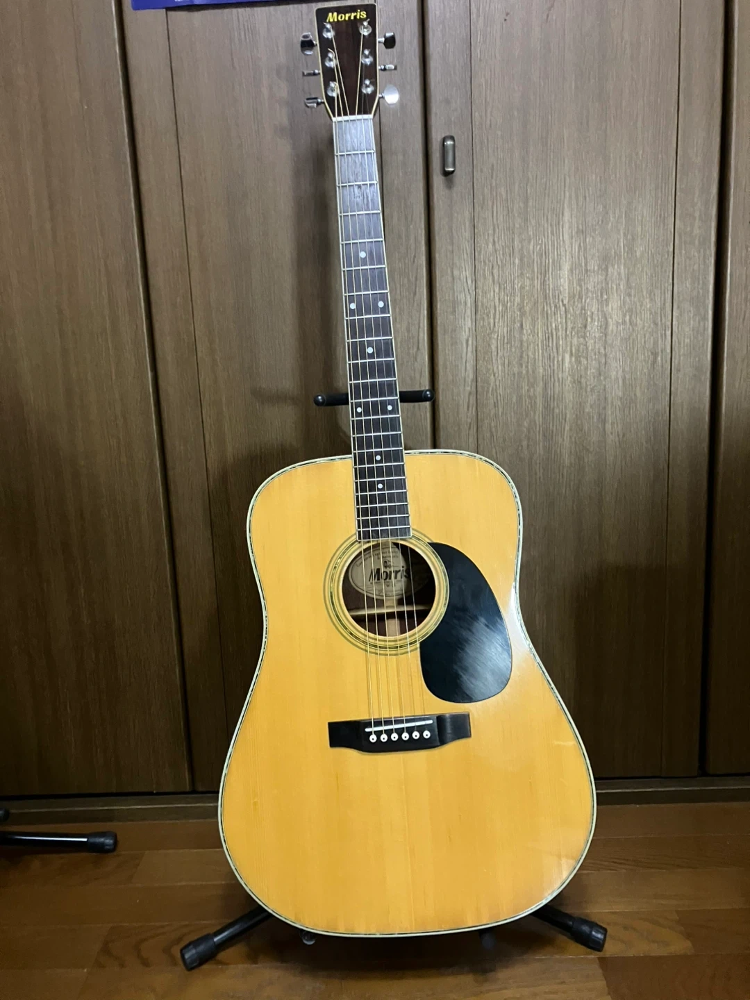 モーリス アコースティックギター W-25 たくさんあるギター工房の中からご覧いただきましてありがとうございます。 ラルクアコースティックギター工房と申します。 こちらのサイトを始め、他のサイトにも少しずつフォークギターとドレッドノートを中心に掲載を始めました。 このモーリスW25 は前期モデルが1974年から79年にかけて製造され、後期モデルは1979年から81年まで製造されました。 ボディースタイルはドレッドノートで、材質はサイドが前期がローズウッドで、後期がオパンコールです。 ネック材はナトーで、指板とブリッジはローズウッドです。 バックは前期がローズウッドで後期がオパンコールです。 ペグはカバータイプのクロームでポジションマークはドットになっています。 カッタウェイ形状は無しです。 各部材に応じたクリーナーやワックスでクリーニングし、フレットやペグも磨き込んであります。 指板の脂質もオレンジオイルで拭き取り、仕上げに10月上旬にマーティンのライトゲージを貼って完了しています。 弾きやすさの目安となるナットの幅が42ミリ、弦高が6弦12フレットで2.5ミリと大変引きやすいコンディションに仕上がっています。 歳を経ていい具合に乾燥した、良く鳴るギターになっています。 初心者の方から中級者の方まで弾きやすい、ドレッドノート特有の音の広がりを楽しんでいただけると思います。 自宅近辺まで取りに来てくださる方限定でお願いいたします。 事前にご連絡をいただければ、曜日問わず11時から18時の間お引き渡しができます。