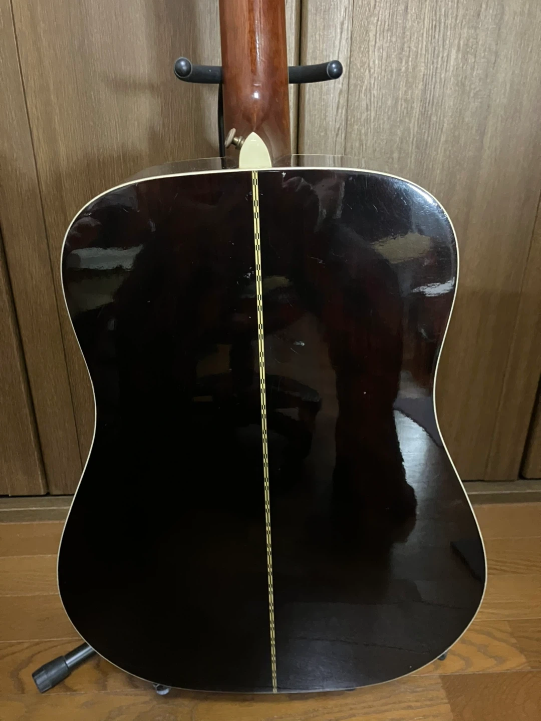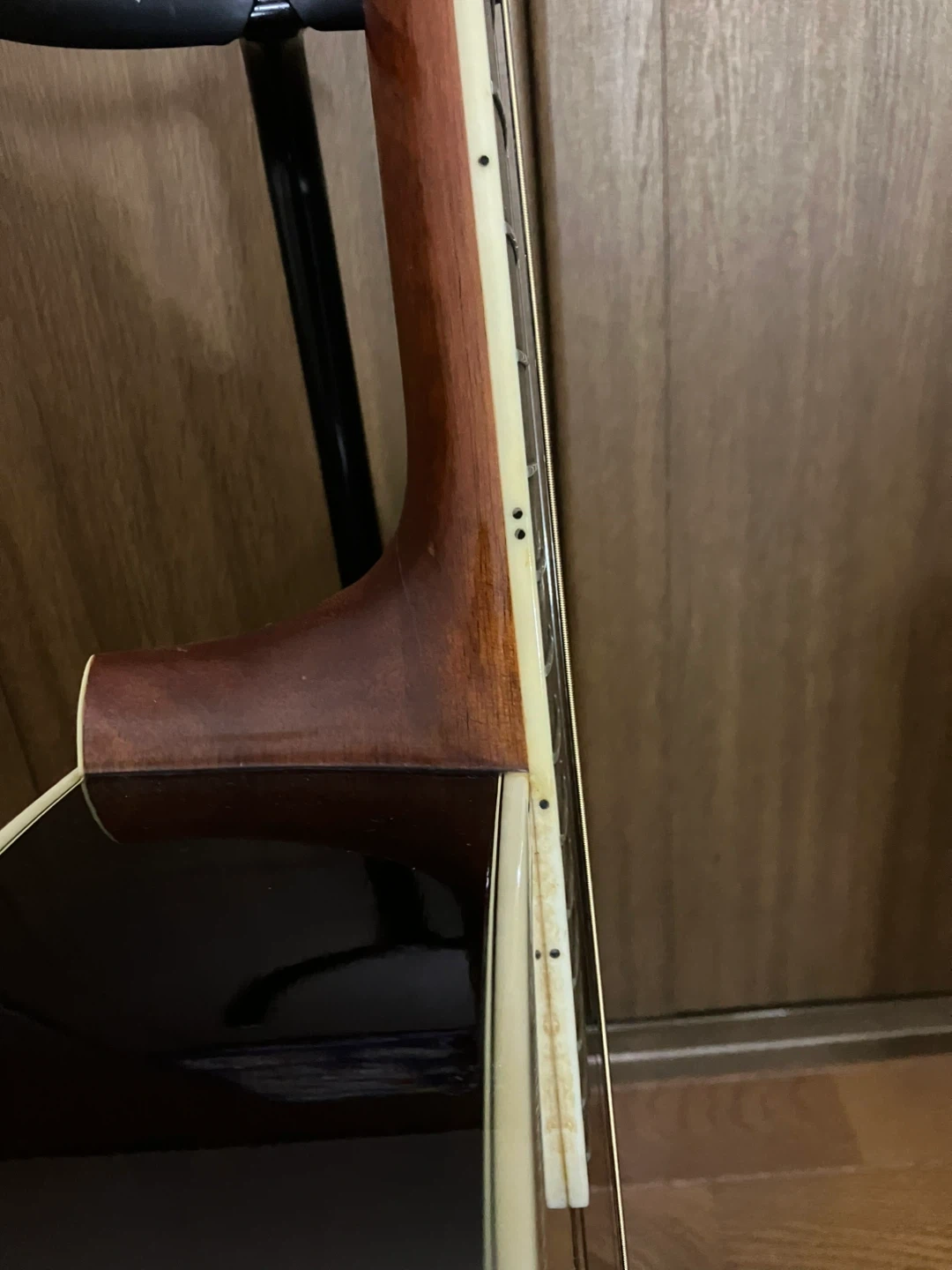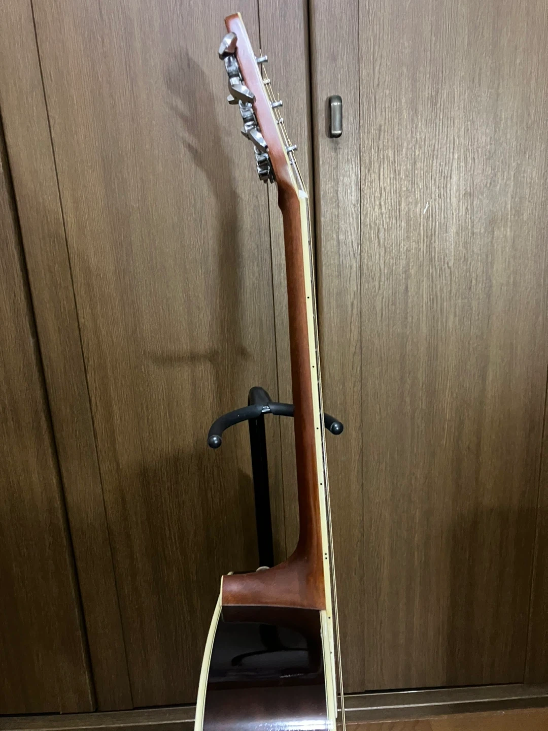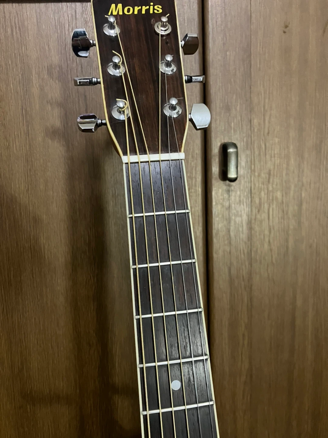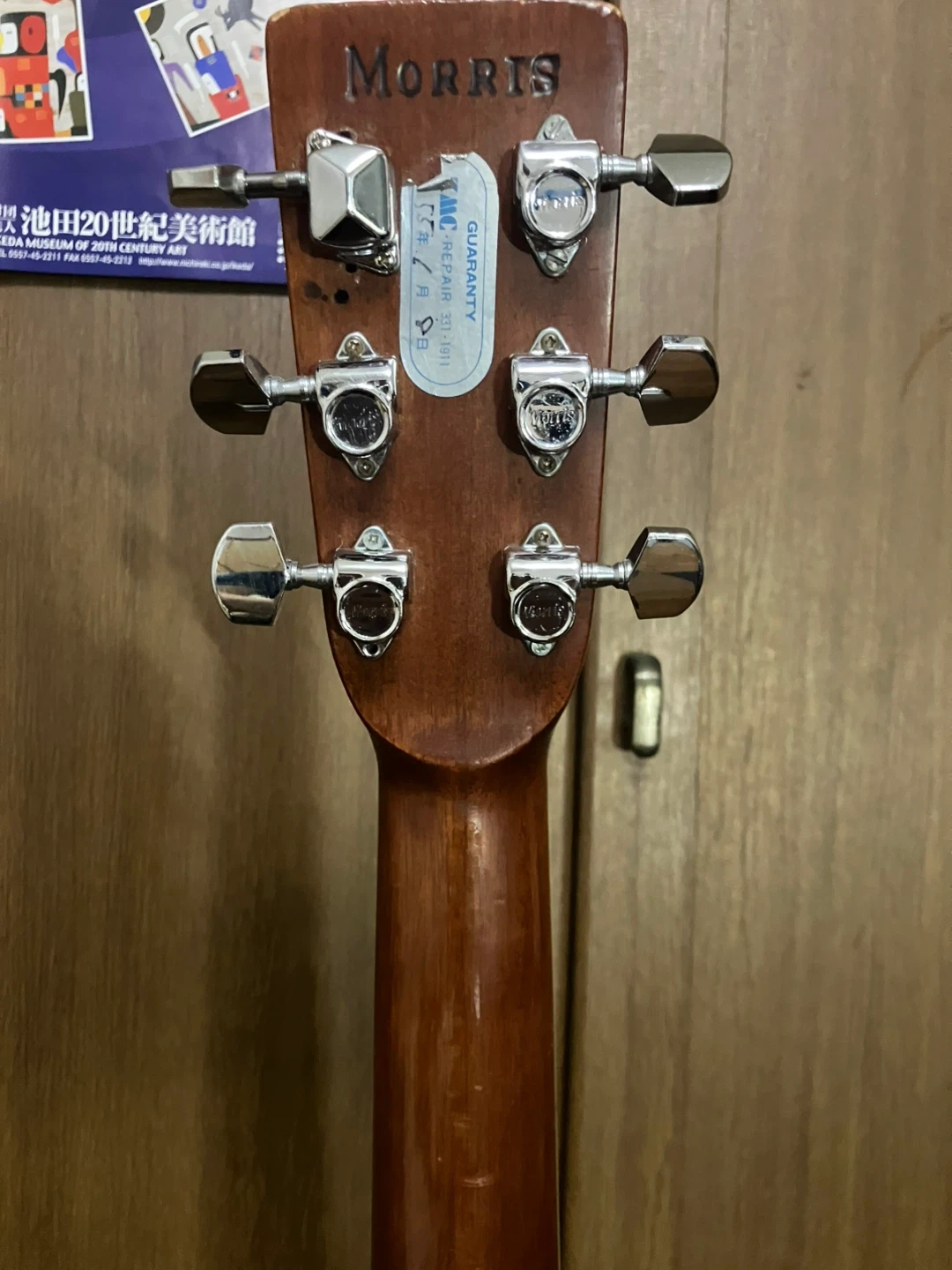 モーリス アコースティックギター W-25 たくさんあるギター工房の中からご覧いただきましてありがとうございます。 ラルクアコースティックギター工房と申します。 こちらのサイトを始め、他のサイトにも少しずつフォークギターとドレッドノートを中心に掲載を始めました。 このモーリスW25 は前期モデルが1974年から79年にかけて製造され、後期モデルは1979年から81年まで製造されました。 ボディースタイルはドレッドノートで、材質はサイドが前期がローズウッドで、後期がオパンコールです。 ネック材はナトーで、指板とブリッジはローズウッドです。 バックは前期がローズウッドで後期がオパンコールです。 ペグはカバータイプのクロームでポジションマークはドットになっています。 カッタウェイ形状は無しです。 各部材に応じたクリーナーやワックスでクリーニングし、フレットやペグも磨き込んであります。 指板の脂質もオレンジオイルで拭き取り、仕上げに10月上旬にマーティンのライトゲージを貼って完了しています。 弾きやすさの目安となるナットの幅が42ミリ、弦高が6弦12フレットで2.5ミリと大変引きやすいコンディションに仕上がっています。 歳を経ていい具合に乾燥した、良く鳴るギターになっています。 初心者の方から中級者の方まで弾きやすい、ドレッドノート特有の音の広がりを楽しんでいただけると思います。 自宅近辺まで取りに来てくださる方限定でお願いいたします。 事前にご連絡をいただければ、曜日問わず11時から18時の間お引き渡しができます。