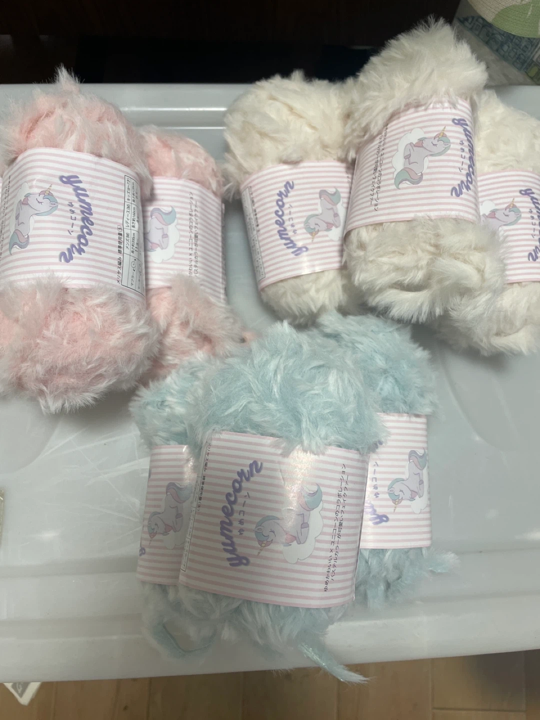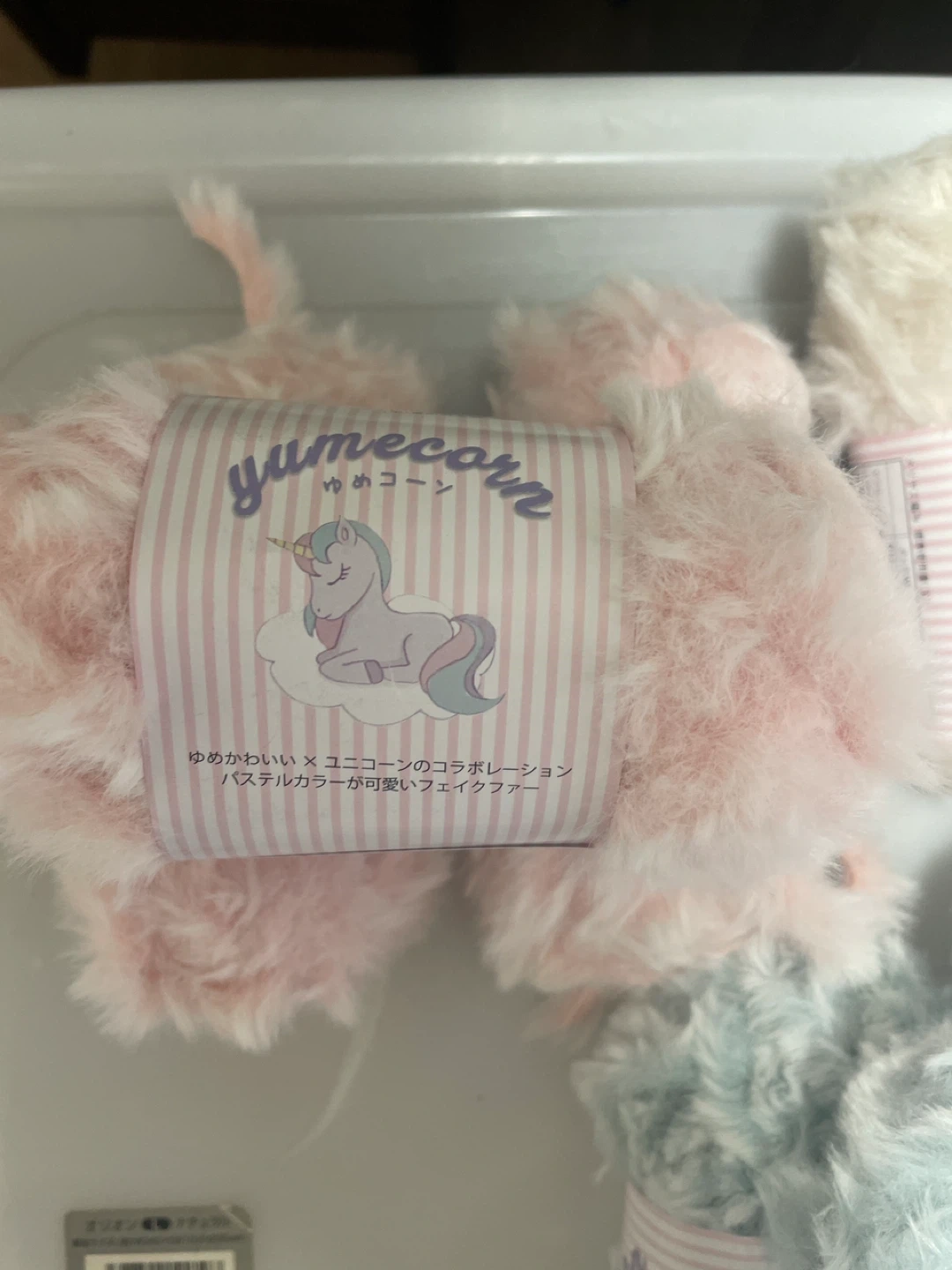 ユメコーンの毛糸セットです ・カラー:ピンク、ホワイト、ブルー ・素材:ポリエステル100% ・重量:約20g(1玉あたり) ピンク✖️3 水色✖️3 白(薄いベージュ)✖️3 全部で9個あります