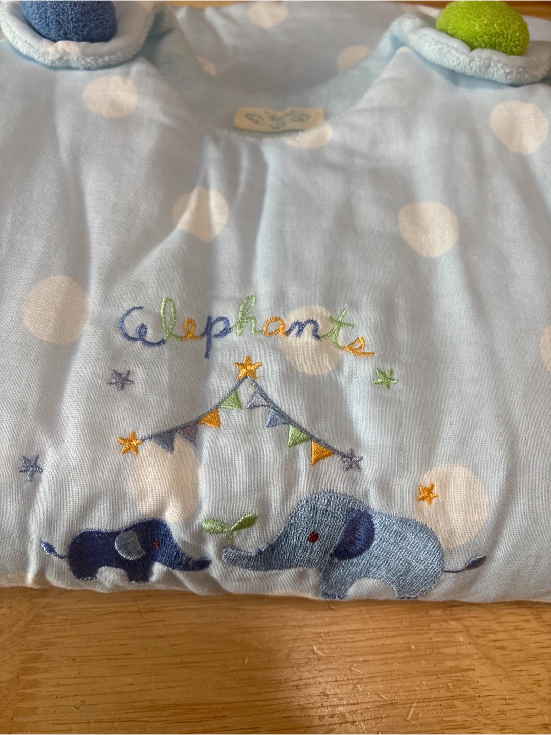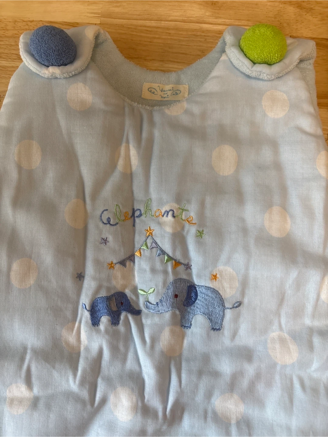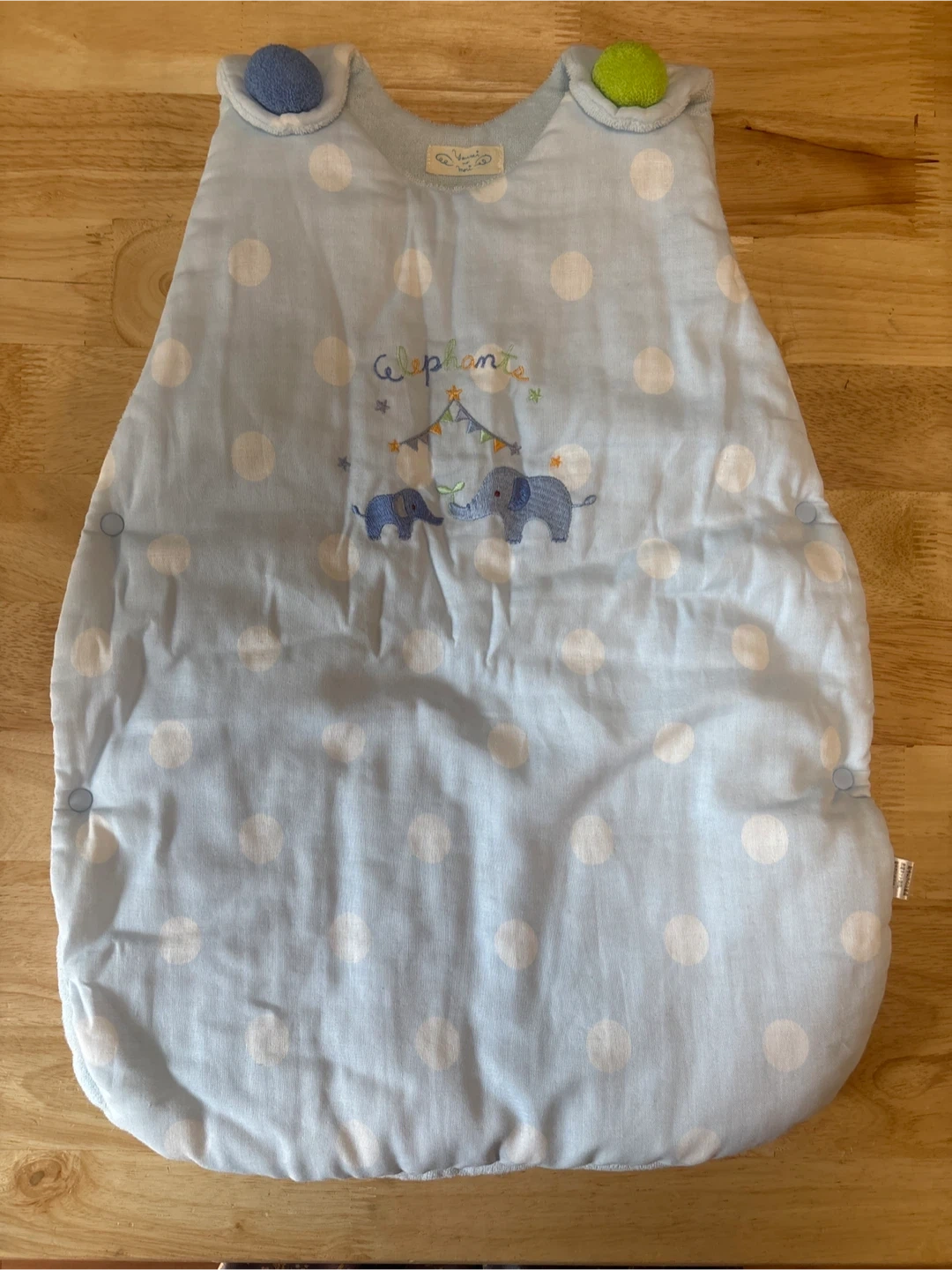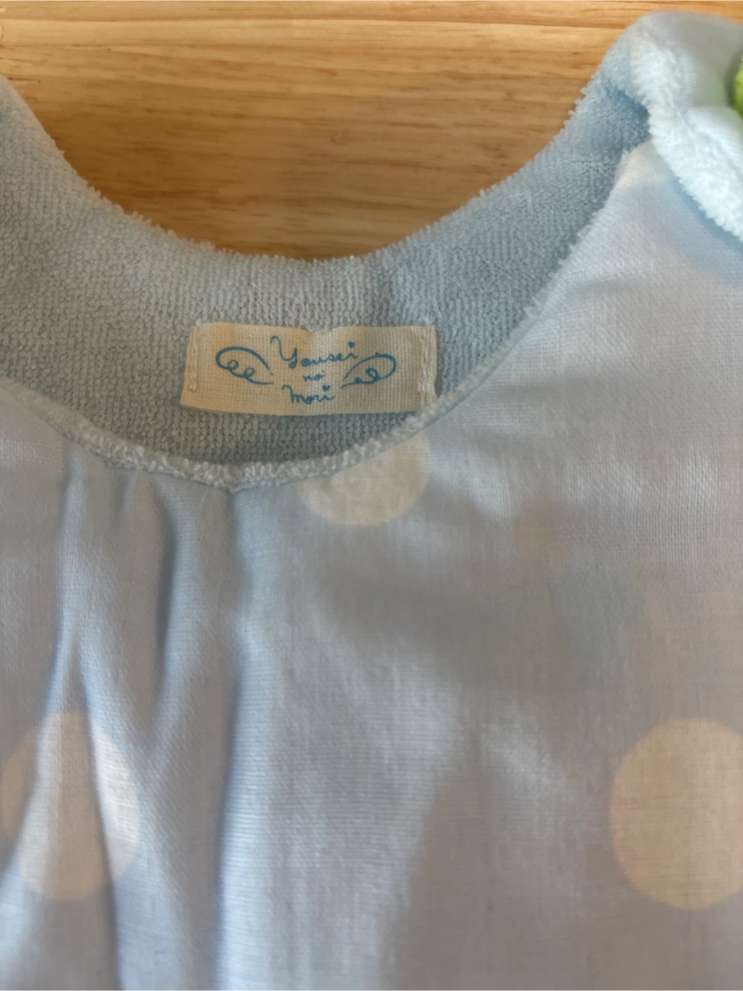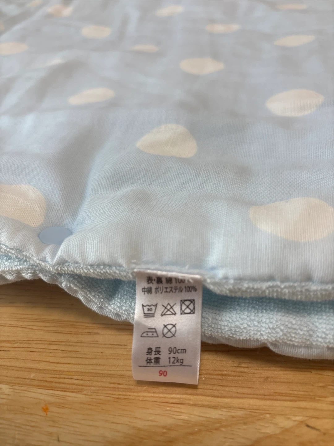 ヨウセイノモリのスリーパーです ・ブランド:ヨウセイノモリ ・サイズ:90cm ・色:水色、白ドット柄 ・象の刺繍あり ・素材:綿、ポリエステル(中綿) ・対象体重:12kg ・使用感少なめ ※使用せず、自宅保管です (たたみじわ有り)