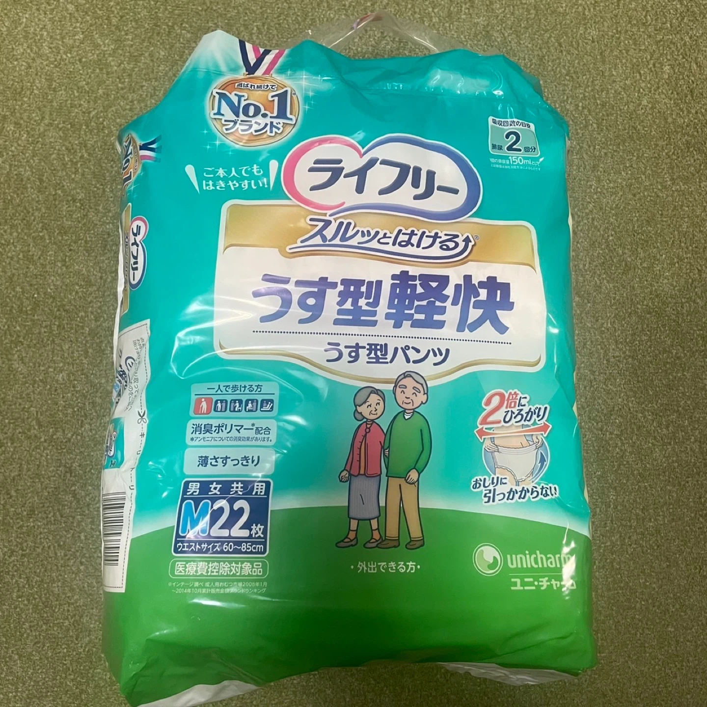 ライフリーのうす型軽快パンツMサイズです 【情報】 ブランド:ライフリー 種類:うす型軽快パンツ サイズ:M(ウエスト60〜85cm) 枚数:22枚 【状態】 新品未開封 自宅で使用する予定でしたが、 介護施設に入所した為、 使って頂ける方にお譲りいたします。 ※衛生品のため返品不可 ※自宅保管にご理解のある方で  ご検討お願い致します。