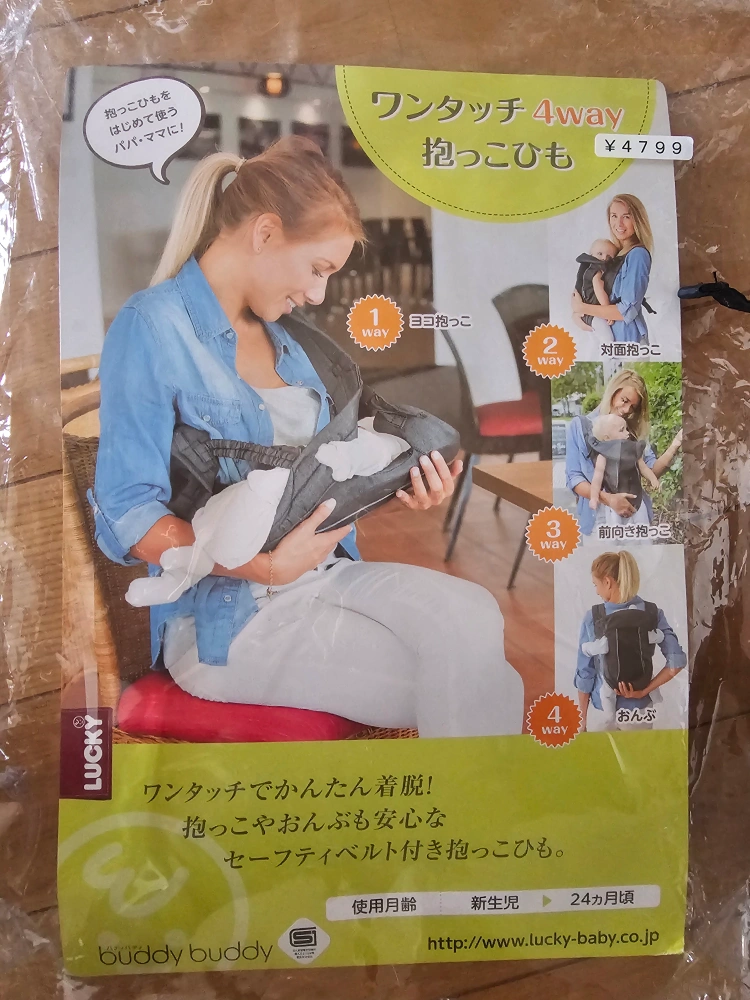 ラッキー バディバディの抱っこひもです ・ブランド:ラッキー buddy buddy ・色:ネイビー ・対象月齢:新生児〜24ヶ月頃 ・4wayタイプ ・ワンタッチで装着可能 ・定価は4799円でした ・使用感少なめ 中古品であることご了承ください