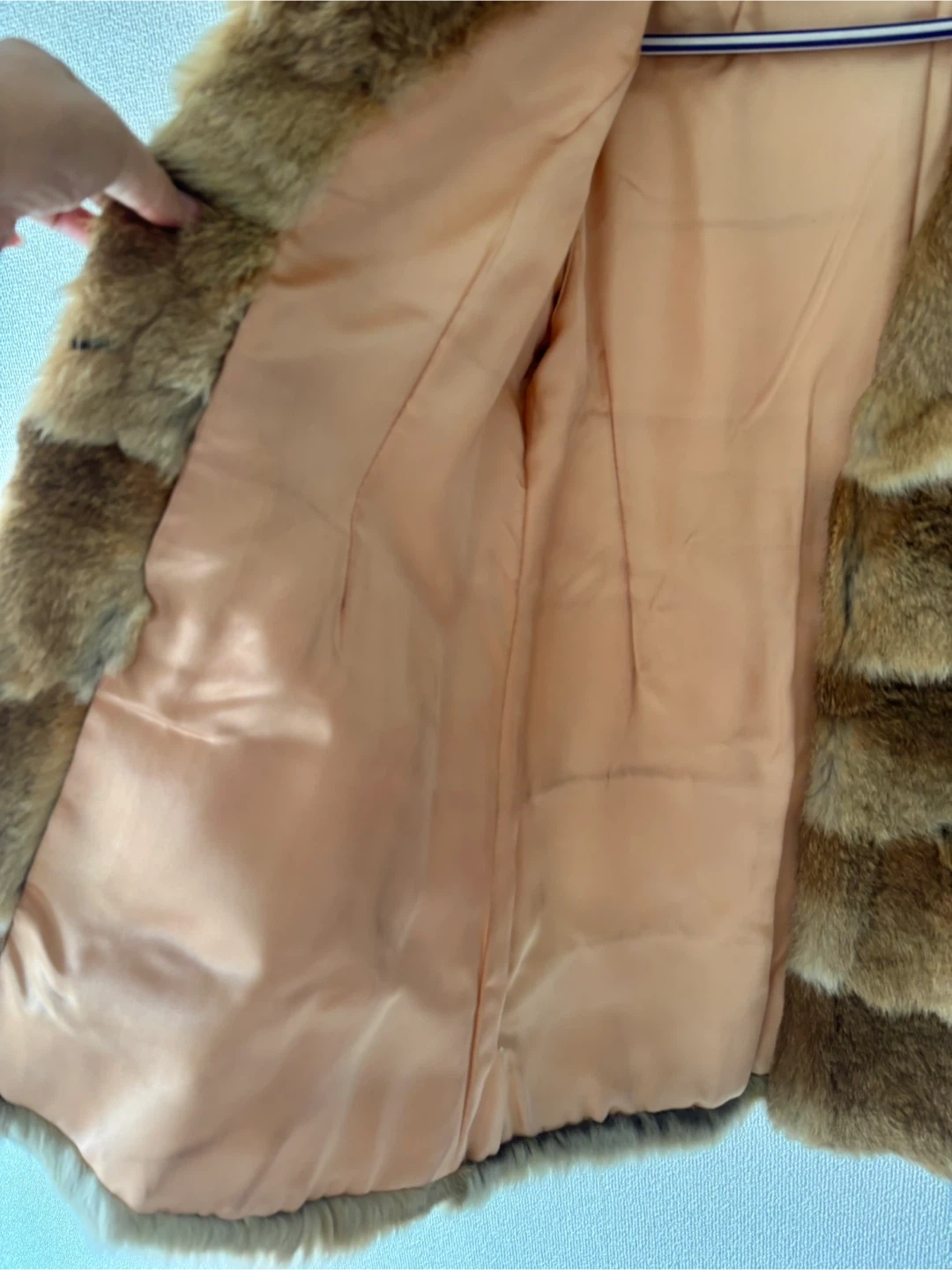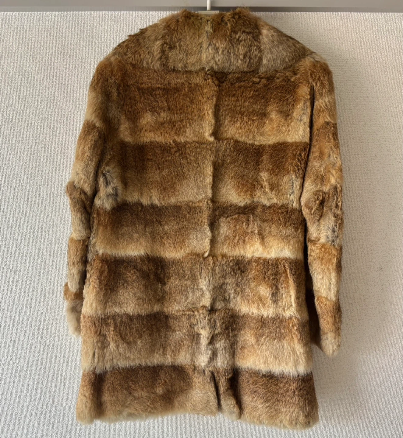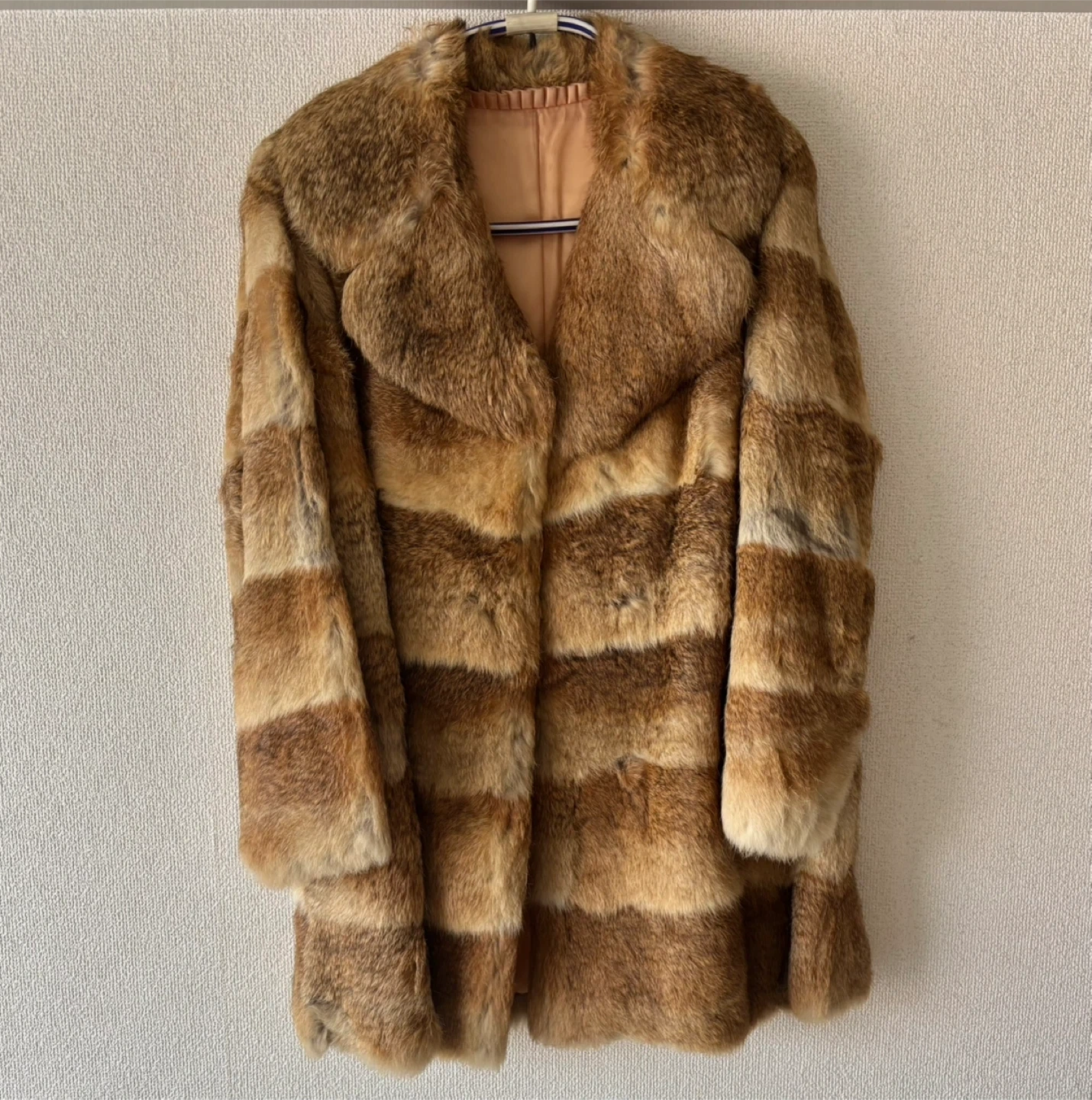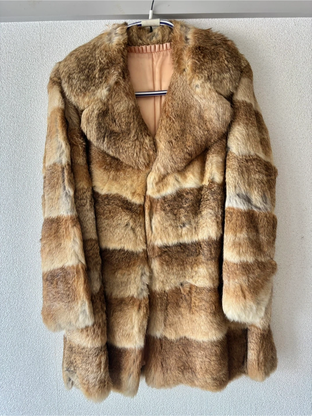 ベージュ系のストライプパターン毛皮ロングコート、サテン裏地付き。 クローゼットにしまい込まれたままでした。 酷い難は見当たらないかとおもいますが、長い時間の自宅保管品、中古品になります。 ご理解ある方にお譲りします。 だいたいのサイズ 身幅 約48cm位 着丈 約74cm位 素人採寸です。 - 色: ベージュ系 - 素材: 毛皮 - 裏地: サテン素材 - デザイン: ボーダーパターン - スタイル: ショートコート ご覧いただきありがとうございます。 #うさぎ #兎 #ラビットファー #ショートコート #毛皮 #ファッション #コート #ジャケット