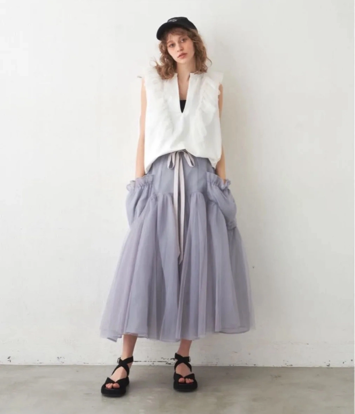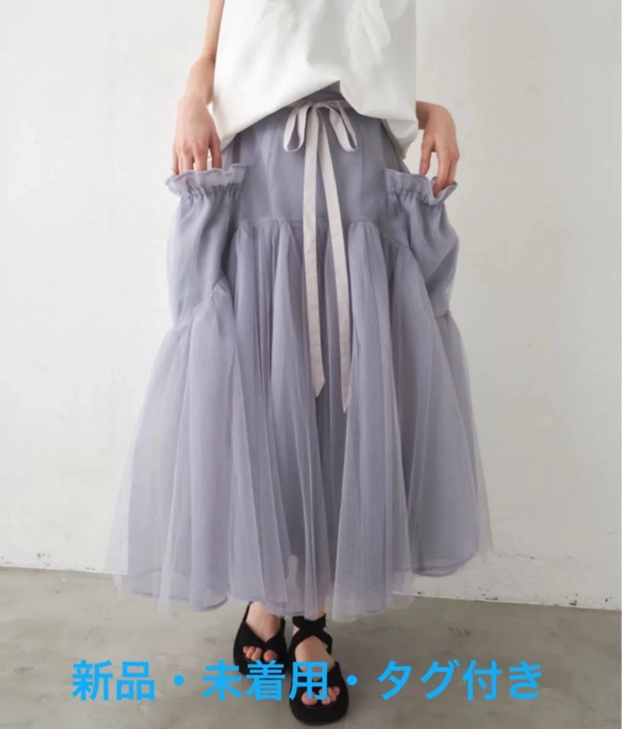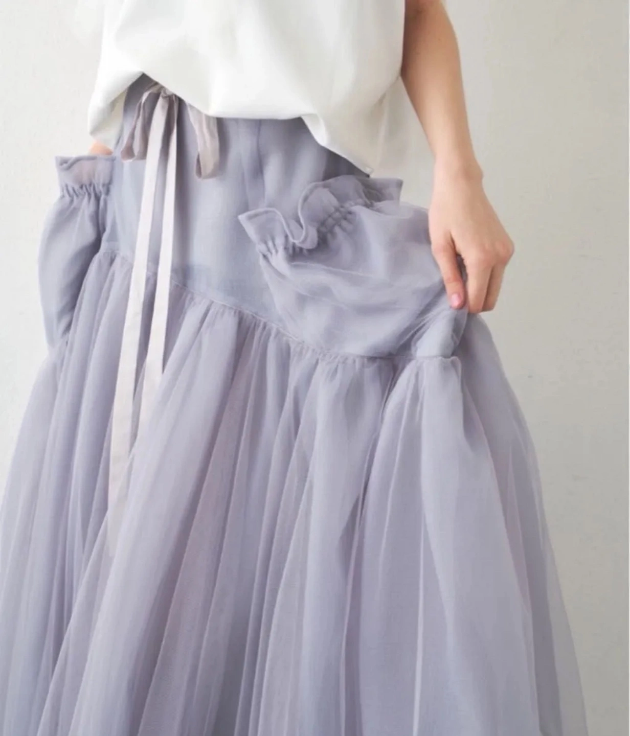 ラベルエチュード Belle スカート お色・パープル 人気完売品 【新品・未着用・タグ付き】 マデザインポイント ワッシャー加工されたオーガンジー生地を贅沢に使用。 今季注目のユーティリティポケットデザインでデザイン性はもちろんのこと、実用性にも溢れています。 オーガンジーだけでも、チュールだけでも出せない絶妙なボリ ューム感、LA BELLE ETUDEらしい生地使いがポイントです。 人気なライトパープル、大人な落ち着きのあるネイビー、スモーキーなカーキの3色展開。 ディティールポイント ウエスト部分にはぐるりとフリルを施し、トップスインしたときに程よくアクセント。 目を惹くのは両サイドの大きなポケット。 トレンドのユーティリティーポケットをLA BELLE ETUDEに落とし込みギャザーたっぷりなフリルとカジュアルライクな仕上がりが高バランス。 切替はローウエストで、ウエスト〜ヒップまわりのボリュームを抑えつつフロントの切替はラウンドさせることで、大人なフレアラインを作成しました。 付属のサテンリボンは取り外しが可能◎ 外したり、結び位置を変えたりとアレンジして幅広い雰囲気で着用いただけます。 透け感:なし 生地の厚さ:普通 裏地:あり 伸縮性:なし