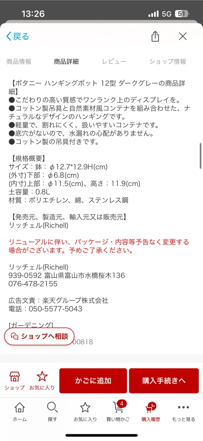 リッチェルのハンギングポットです 【情報】 ブランド:リッチェル 商品名:ボタニー ハンギングポット 12型 ダークグレー サイズ:鉢 Φ12.7*12.9H(cm) 容量:0.8L 素材:ポリエチレン、綿、ステンレス鋼 中古品であることご了承ください