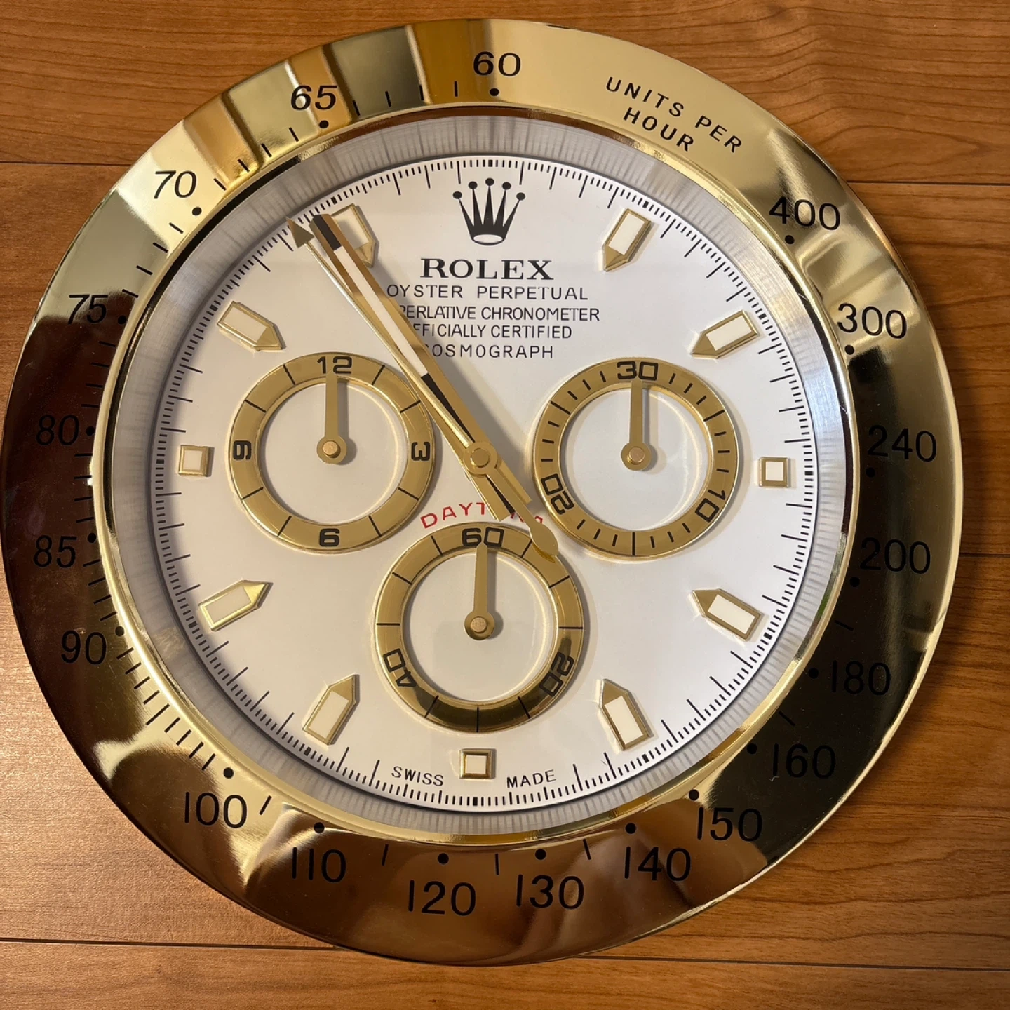 ロレックスコスモグラフデイトナ壁掛け時計販促品です  ゴールドにホワイトの文字盤がオシャレな高級感ある掛け時計です  ぜひこの機会にご購入ご検討ください  動作確認の為一度開封してあります