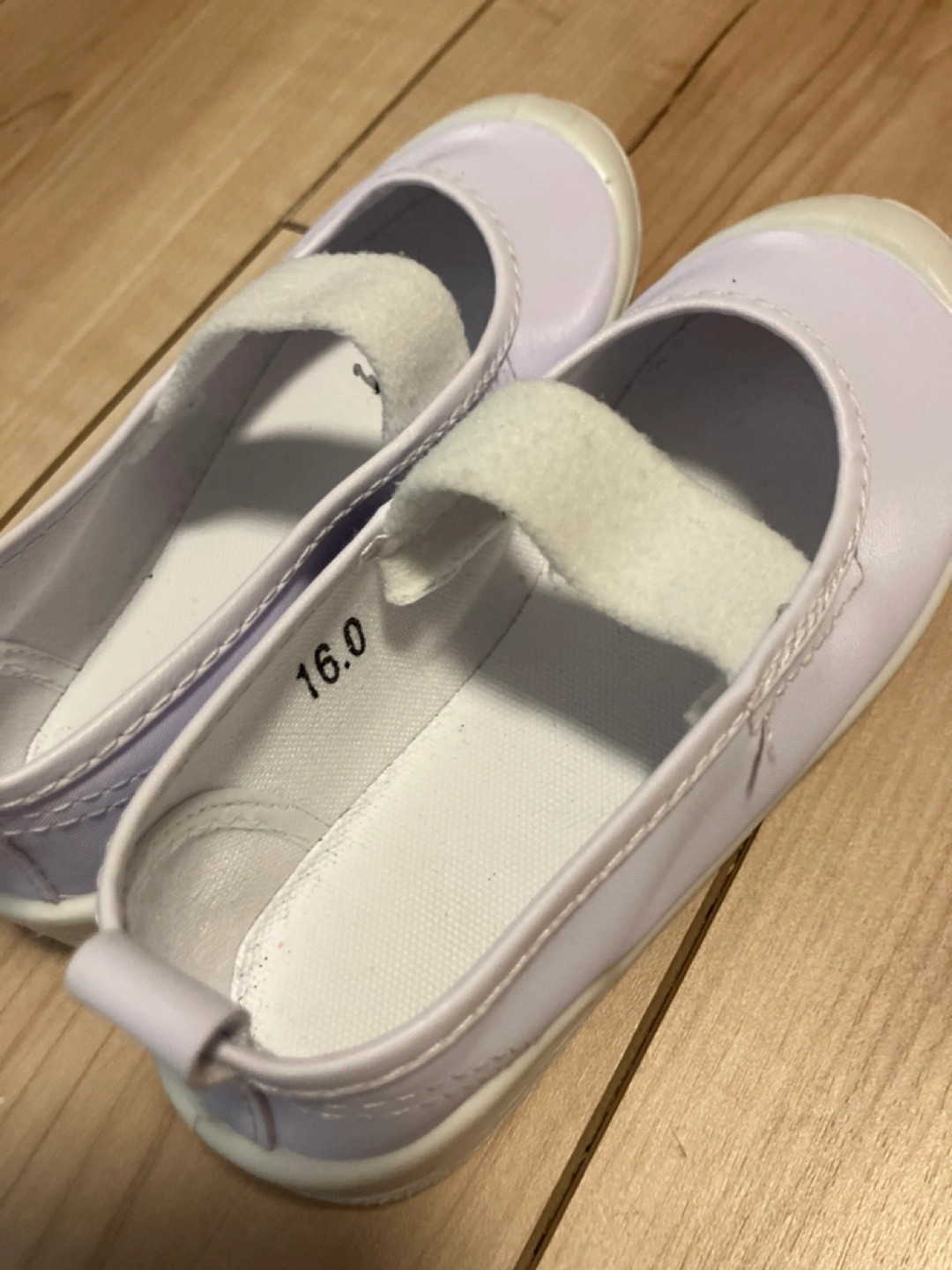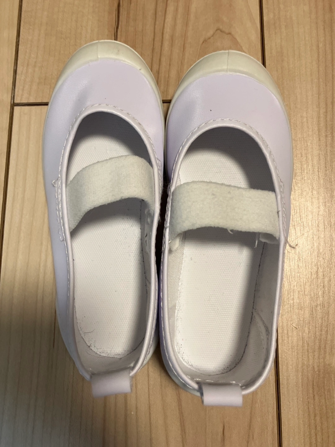 週1回プレ幼稚園の際に履きました。 汚れがつきにくいビニール素材です。 靴底に記名があるので消してお渡しします。