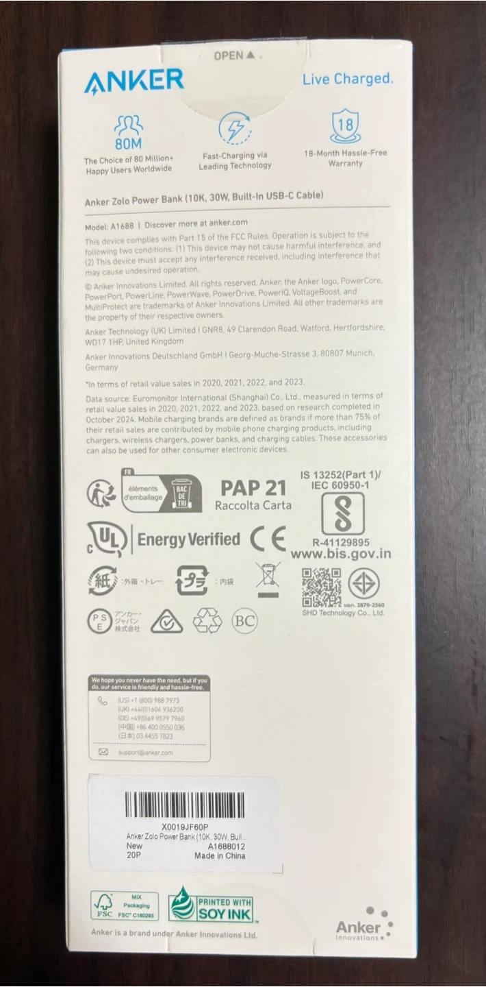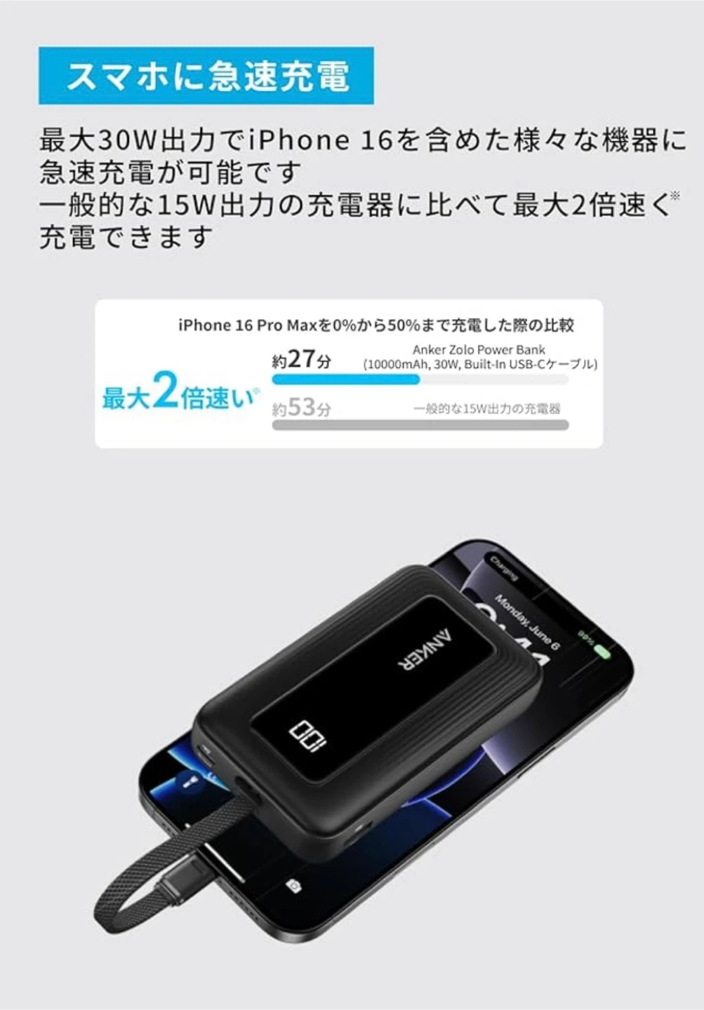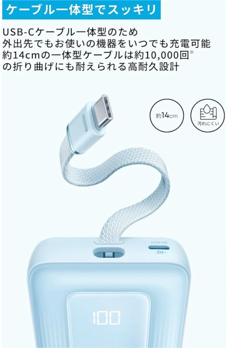 【中古品・未使用に近い・美品】 アンカー モバイルバッテリー(10000mAh 最大30W出力 USB-C ケーブル一体型)