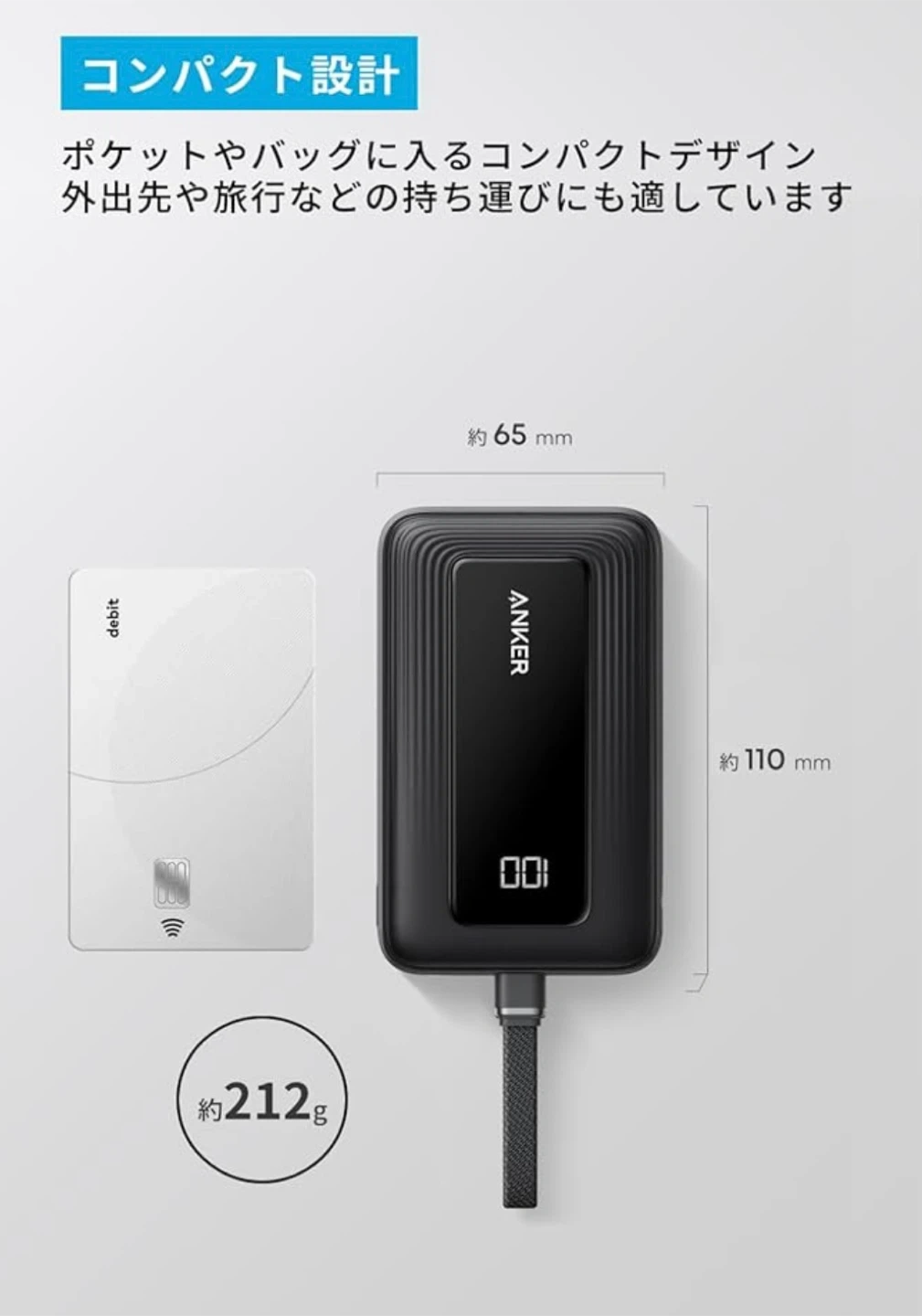 【中古品・ほとんど未使用に近い・美品】 アンカー モバイルバッテリー10000mAh 最大30W出力 USB-C ケーブル一体型 ディスプレイ搭載) 2025年5月に購入し、3回ほど使用しましたが、もっと大きな充電器に買い替えの為、処分致します。 ご近所まで、できるだけ早く取りに来て頂けるくれる方を優先させていただきます。 よろしくおねがいします。 商品の詳細: ブランド Anker 色 ブラック 商品の重量 212 グラム 商品の寸法 11長さ x 6.5幅 x 2.5厚み cm ポート数 3 スマホに急速充電:最大30W出力でiPhone 16を含めた様々な機器に急速充電が可能 ※バッテリーの残量表示が便利です。 ※一般的な15W出力の充電器に比べて最大2倍速く充電できます。 ※一般的な15W出力の充電器でiPhone 16 Pro Maxを0%から50%まで充電した場合との比較(Anker調べ) ※ケーブル一体型で、荷物がスッキリ ※ USB-Cケーブル一体型のため、外出先でもお使いの機器をいつでも充電可能です。 ※約14cmの一体型ケーブルは約10,000回の折り曲げにも耐えられる優れた耐久性を実現しました。(Anker調べ) ※コンパクトサイズかつ安心の大容量 ※片手に収まるコンパクトサイズで仕事や旅行などの持ち運び用に最適です。 ※ 10000mAhの大容量でiPhone 16を約2回の充電が可能です。(Anker調べ) ※最大20Wでの入力にも対応:一体型ケーブルは出力だけでなく、最大20Wでの入力にも対応可能です。 ※約2.5時間 でバッテリー本体に満充電が可能です。 ※20W出力のUSB急速充電器を使用して充電した場合(Anker調べ) パッケージ内容:Anker Zolo Power Bank (10000mAh, 30W, Built-In USB-Cケーブル)、取扱説明書、箱付き