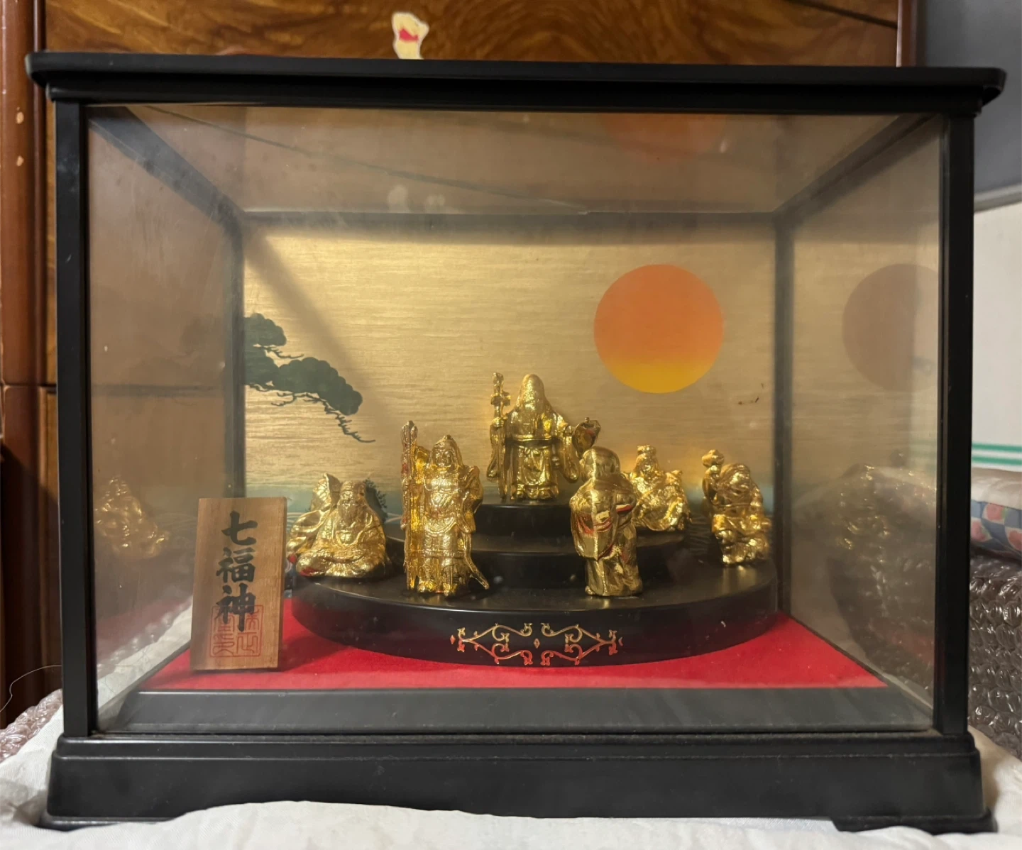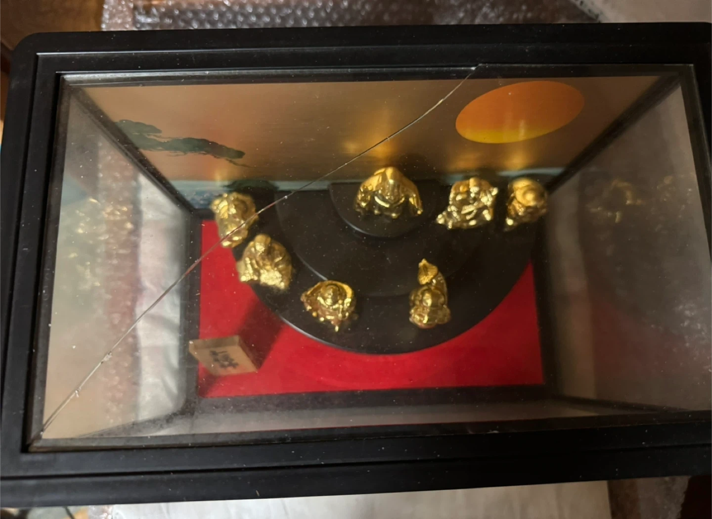七福神の置物、ガラスケース入りです。 ・七福神の置物 ・ガラスケース入り ・色:ゴールド ・天井部分のガラスに割れあり 木札と 下段の左から2番目は 粘着がなく 固定されていません。 中古品であることご了承ください