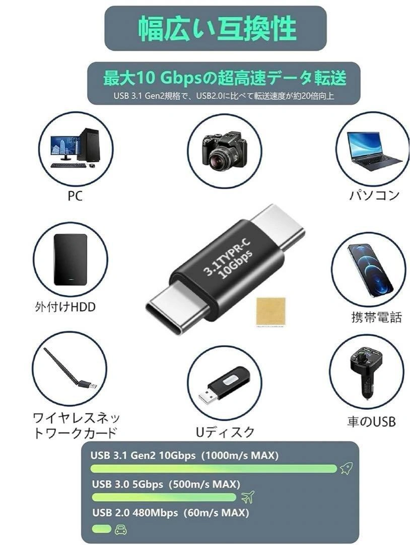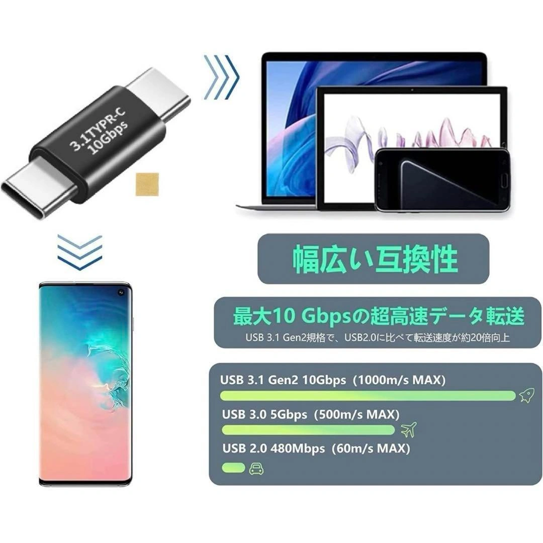 USB type C オスからメスに変換するアダプタです。ケーブルの抜き差しが便利になります。 また、ケーブルの折曲げや断線を効果的に防止できます。 超高速データ転送:最大10Gbps(※理論値)の通信速度で、USB2.0に比べて転送速度が20倍向上しました。また、既存のUSB2.0/1.0規格とも互換性があります。 上下区別なく、向きを気にせず挿せます。充電、データ転送、OTG、オーディオ 、HDMI/VGAビデオ転送など元type c端末が対応できる機能は、当アダプタを通しても性能低下せずに完璧に実現できます。 USB type C端子を搭載したパソコン、タブレット、スマホ等に対応可能です。 Macbook(Pro)、Surface Book 2、Wacomワコム、Oculus Link、Switch、Samsung Note 8、Galaxy S9 / S9 Plus、Google Nexus 5X / 6P、Pixel C、Pixel 2、Pixel 2 XL、HTC 10、LG G5 G6、 LG V20、Lumia 950 / 950XL、OnePlus 2/3 / 3T / 5、Moto G5 Plus、Moto Z、LG V20、Lenovo Zuk Z1、ASUS Zenpad 3s 10、ASUS ZenPad S 8.0、Nokia N1などのデバイスに適用、優れた互換性です。 ご希望の方はお気軽にご連絡ください。