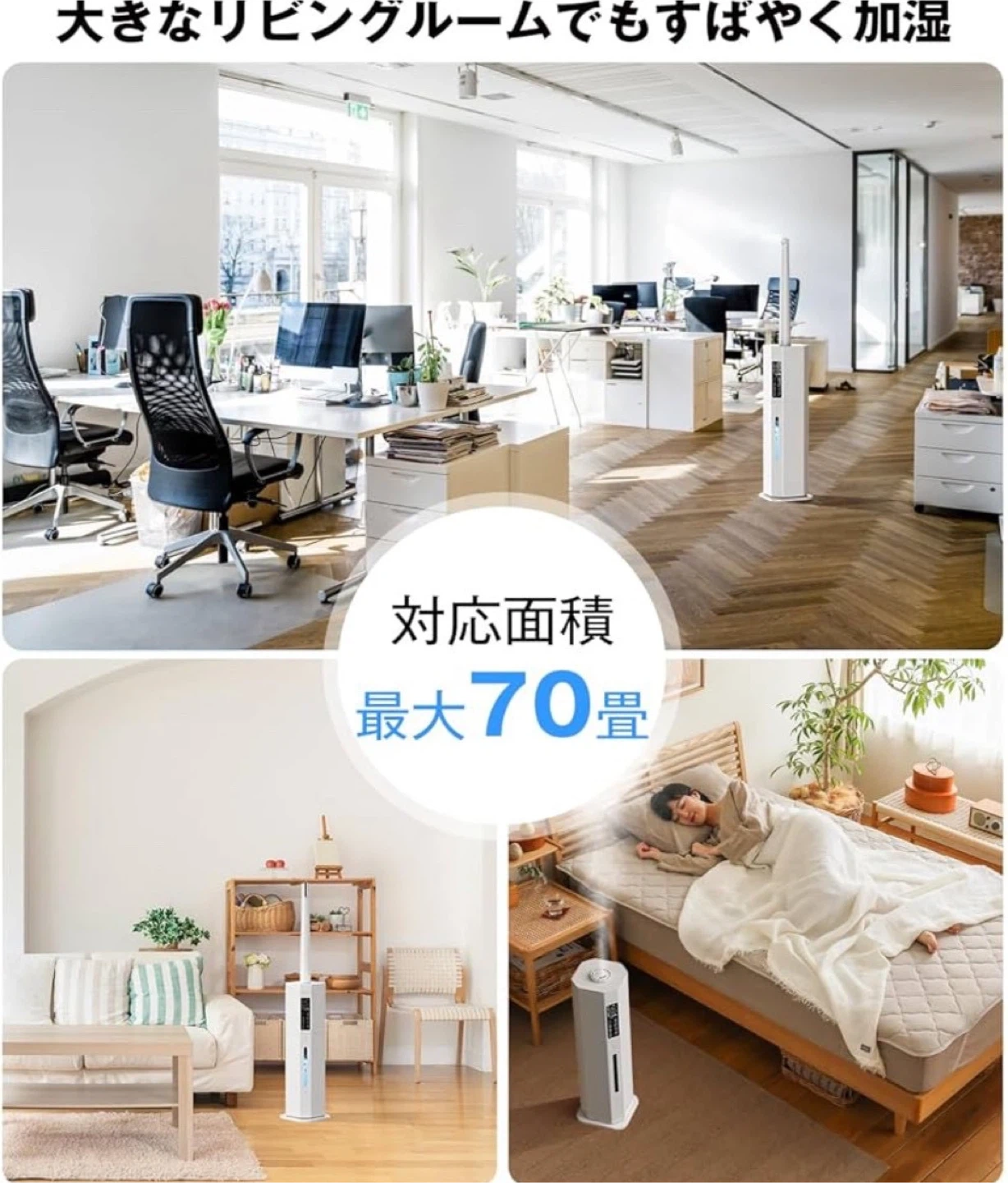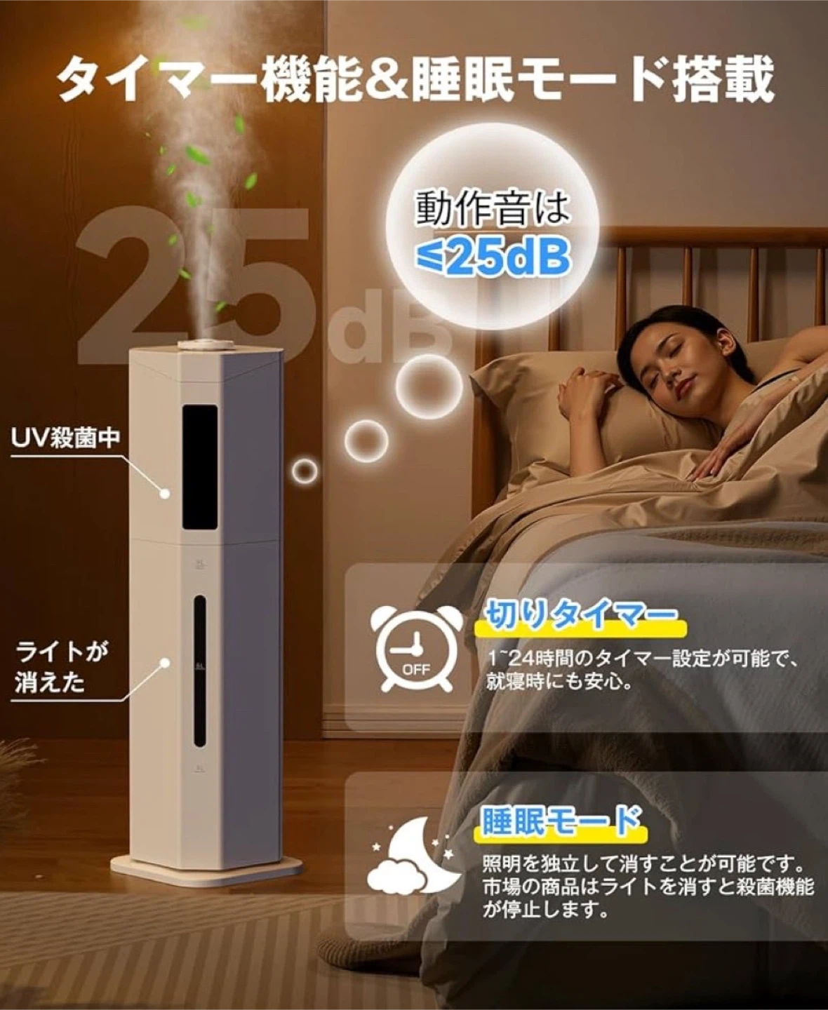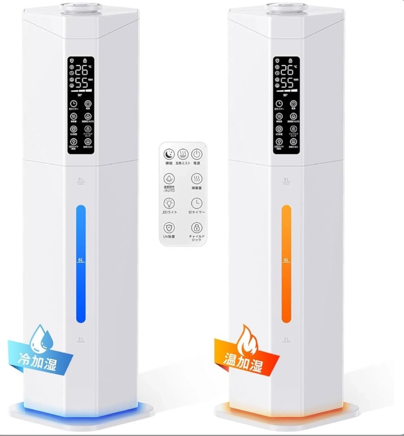 数ある中からご覧頂きありがとうございます(^○^) ◎値下げ交渉◎ ◎コメントなし、即購入大歓迎 ◎送料無料!安心の匿名配送 *。*。 \1品限り!!早い者勝ち!!/ ★商品説明★ 【加熱超音波・ハイブリッド式加湿器&9L超大容量】 加熱ミスト機能を搭載し、部屋の湿度や温度に応じて温加湿と冷加湿を選べるハイブリッド加湿器です。 加湿力が向上し、通常の超音波式加湿器よりも加湿スピードが48%速くなります。 9Lの超大容量タンクで、1回の給水で最長45時間の連続運転が可能。 【ミスト量3段階調節&自由な湿度設定&恒湿機能】 ミスト量を3段階に調整でき、さらに湿度を45%~95%の範囲で自由に設定可能です。部屋の広さや好みに合わせて加湿量を簡単に調整でき、内部に搭載された湿度センサーと温度センサーが設定した湿度に達すると自動的に加湿を停止するため、過加湿の心配はありません。14畳までのお部屋に対応しています。 【2025進化モデル・おまかせAUTOモード】AUTOモードでは、室内湿度を自動で感知し、 シーンに合わせて最適運転に切り替え! 湿度が73%以下になると自動で再運転。常にベストな湿度をキープ。 【タイマー機能&お休みモード搭載】 タイマー設定が可能で、パネルの消灯ができる睡眠モードも搭載されています。就寝時には便利です。30dB以下の超静音設計を実現。 【多重除菌・清潔な加湿を実現】 衛生的で安全な加湿環境を提供するために、多重除菌機能を搭載しています。 ①UVライトが水中の細菌やウイルスを効果的に除去し、清潔なミストを生成します。 ②銀イオンの抗菌効果により、細菌の繁殖を抑制します。 ③次亜塩素酸水に対応除菌効果が強化されています。 ④水の触れるパーツには抗菌素材を使用。加湿器内部の衛生を簡単に維持。 ⑤高温殺菌機能も搭載、水を加熱することで徹底的な除菌を実現します。 【リモコン付き&便利な上給水方式】 リモコンとタッチパネルの2つの操作方法を備えてます。便利な2WAYの上給水タイプなので、上からそのまま給水できるほか、本体を外して直接タンクに給水することもできます。手を入れて簡単に内部までお掃除ができます。 誤操作を防ぐチャイルドロック機能が搭載されており、お子様やペットのいるご家庭でも安心です。