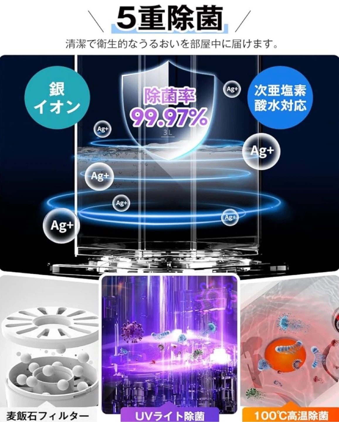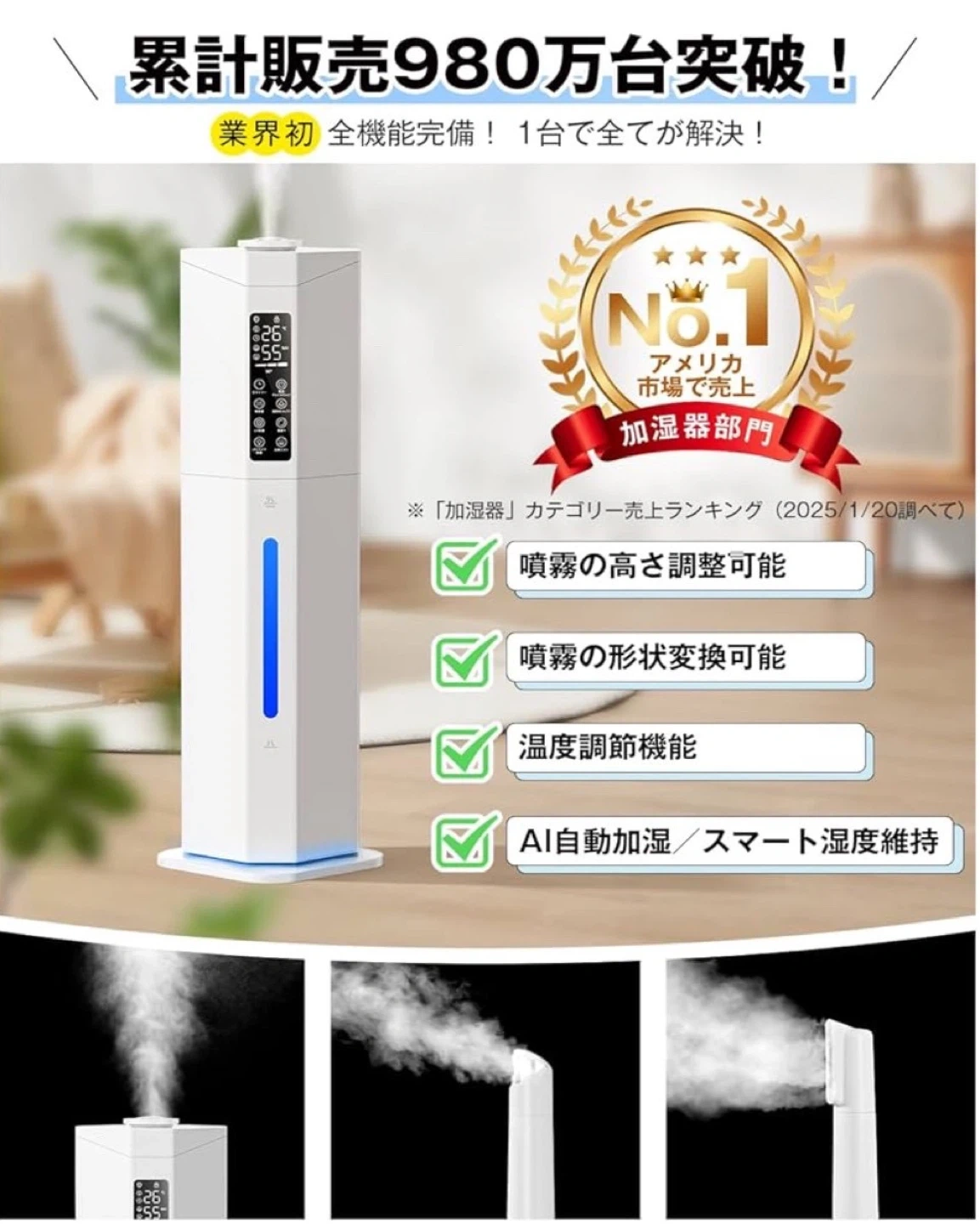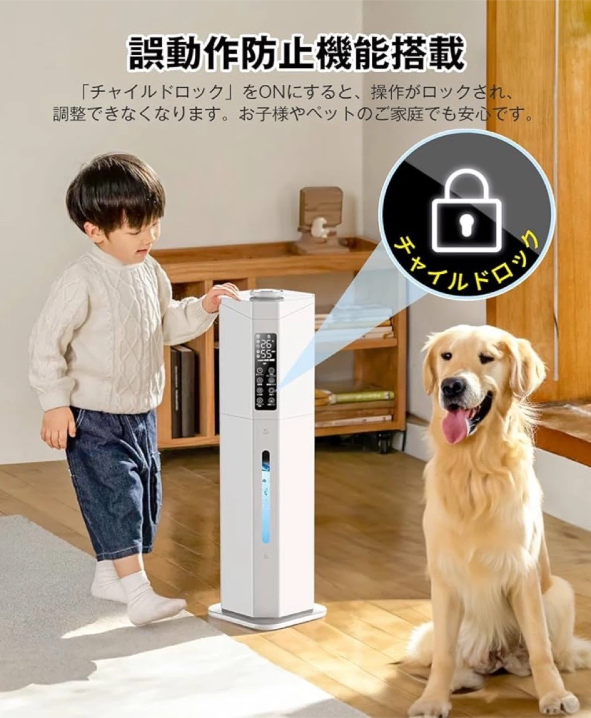 数ある中からご覧頂きありがとうございます(^○^) ◎値下げ交渉◎ ◎コメントなし、即購入大歓迎 ◎送料無料!安心の匿名配送 *。*。 \1品限り!!早い者勝ち!!/ ★商品説明★ 【加熱超音波・ハイブリッド式加湿器&9L超大容量】 加熱ミスト機能を搭載し、部屋の湿度や温度に応じて温加湿と冷加湿を選べるハイブリッド加湿器です。 加湿力が向上し、通常の超音波式加湿器よりも加湿スピードが48%速くなります。 9Lの超大容量タンクで、1回の給水で最長45時間の連続運転が可能。 【ミスト量3段階調節&自由な湿度設定&恒湿機能】 ミスト量を3段階に調整でき、さらに湿度を45%~95%の範囲で自由に設定可能です。部屋の広さや好みに合わせて加湿量を簡単に調整でき、内部に搭載された湿度センサーと温度センサーが設定した湿度に達すると自動的に加湿を停止するため、過加湿の心配はありません。14畳までのお部屋に対応しています。 【2025進化モデル・おまかせAUTOモード】AUTOモードでは、室内湿度を自動で感知し、 シーンに合わせて最適運転に切り替え! 湿度が73%以下になると自動で再運転。常にベストな湿度をキープ。 【タイマー機能&お休みモード搭載】 タイマー設定が可能で、パネルの消灯ができる睡眠モードも搭載されています。就寝時には便利です。30dB以下の超静音設計を実現。 【多重除菌・清潔な加湿を実現】 衛生的で安全な加湿環境を提供するために、多重除菌機能を搭載しています。 ①UVライトが水中の細菌やウイルスを効果的に除去し、清潔なミストを生成します。 ②銀イオンの抗菌効果により、細菌の繁殖を抑制します。 ③次亜塩素酸水に対応除菌効果が強化されています。 ④水の触れるパーツには抗菌素材を使用。加湿器内部の衛生を簡単に維持。 ⑤高温殺菌機能も搭載、水を加熱することで徹底的な除菌を実現します。 【リモコン付き&便利な上給水方式】 リモコンとタッチパネルの2つの操作方法を備えてます。便利な2WAYの上給水タイプなので、上からそのまま給水できるほか、本体を外して直接タンクに給水することもできます。手を入れて簡単に内部までお掃除ができます。 誤操作を防ぐチャイルドロック機能が搭載されており、お子様やペットのいるご家庭でも安心です。