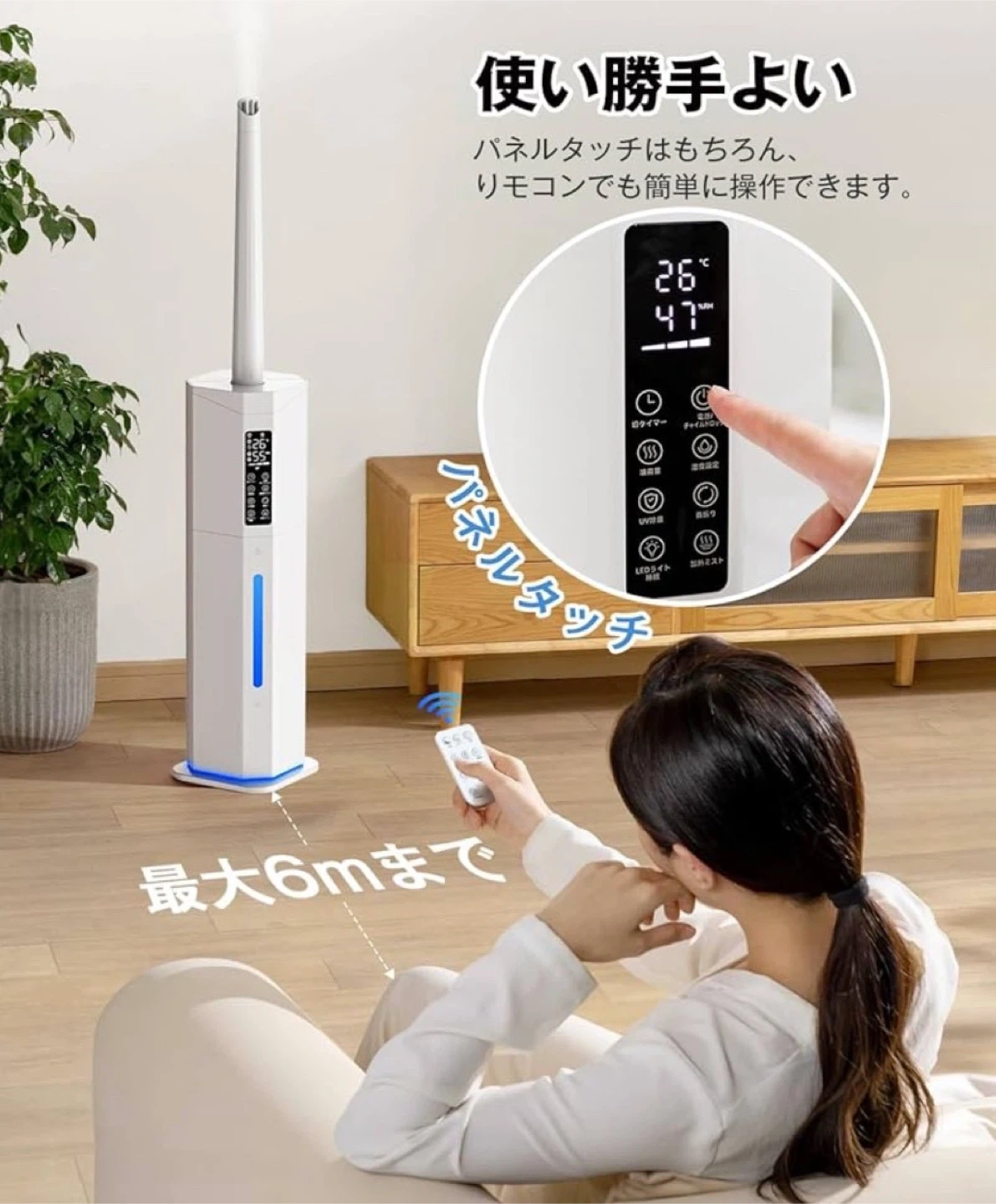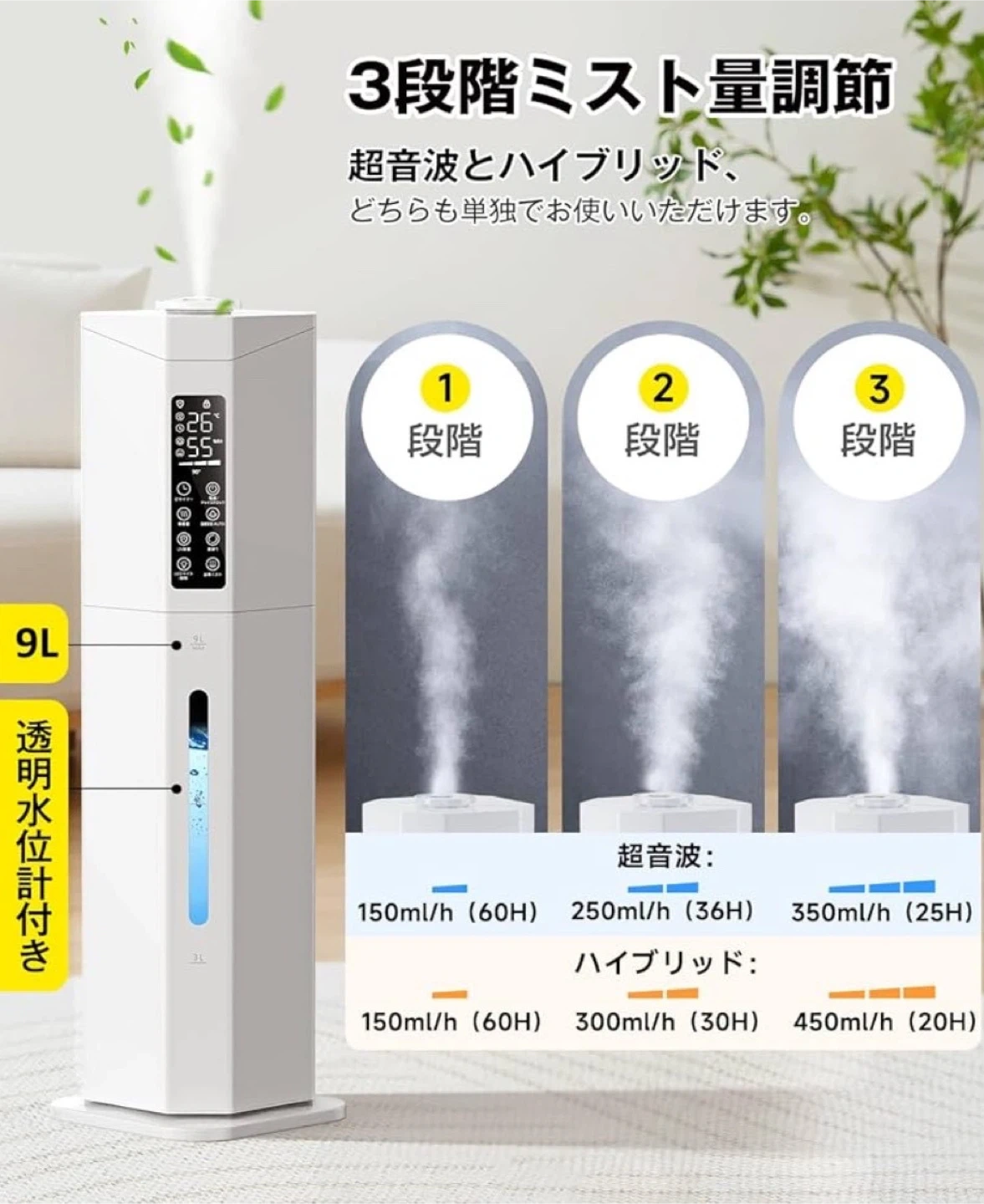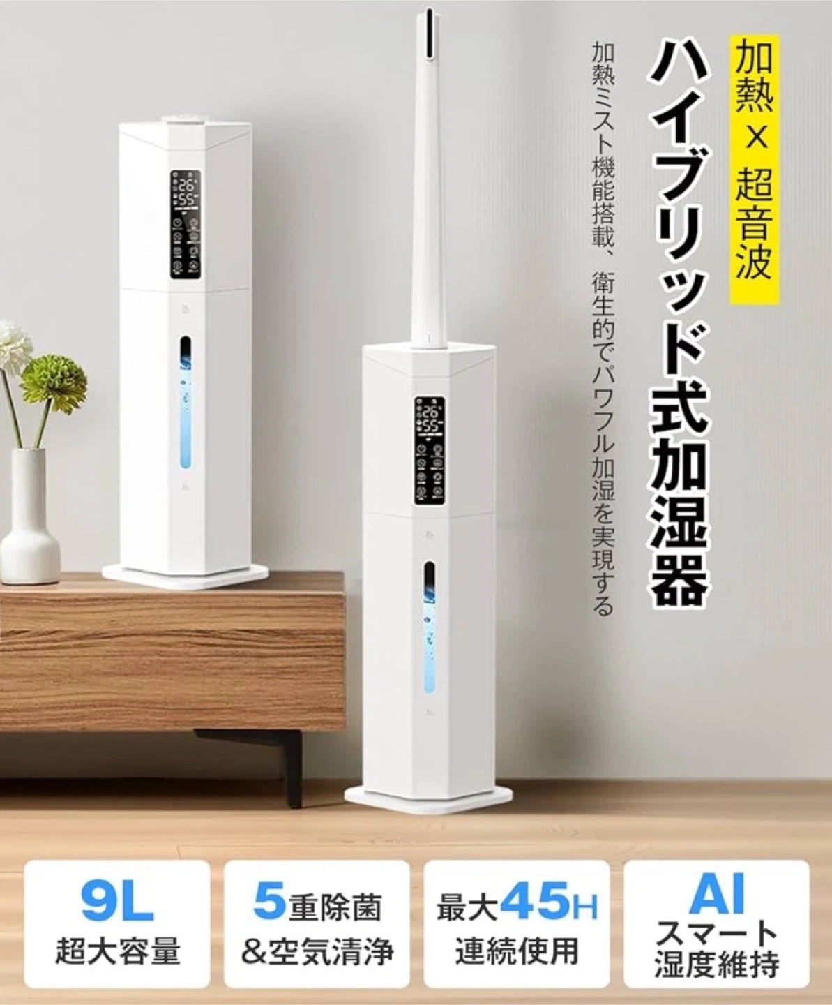 加湿器 大容量 タワー式 9L 加熱ミスト45H連続運転 加熱式 ハイブリッド式