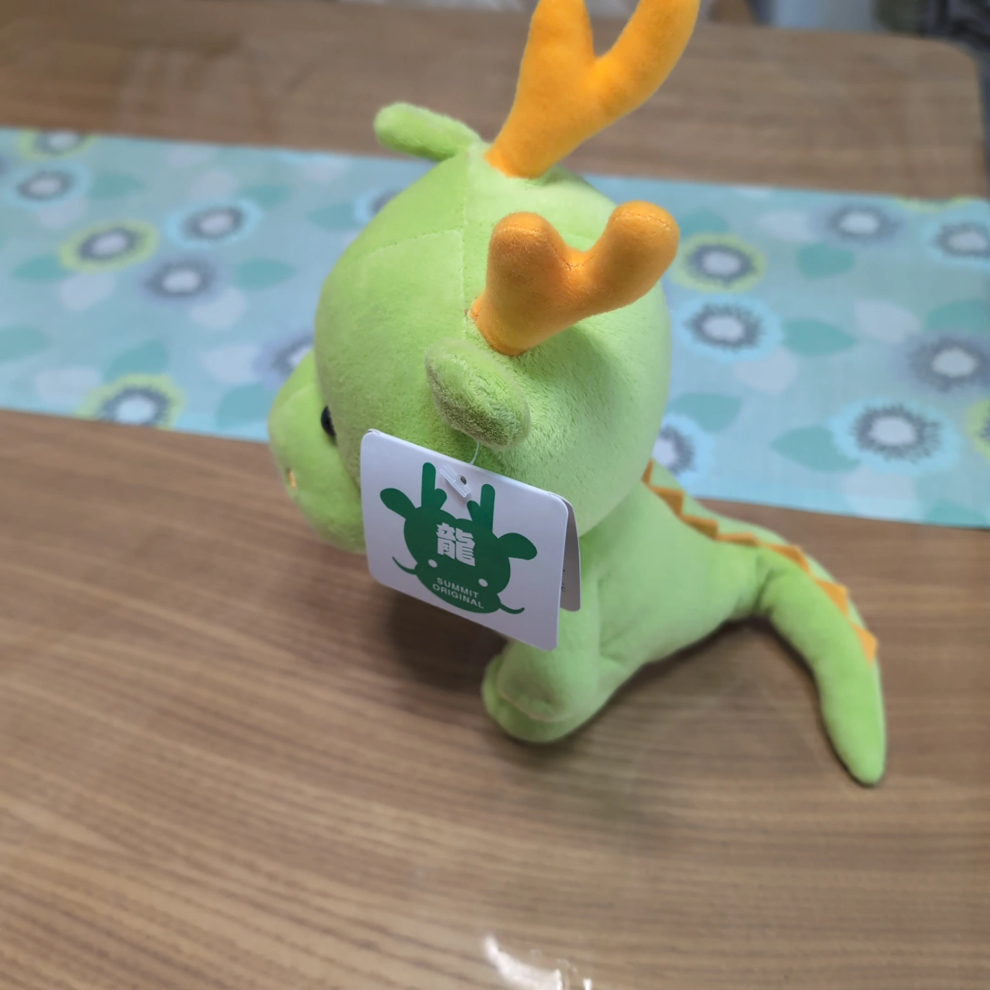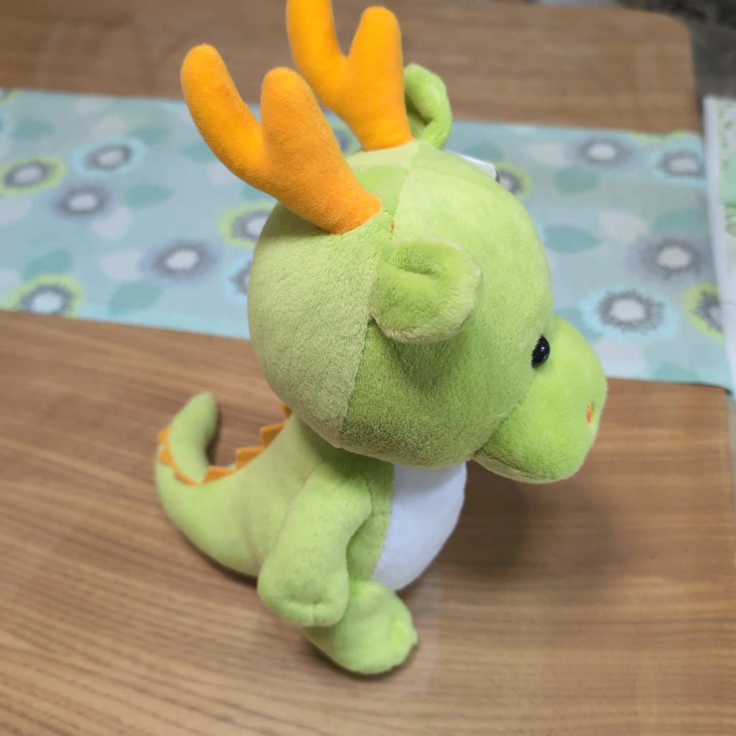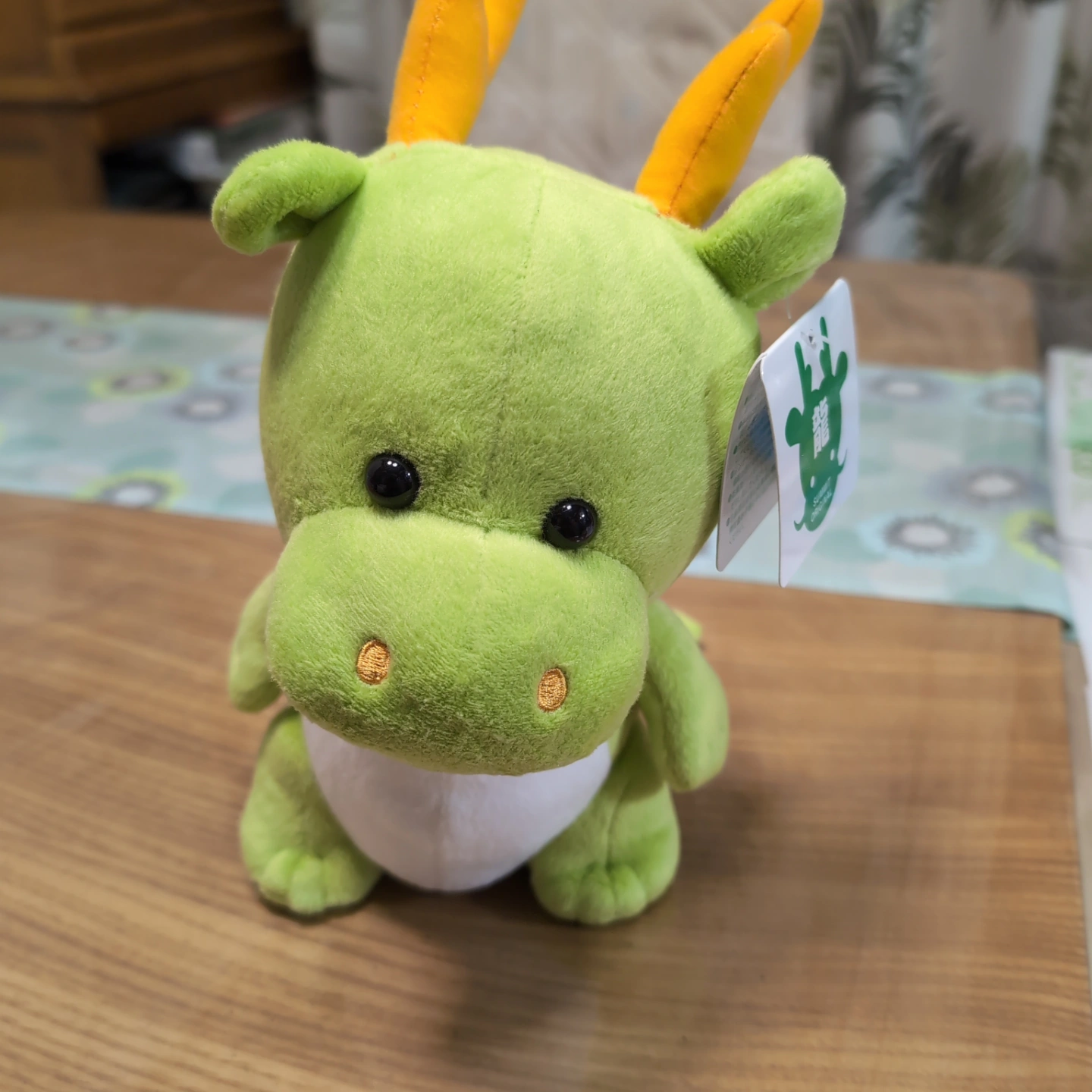緑色のドラゴンのぬいぐるみです。オレンジ色の角付き。白いお腹が特徴的。タグ付きです。