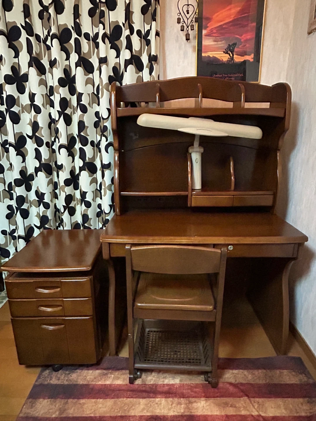 学習机、椅子、袖机のセットです。 ・色:ブラウン ・机、袖机、椅子は木製 ・小さな傷あり ・引き出しの中は汚れ有り ・足元の棚板が一枚破損 ・色あせ無し 中古品であることご了承ください。 運びやすいように上部、天板、下部と分割してお渡しします。 受け渡しは10月19日のみ。 同じタイプの幅110センチの学習机がもう一台あります。 よろしければ2台で¥8000にいたします。