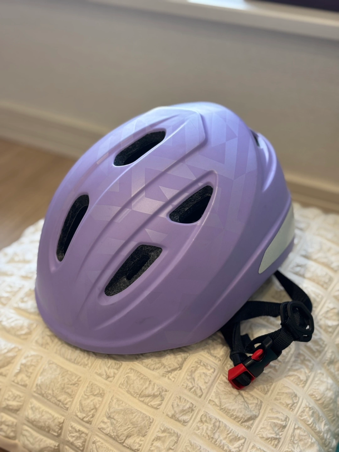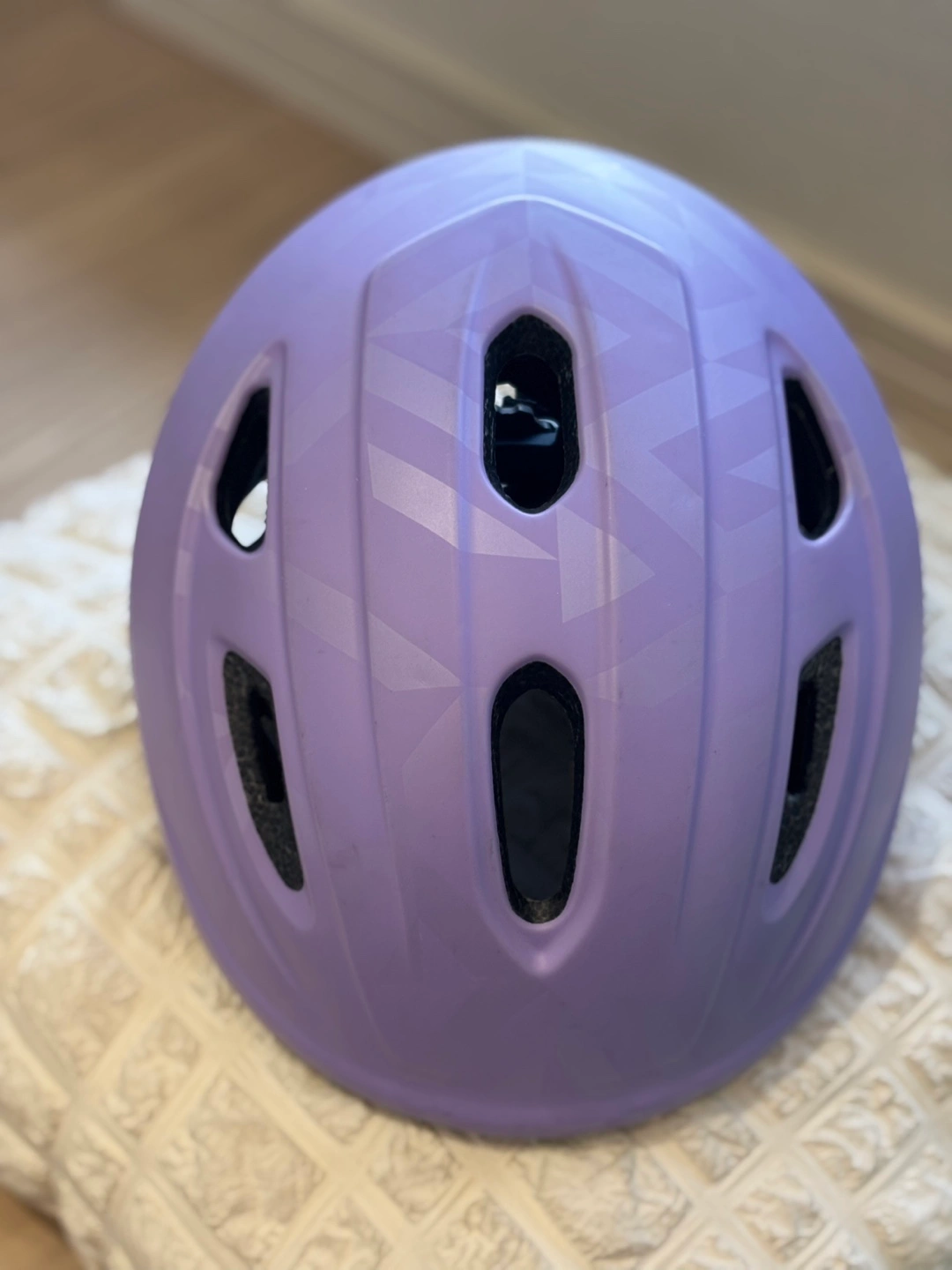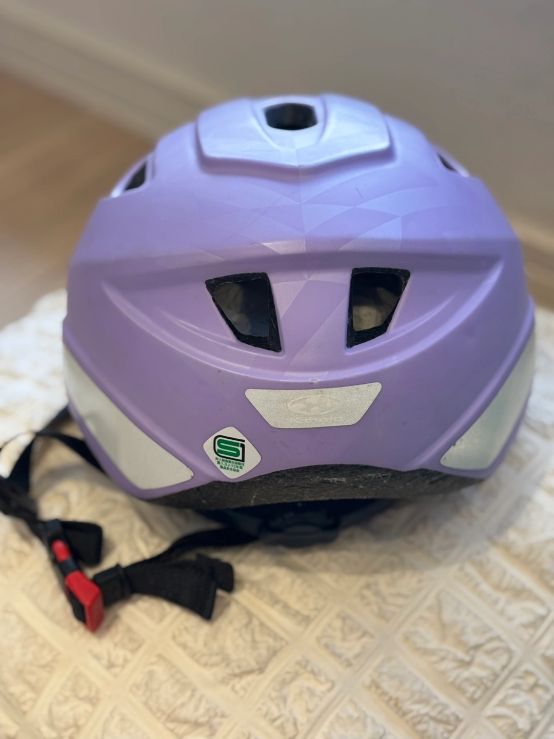 小学生用に使用していた自転車ヘルメットです 7-9歳用で定価7000円位で購入しました サイズアップを検討の方に良ければ。 ・カラー:紫 ・サイズ:54-56cm ・2年使用 ※お子様の頭サイズや髪型などで、多少の前後期間は使えると思います。 ※外側に大きな傷などはなさそうです。 つけ忘れる事も多く、落としたりあまりなかったので、まだまだ使って頂ける状態と思います(^^) 桜新町駅、中央図書館、駒澤公園、馬事公苑など可能です