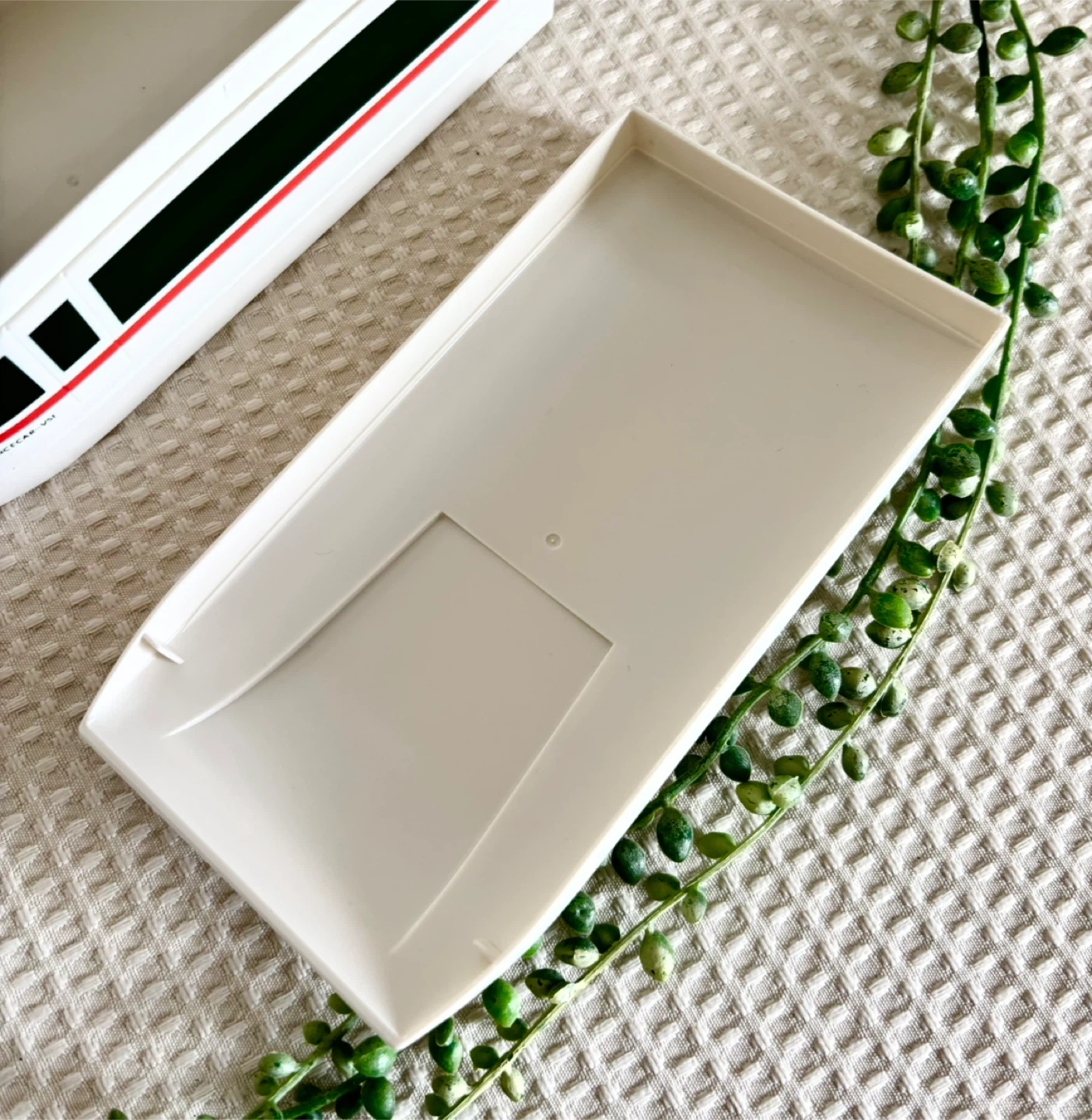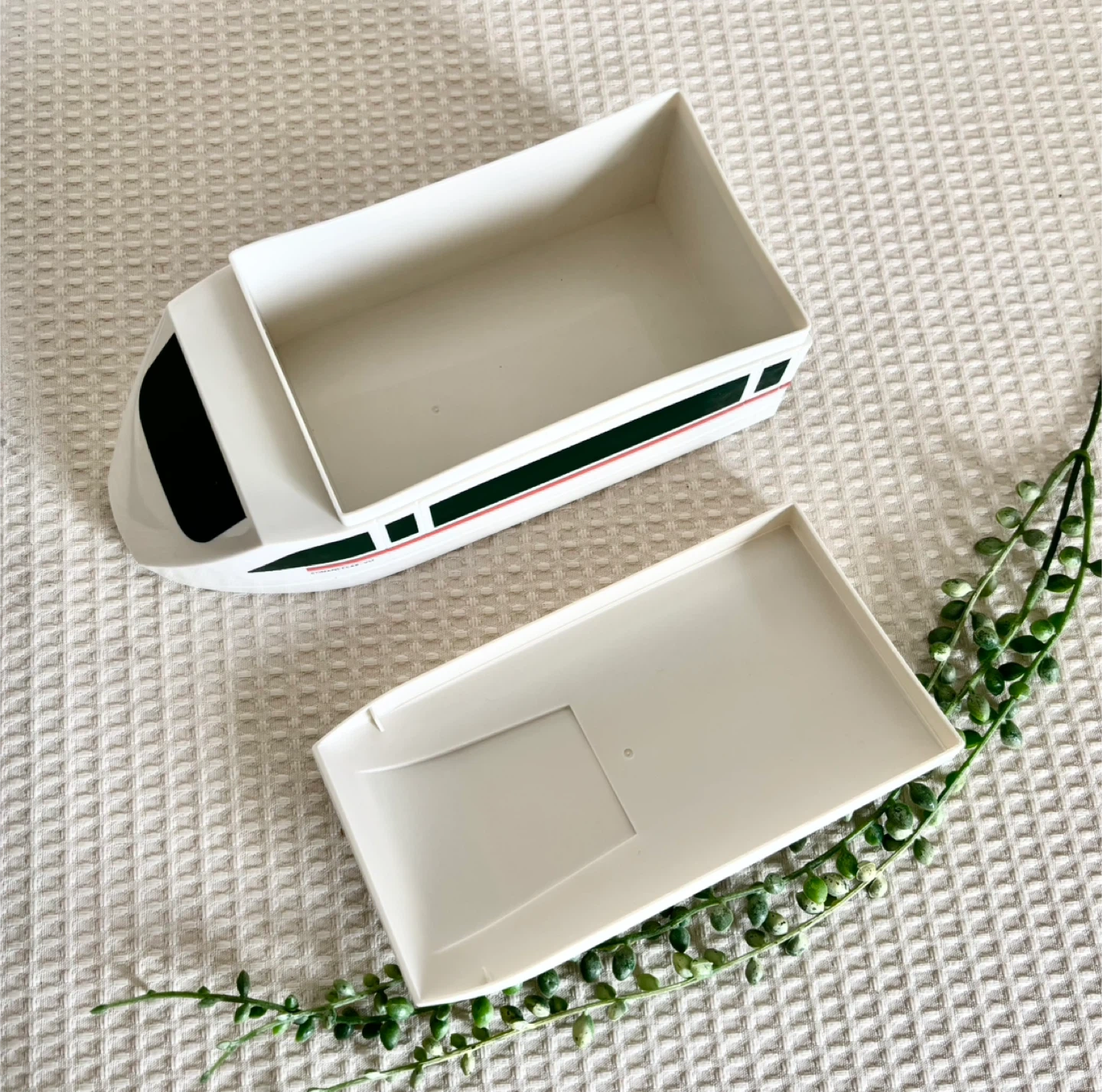 小田急線ロマンスカーデザインの弁当箱、 上部がふたになっています。 ロマンスカー内で食べたあと洗って保管していました。 お弁当箱や小物入れにいかがでしょうか? 蓋をした高さ 約7センチぐらい 奥行き    約9.5センチぐらい 横幅     約22 センチぐらい 自宅保管品、中古品にご理解ある方にお譲りします。 後ろ側にもともとの印刷の赤い色のはみ出しがあります。 - デザイン: 電車の形状 - カラー: ホワイト、グリーン、レッド - 構造: 上部が蓋のデザイン ご覧いただきありがとうございます。 #電車お弁当箱 #電車 #お弁当箱 #小田急線 #ロマンスカー #インテリア #小物入れ