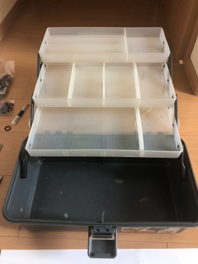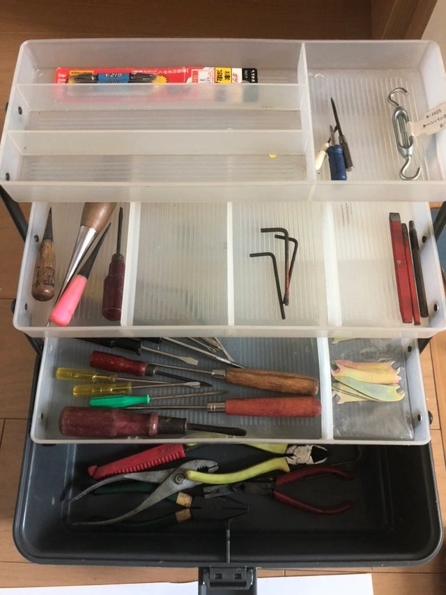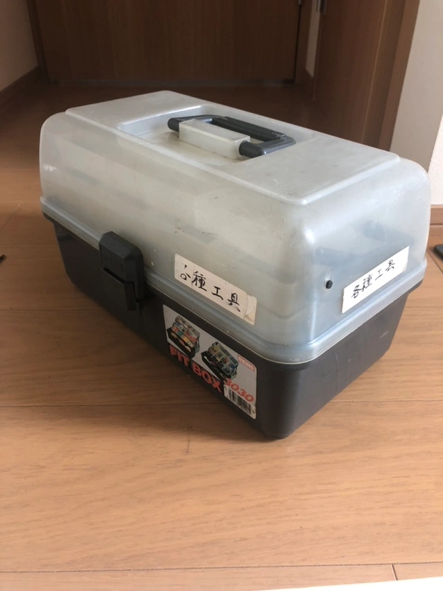 あたたかさ工具箱と工具セット 写真に写る工具、道具全て付けます 使用済み 仕切り板外せます 棚ヒビある所有ります(2箇所) 付箋貼ってあります 使用済みをご理解頂ける方 宜しくお願います