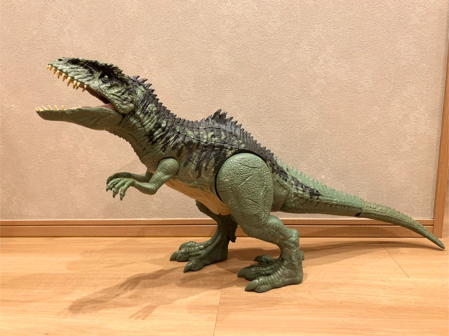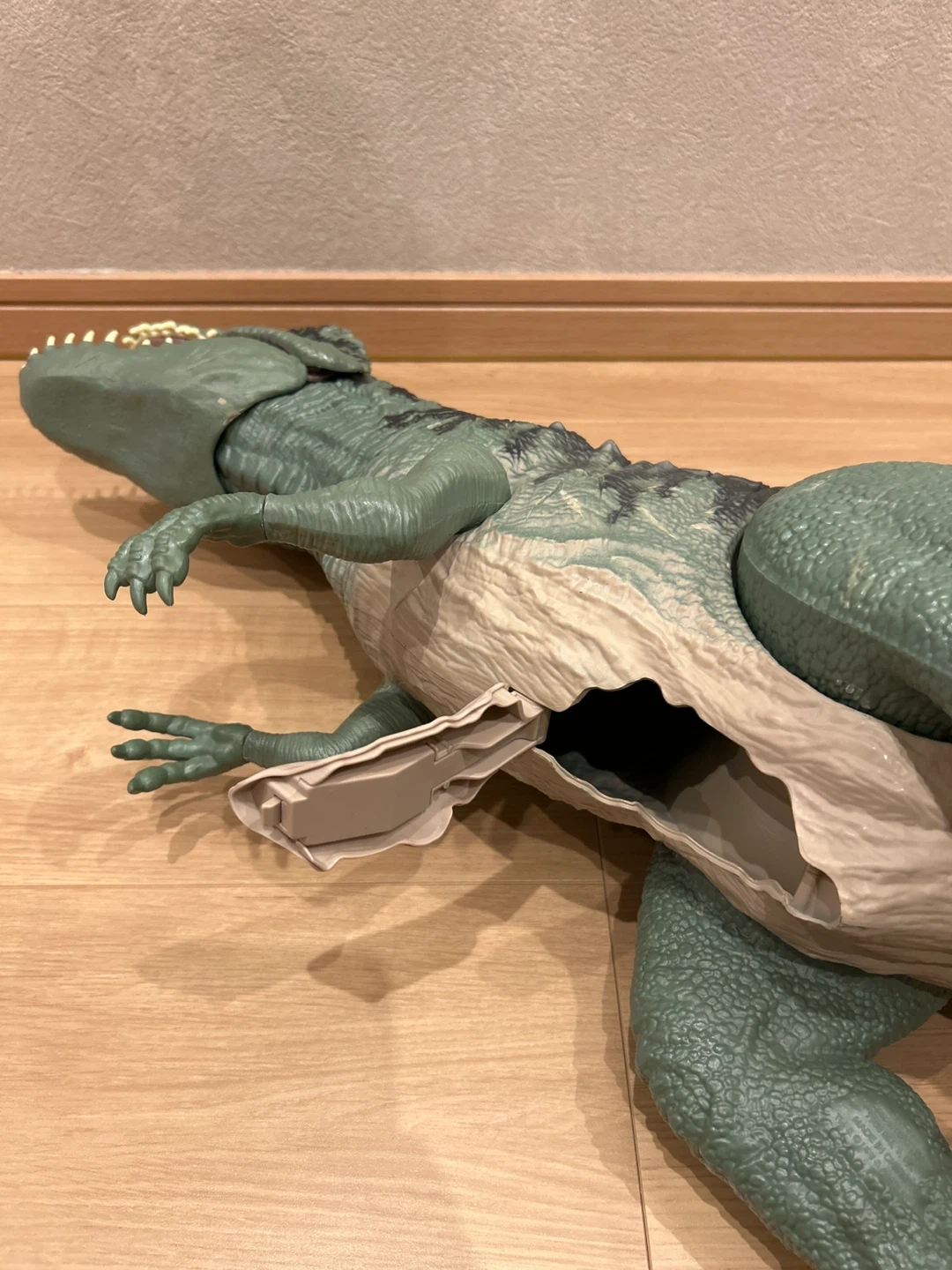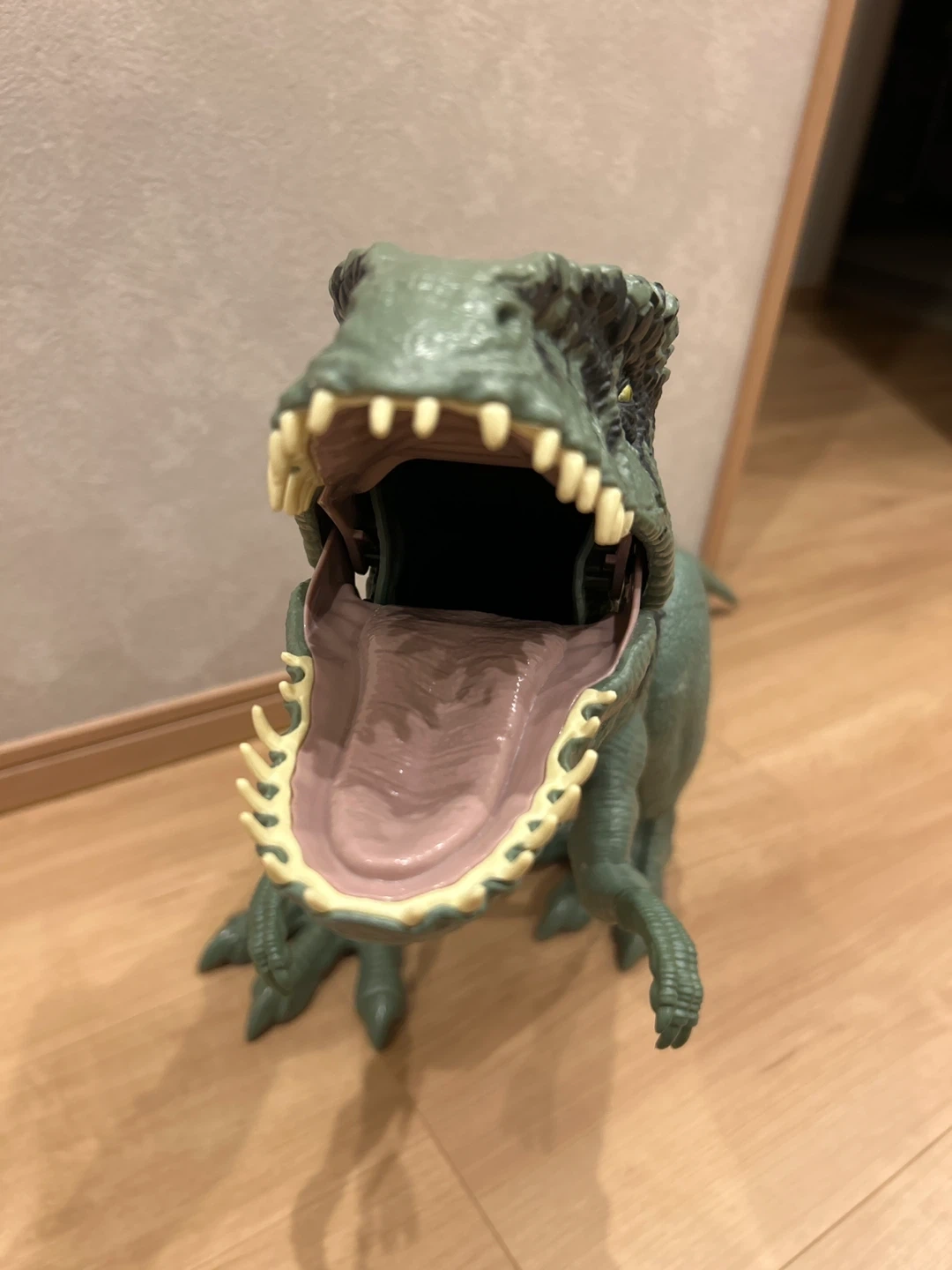 恐竜の大きなおもちゃです 口からしっぽまでで1mほどあります。 口に物を入れて(食べさせて)、お腹から取り出して遊べます。 口、手足、しっぽを動かすことができます。 音が鳴ったりはしません。 中古品であることご了承ください