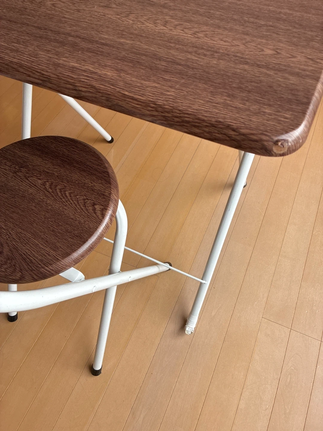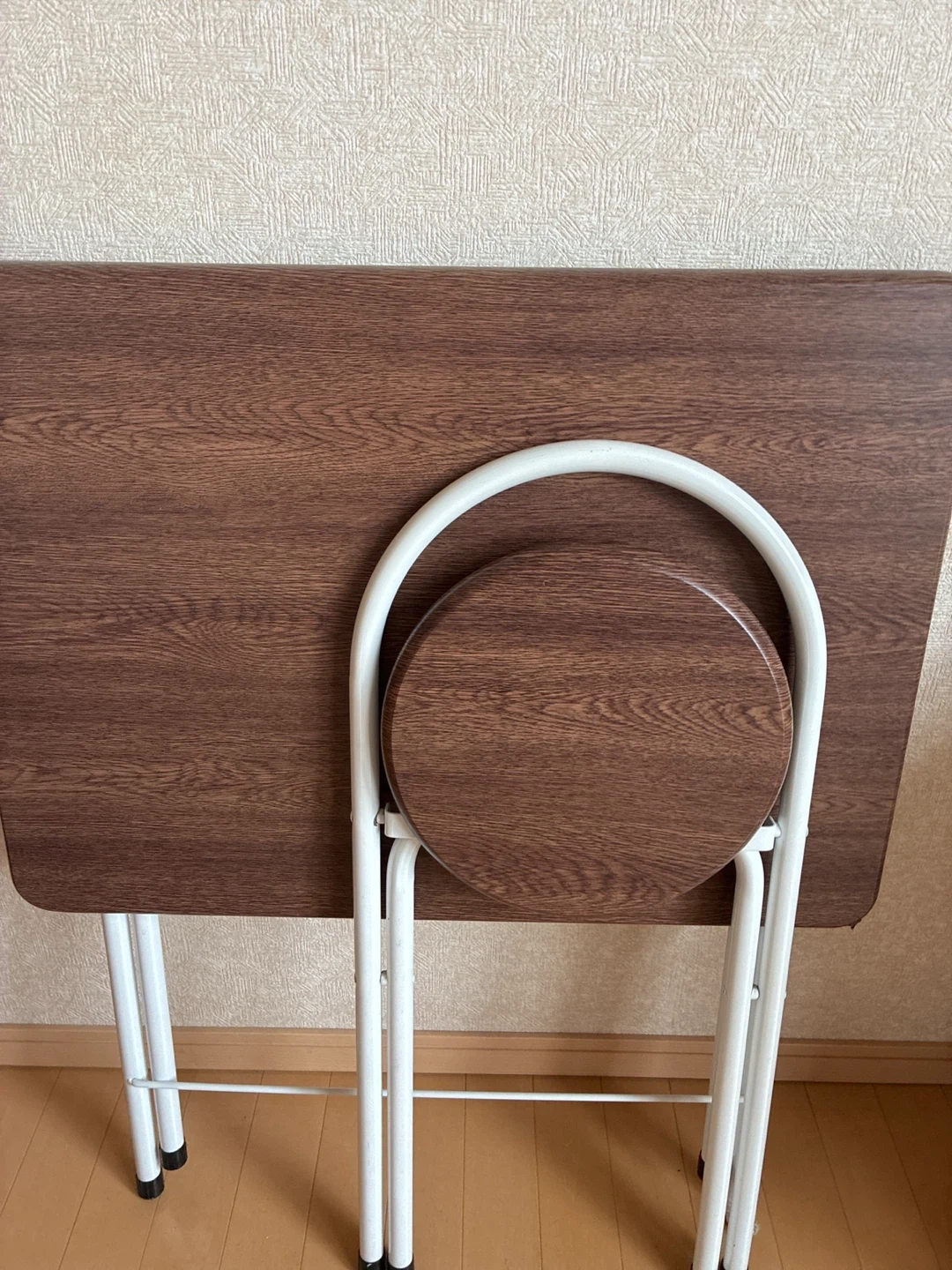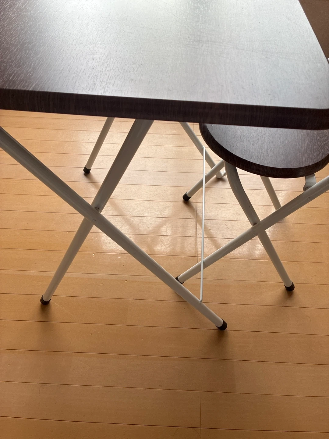折りたたみテーブルと椅子のセットです。 ・色:木目調の茶色 ・テーブルの脚と椅子のフレーム:白 ・椅子の足に一部損傷あり(テープで補修) ・重さがあります! ・折りたたみできて収納は勝手が良いです 中古品であることご了承ください