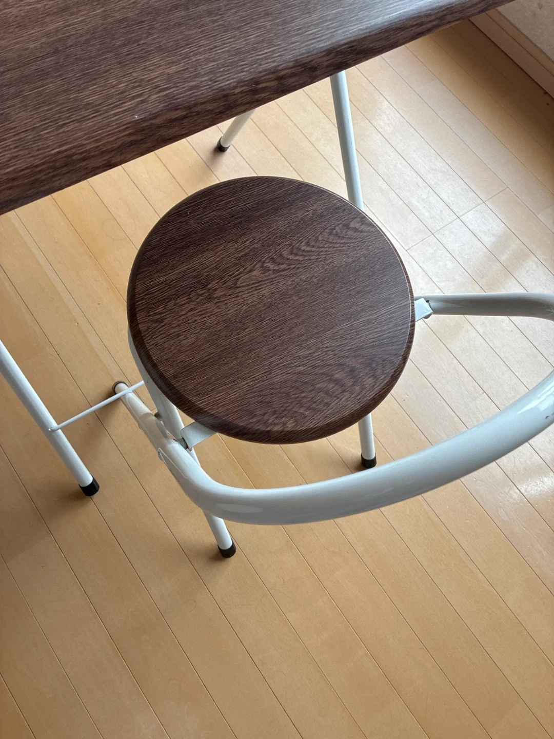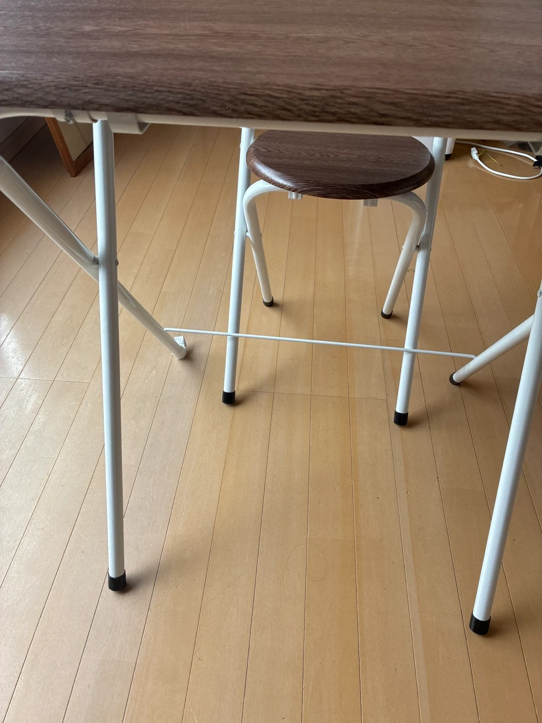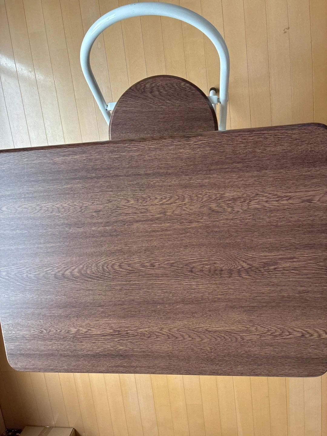 折りたたみテーブルと椅子のセットです。 ・色:木目調の茶色 ・テーブルの脚と椅子のフレーム:白 ・椅子の足に一部損傷あり(テープで補修) ・重さがあります! ・折りたたみできて収納は勝手が良いです 中古品であることご了承ください