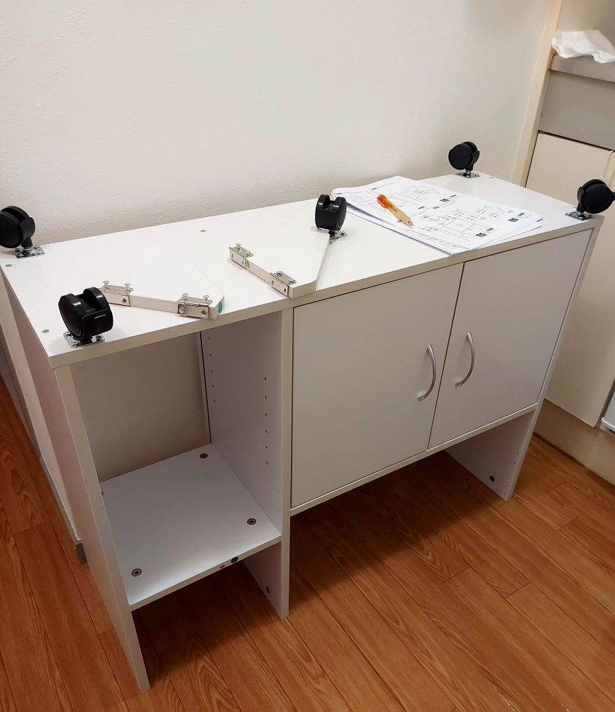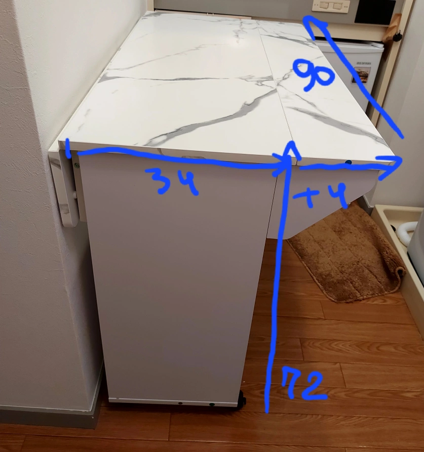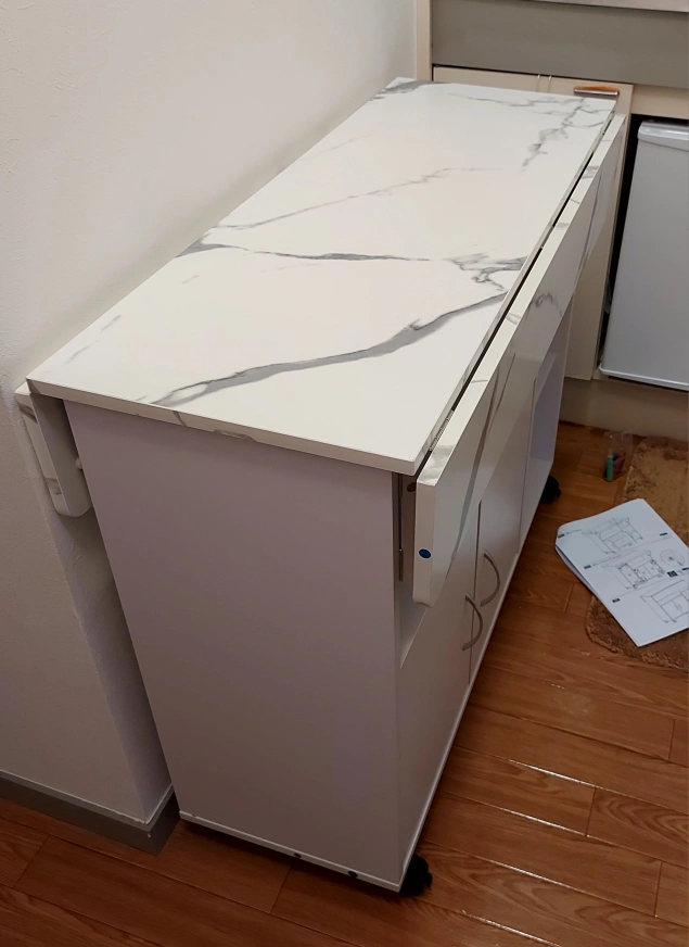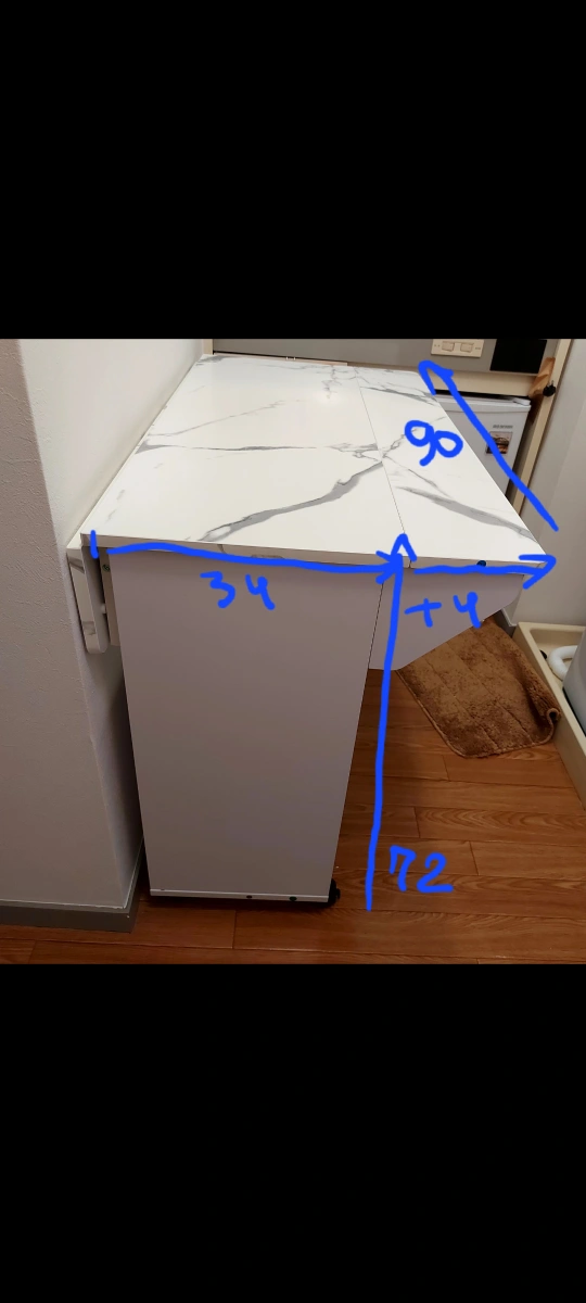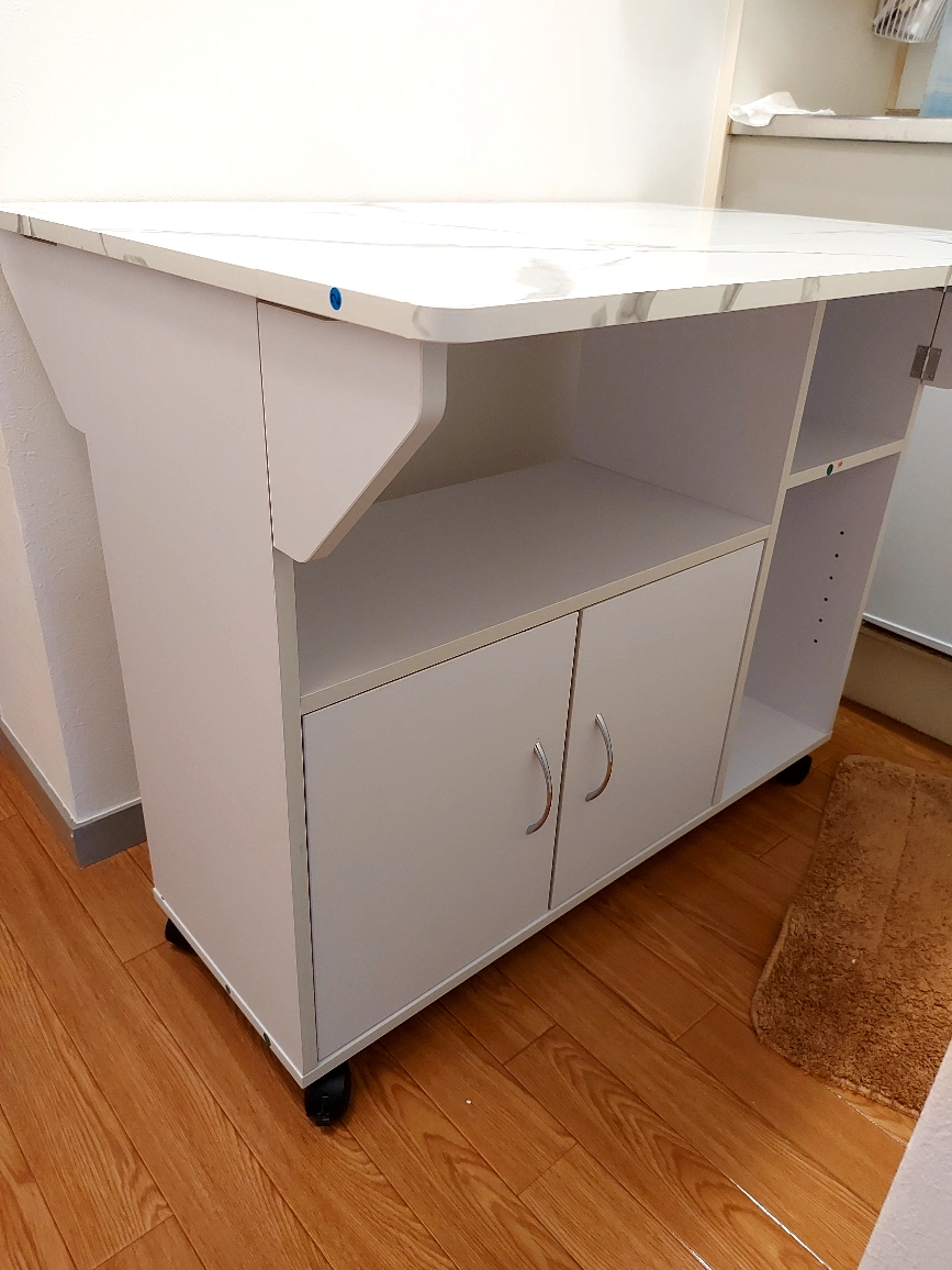 折りたたみ式のキッチンワゴンです ・カラー:ホワイト、大理石調 ・サイズ:高さ72cm、奥行き34cm (展開時 奥行き90cm) ・キャスター付き ・組み立て済 中古品であることご了承ください。6ヶ月ぐらい使いました。引越のために売れます。