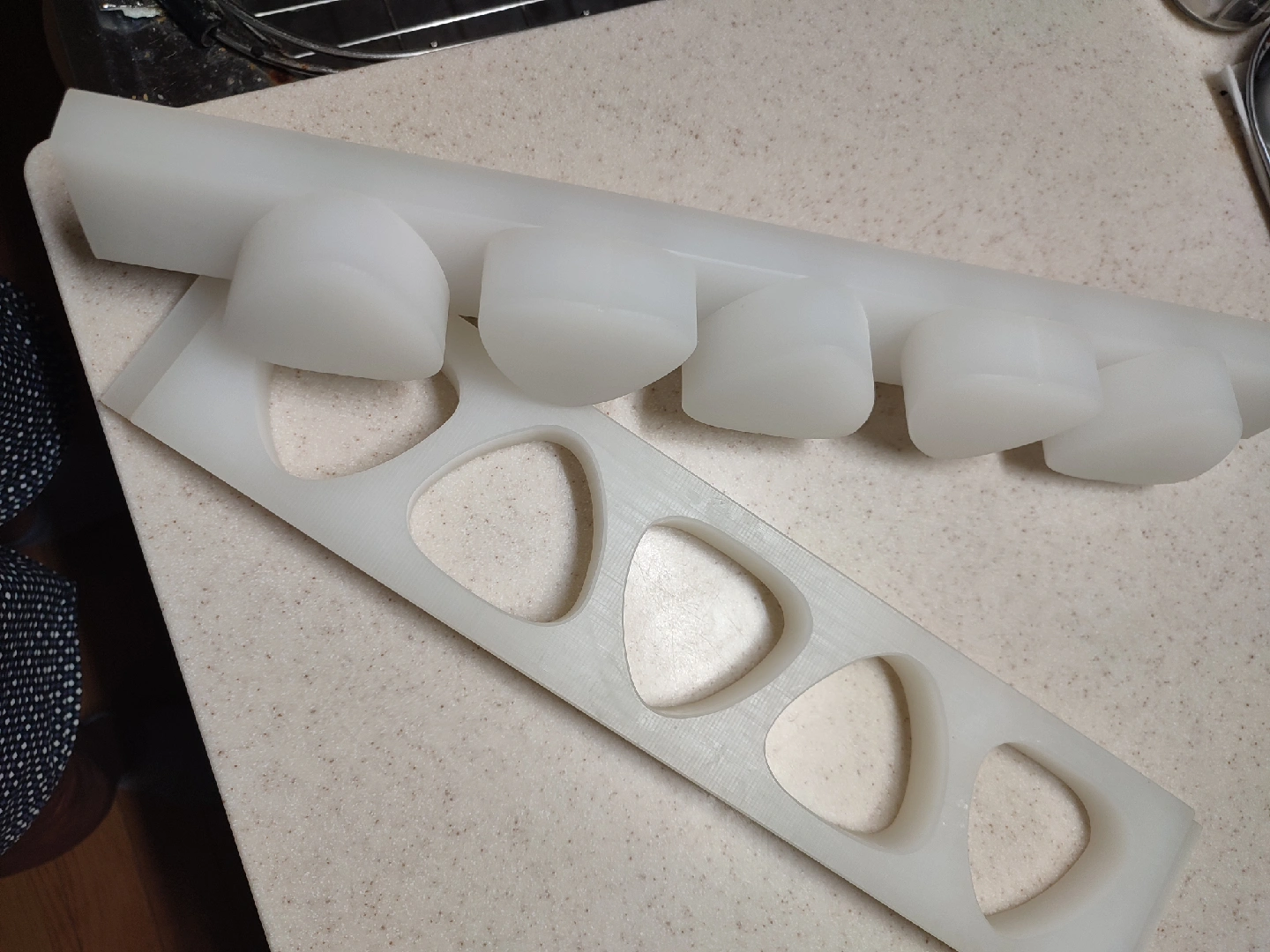 山県科学製幅44×奥行き9×高さ4.5cmの おにぎり型です。私はいつも穴の中に先に大きめのラップを敷いてからご飯を詰めるので型にはご飯や具材は直接触れません。ですから型自体に汚れはありません。出来上がりのおにぎりはコンビニやスーパーの物に比べてやや小さいと思います。