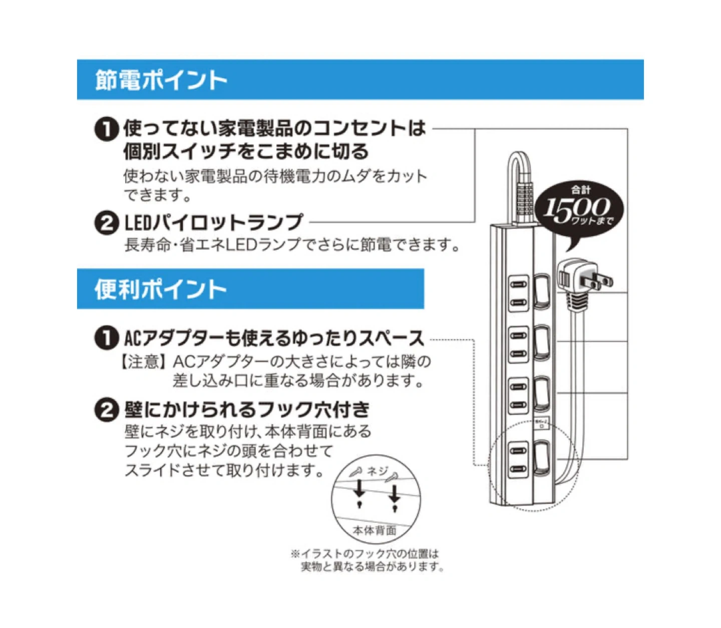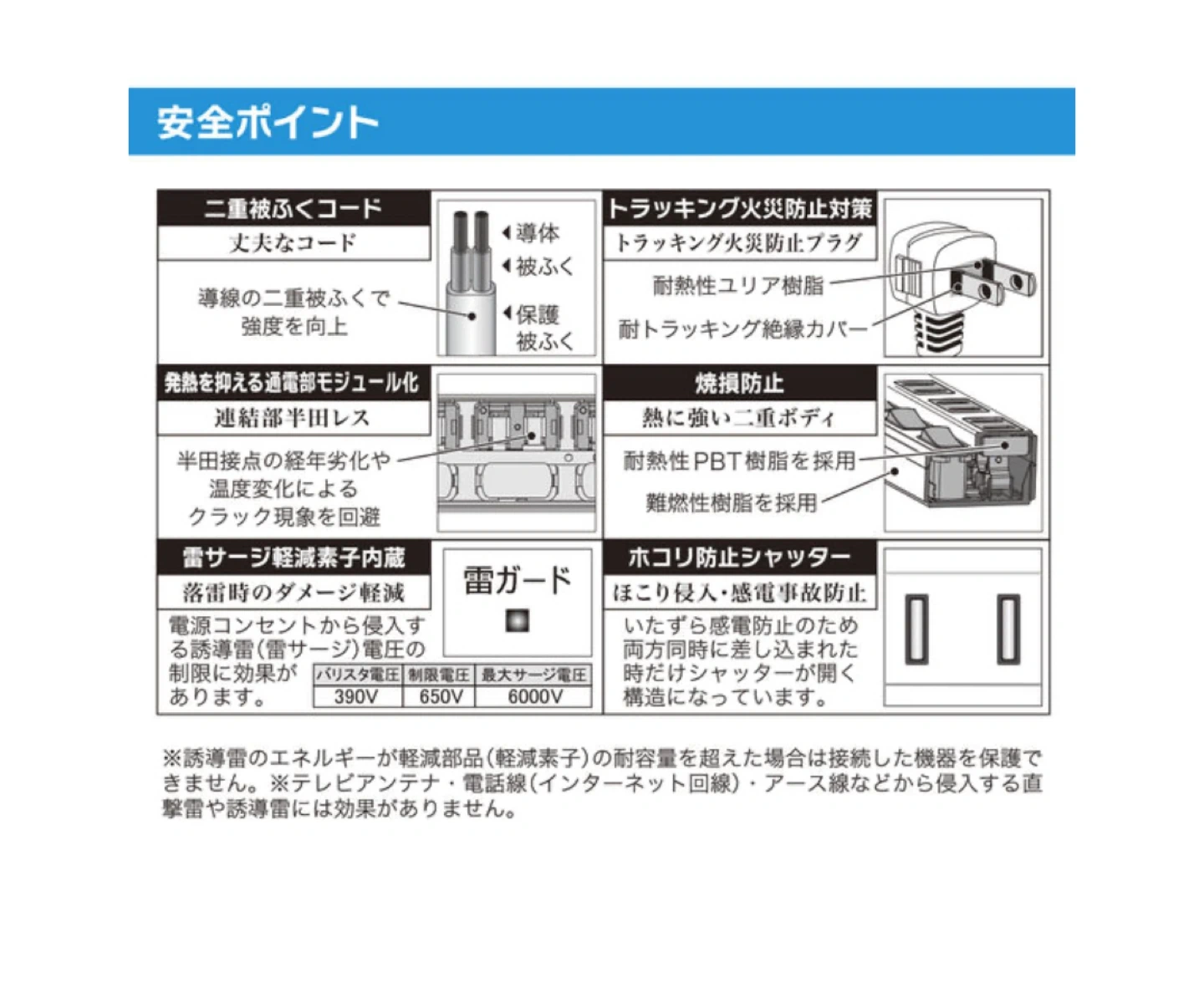 商品の特徴 【 特 長 】 ● PCなどの精密機器を雷から守る、雷に強い節電タップ ● 安心の雷ガード ● 熱に強いPBT樹脂使用、発熱を抑えるモジュール設計で耐熱性アップ ● 雷サージ軽減素子内蔵 ● ホコリ防止シャッター ● 燃えにくいコンセント周り ● ACアダプターもスッキリ収納 ● スイッチランプもLEDで省エネ ● トラッキング火災防止プラグ ● 壁にかけられるフック穴付き ● カラーは黒 【 仕 様 】 ■ コンセント:4個口 ■ プラグ形状:L型 ■ 15A 125V 合計1500ワットまで ■ コード長:1m 商品仕様 メーカー:オーム電機 ブランド:オーム電機(OHM) カラー:黒 長さ:1m プラグ形状:L型 コンセント:4個口 最大サージ電圧:6000V 制限電圧:650V ブランド:オーム電機(OHM) バリスタ電圧:390V