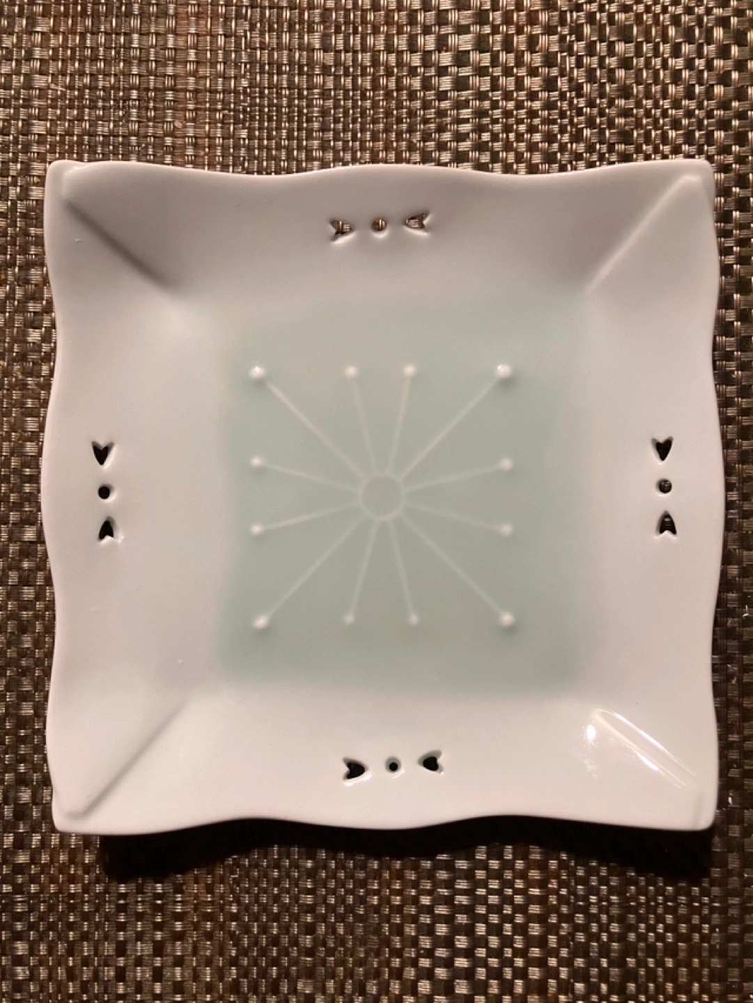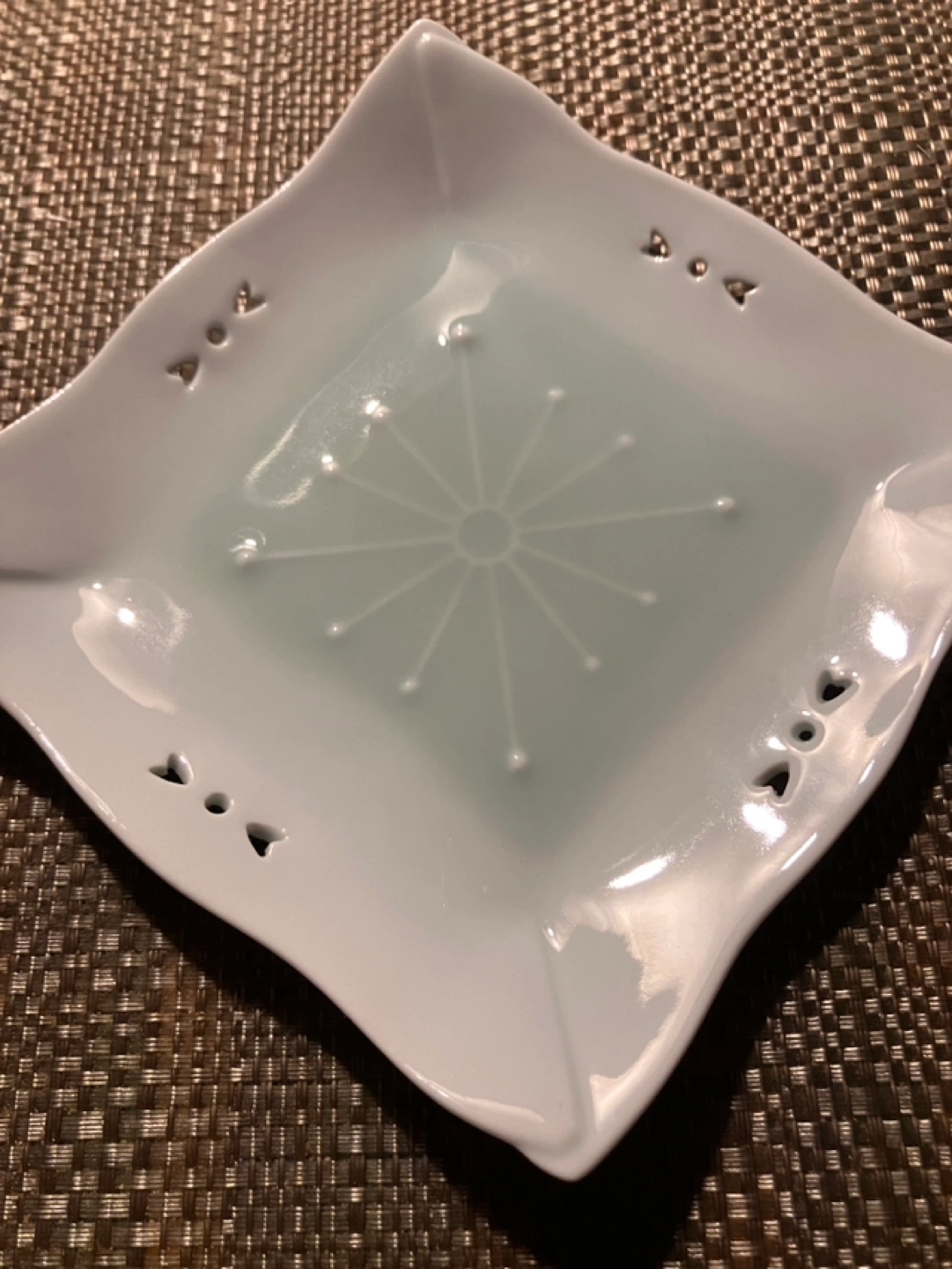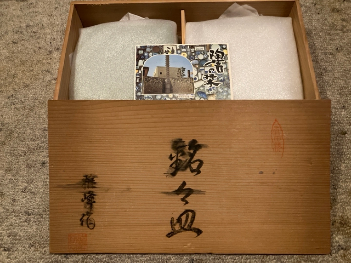 五枚揃った包み紙もそのままな銘々皿のセットです 木箱には、有田焼 銘々皿 雅峰作 と読めます とても綺麗で可愛い❤︎の透かし穴の空いた和皿。 中心にも模様や色味のぼかしが入っています 周りを少し高く持ち上げて有ります 果物や、お菓子、ケーキ、はもちろん、アイデア次第でさまざまな用途にお使いいただける、上品で高級なお皿です お家に眠らせて置くのに忍びないので、どなたかに使ってもらえたらと思います 自宅にての長期保存になります 木箱には、汚れや陽焼けがあるかもしれません 引き取りの際には、丈夫な袋をお持ちください 祐天寺駅、学芸大駅、中目黒駅、辺りでしたらお持ち出来ます 恵比寿駅、渋谷駅、目黒駅迄はご相談ください