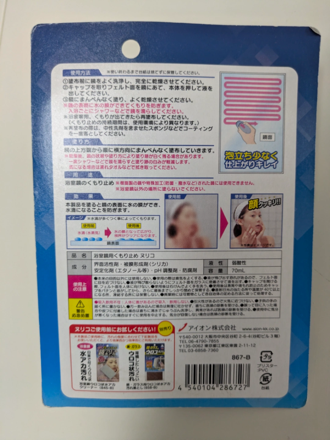 【新品未開封】アイオン 曇り止め 浴室鏡用 ヌリコ ブルー 約高さ13.2×直径5.1cm 867-B 1個入 0