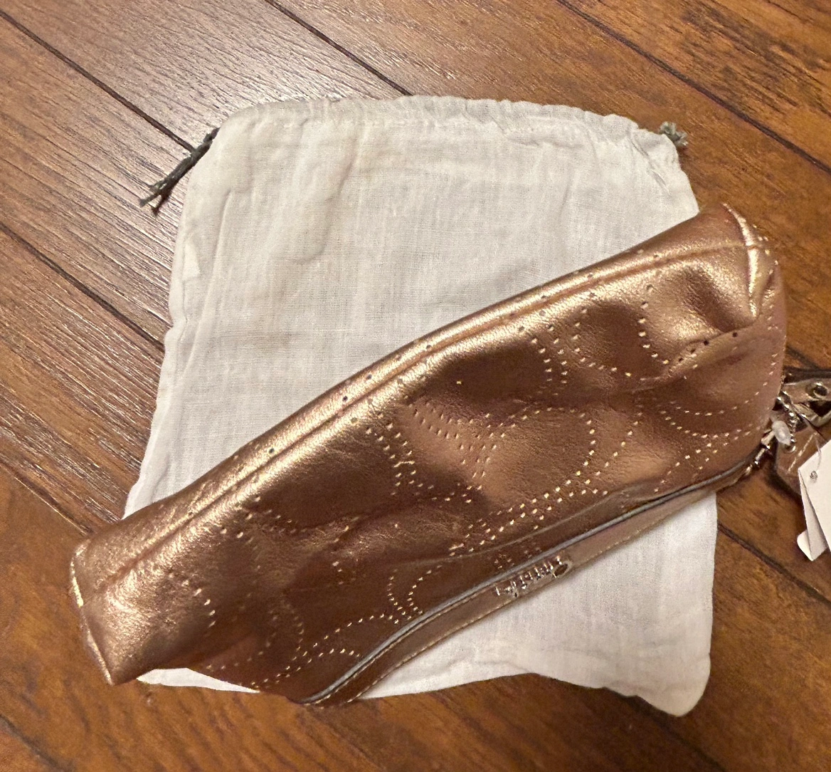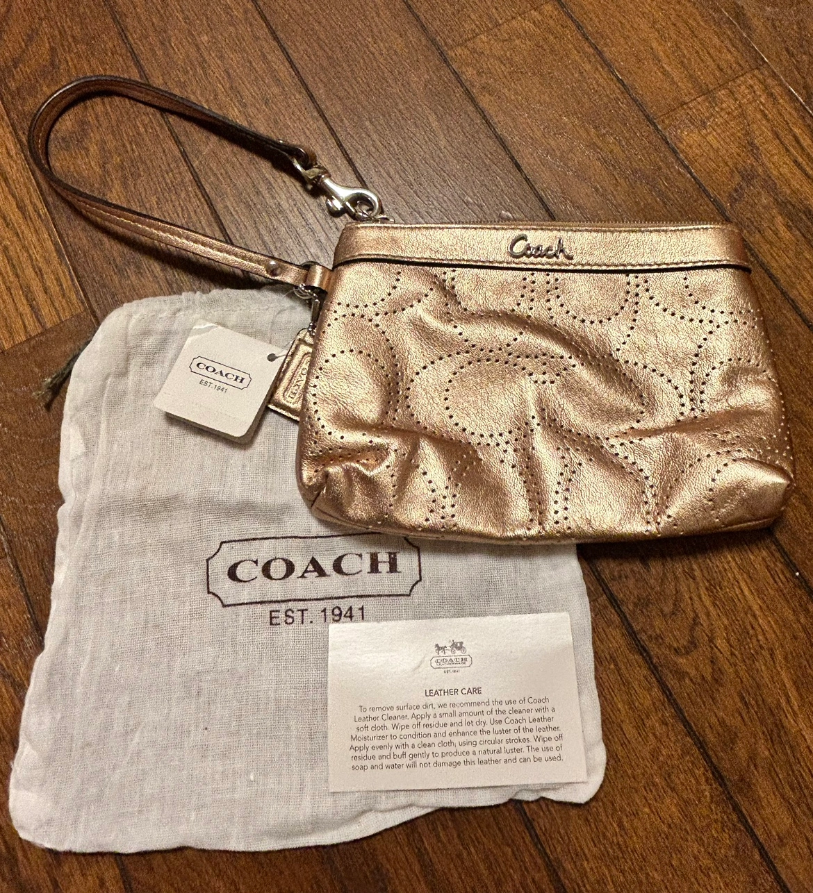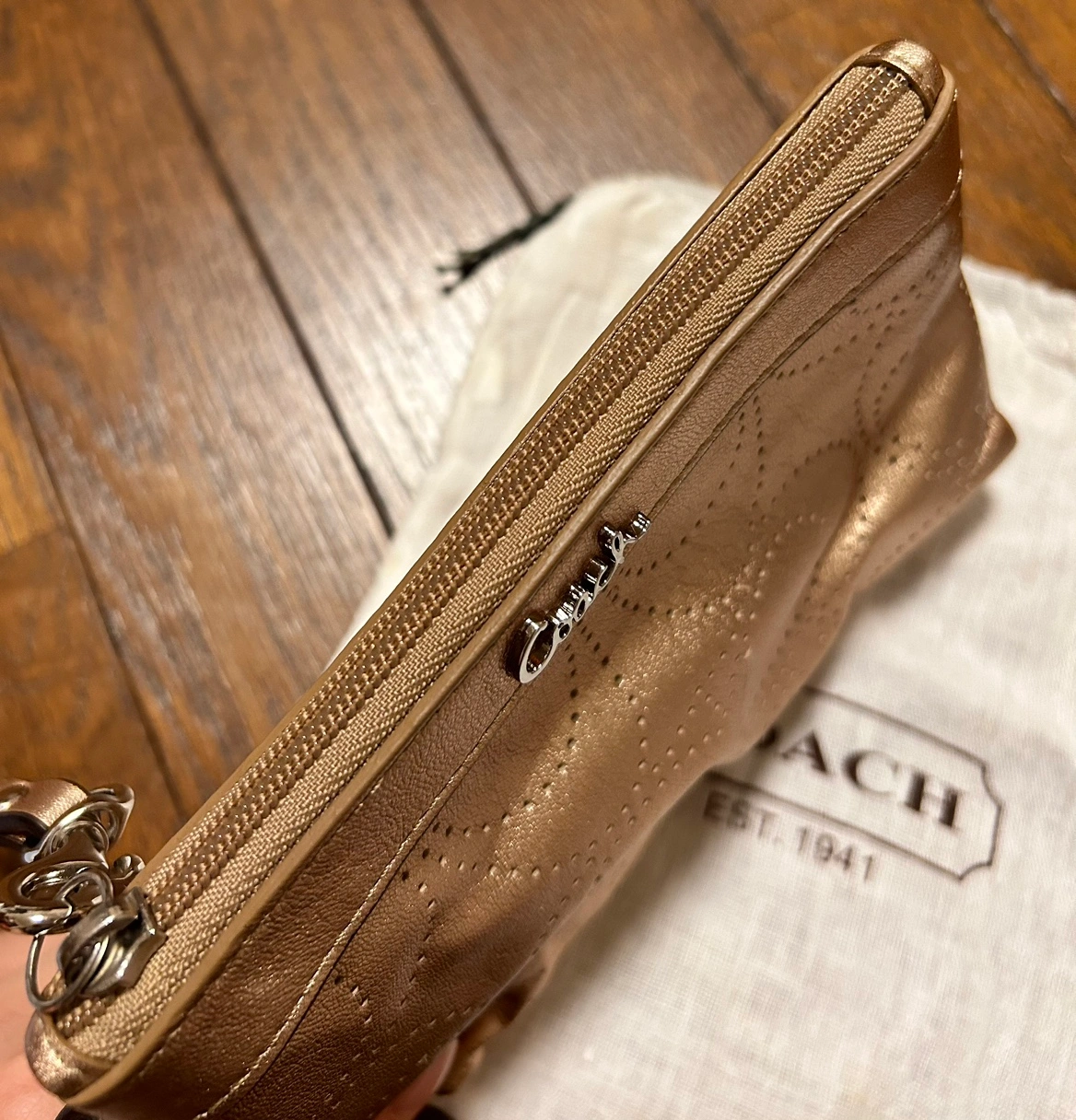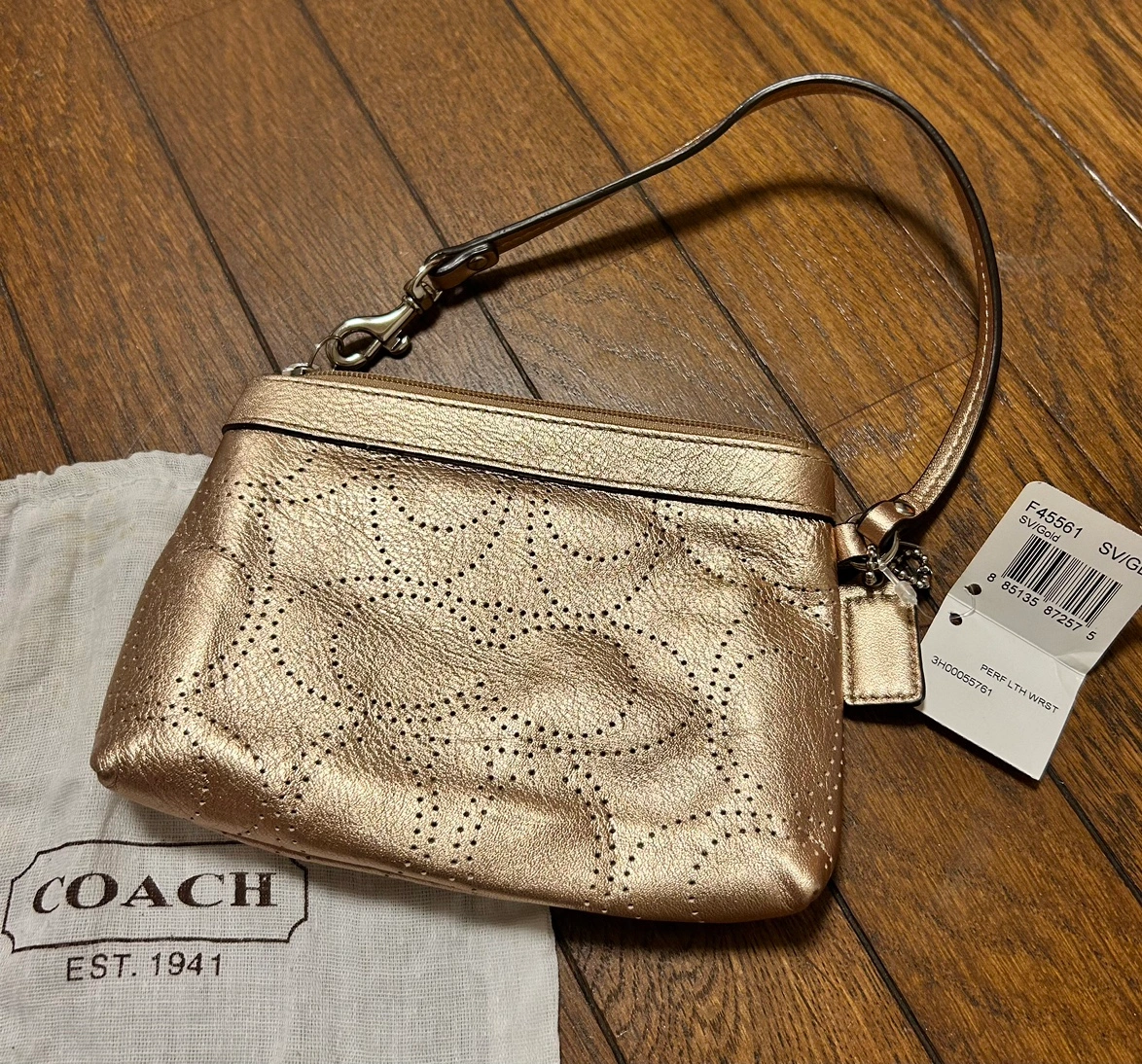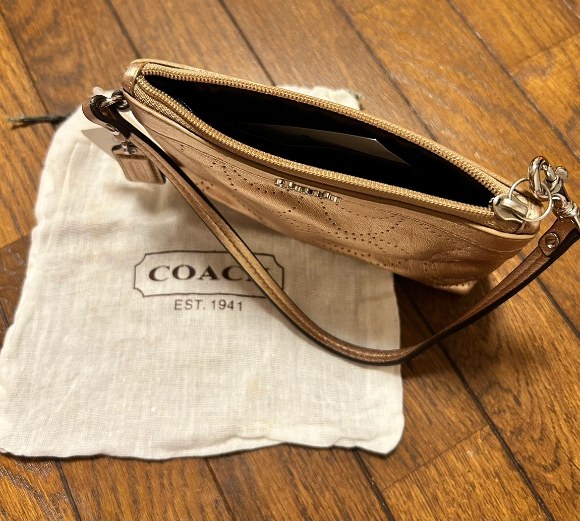 ご覧いただきありがとうございます😊 coachのシグネチャー ミニポーチ ゴールド ミニポーチ、旅先ちょこっとbagにも^ - ^b アメリカのcoachのお店で購入しました。 新品未使用タグ付き ◆サイズ(素人採寸) 縦12cm×横17cm(開口部は12.5cm) iphone14ギリギリ横向きに入ります。 コンパクトなサイズですが、必要な小物を収納するのに十分なスペースです。持ち運びに便利なハンドストラップ付き。 バッグにinしても良し、ストラップでバッグ外側につけても良し:) ※収納袋は保管中に汚損してしまい廃棄予定の為付きませんm(_ _)m 自宅保管にご理解のある方、ご検討いただければと思います。