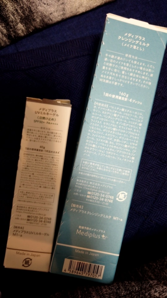 肌に優しい成分を使用した150mlのクレンジングミルクと日焼け止め - ブランド: Mediplus - 製品名: クレンジングミルク - 内容量: 150ml - 特徴: 肌に優しい成分配合 ①クレンジングミルク 160g 定価3,850円 (メイク落とし) ➁U Vミルキーゲル40g 定価3,300円 (ノンケミカル処方) →紫外線散乱剤 ※ノンケミカル処方とは紫 外線を物理的に反射 散乱させてる事で日焼けを防止する方法で総合的なアレルギーの問題が少なくデリケートな敏感肌の人にオススメ!更に毛穴が詰まりにくいと言う特徴もありニキビができやすい肌タイプにも効果的