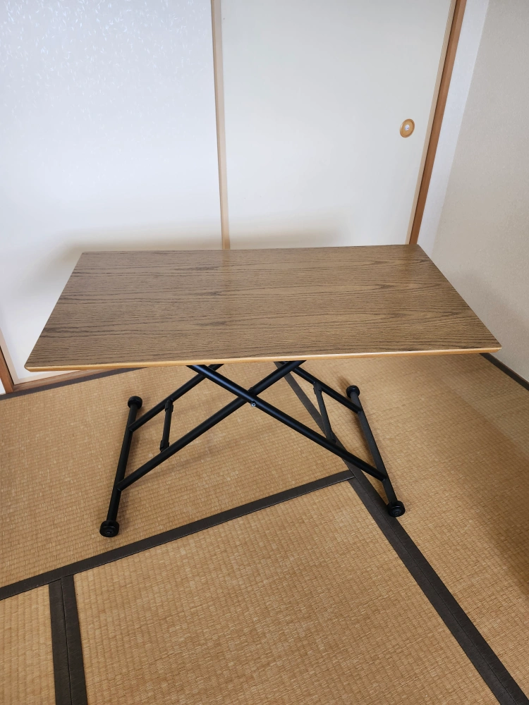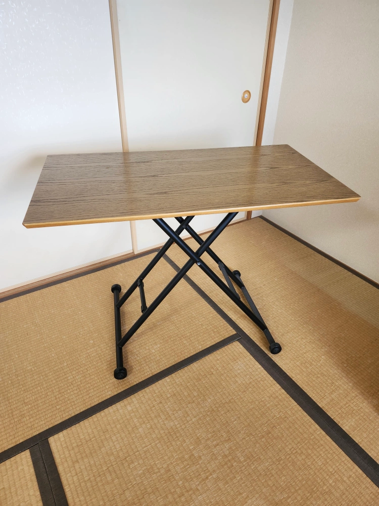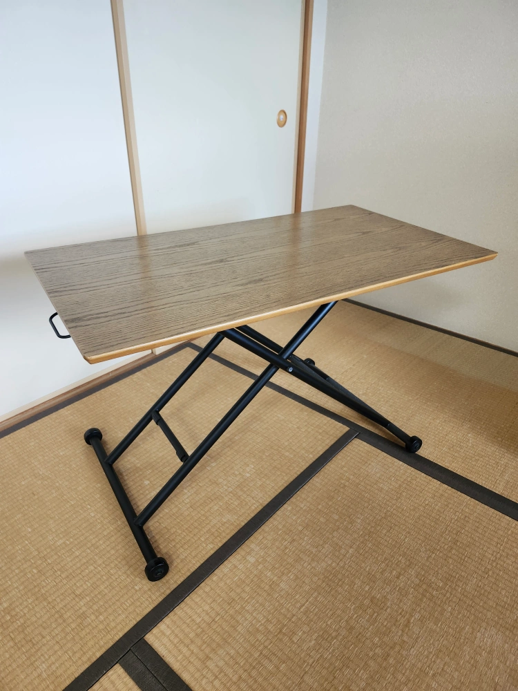 昇降式テーブルです 【情報】 外形寸法: ・幅:1000mm ・奥行き:550mm ・高さ:120-700mm 甲板の表面材:天然木化粧繊維板 表面加工:ラッカー塗装 【状態】 使用感はありますが、目立った傷はありません 中古品であることご了承ください