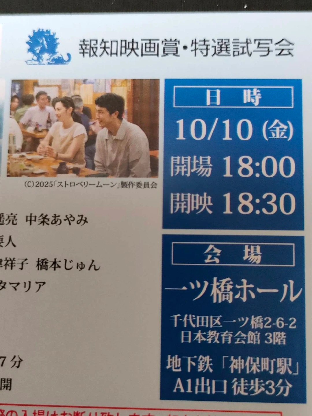 『ストロベリームーン 余命半年の恋』試写会 の招待状 2枚✨ 📽日時 10月10(金) 18時~ 📽 会場 一ツ橋ホール (地下鉄 神保町駅) 🎬観に行ける方居ましたらどーぞ 🎬スーパードライと交換でオネシャス🙏🏻 (500mm×2本) 価格 入れて有りますが物々交換 🎬 お問い合わせは お気軽にどーぞ