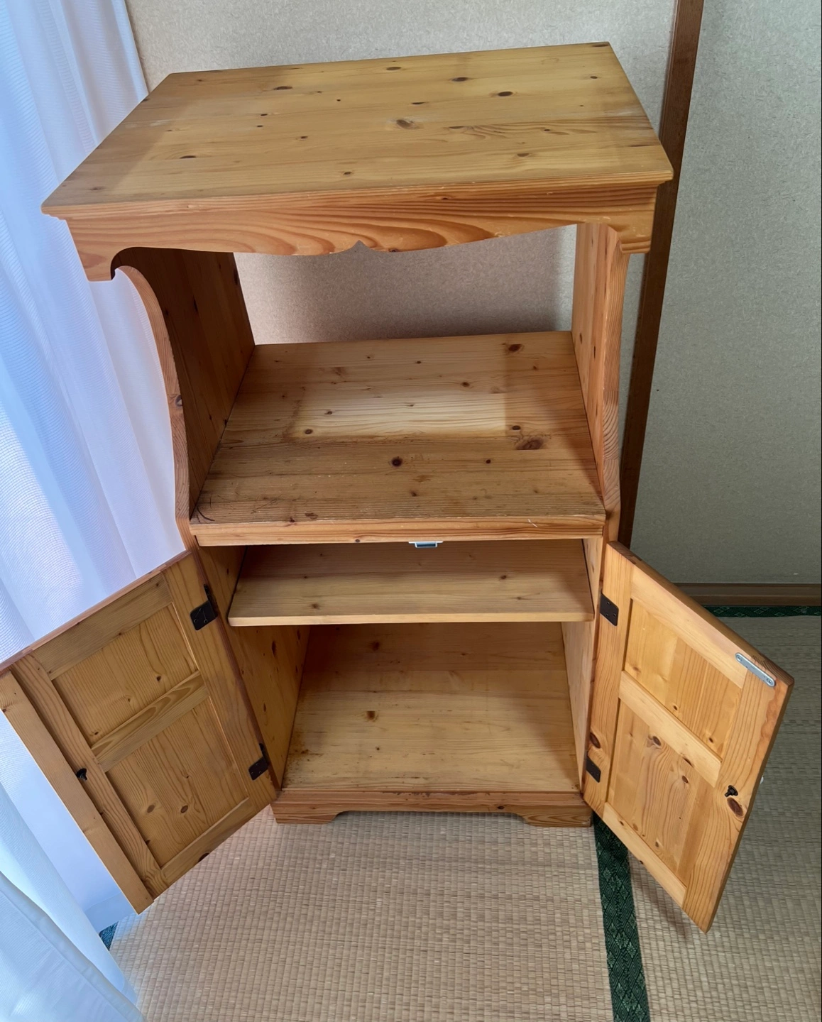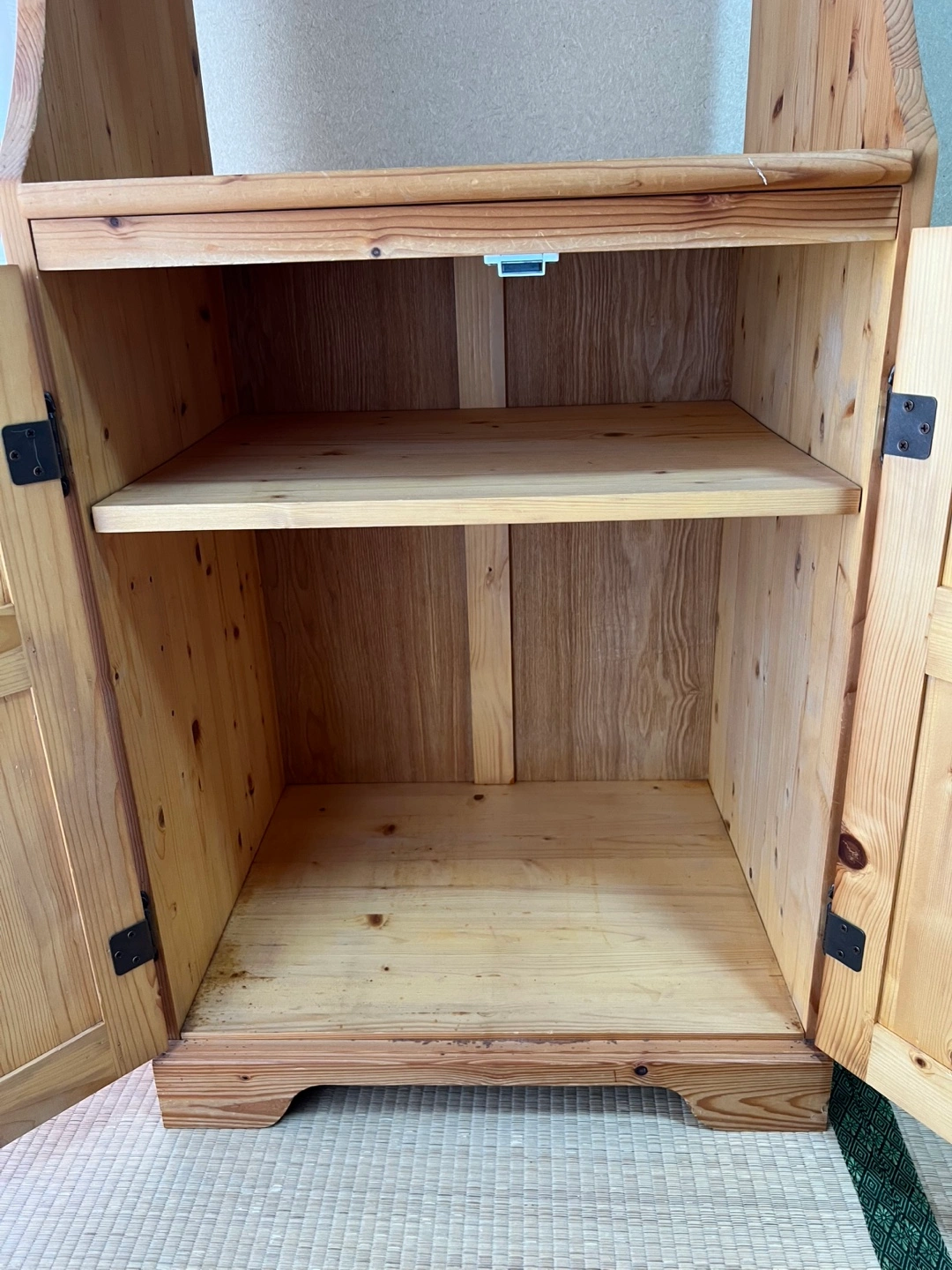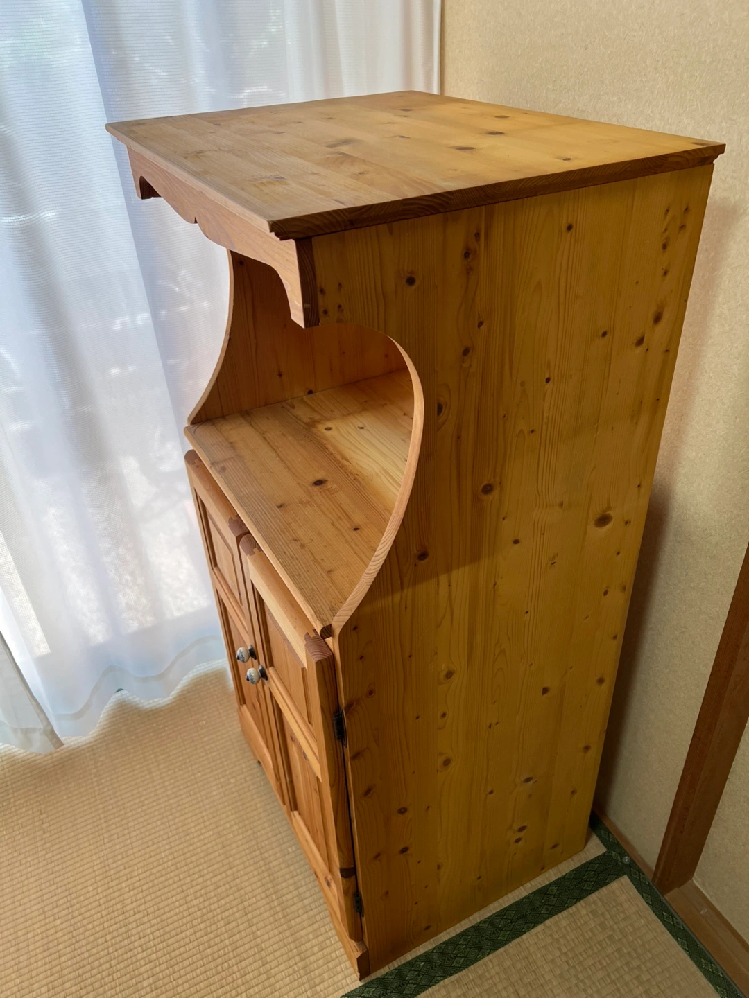 ・木製パイン材キャビネット ・棚板I枚(高さ変えられます) ・中古品 15年前に購入したキャビネットです。 商品状態:所々塗装の剥がれや傷があり、かなり使用感がありますがまだ充分お使い頂けると思います。 お好きな色でペンキを塗られたりリメイクしても良いかと思います。 取手は元々はパイン材の物でしたが陶器の取手につけ替えました。パイン材、陶器の取手どちらもお渡しします。 自宅まで取りに来て頂ける方にお譲りします。 素材:パイン材 サイズ:横幅59㎝×奥行き46㎝×高さ118㎝ 中古品であるということをご了承の上、ご購入ください。 ご不明点等ございましたらご連絡ください。