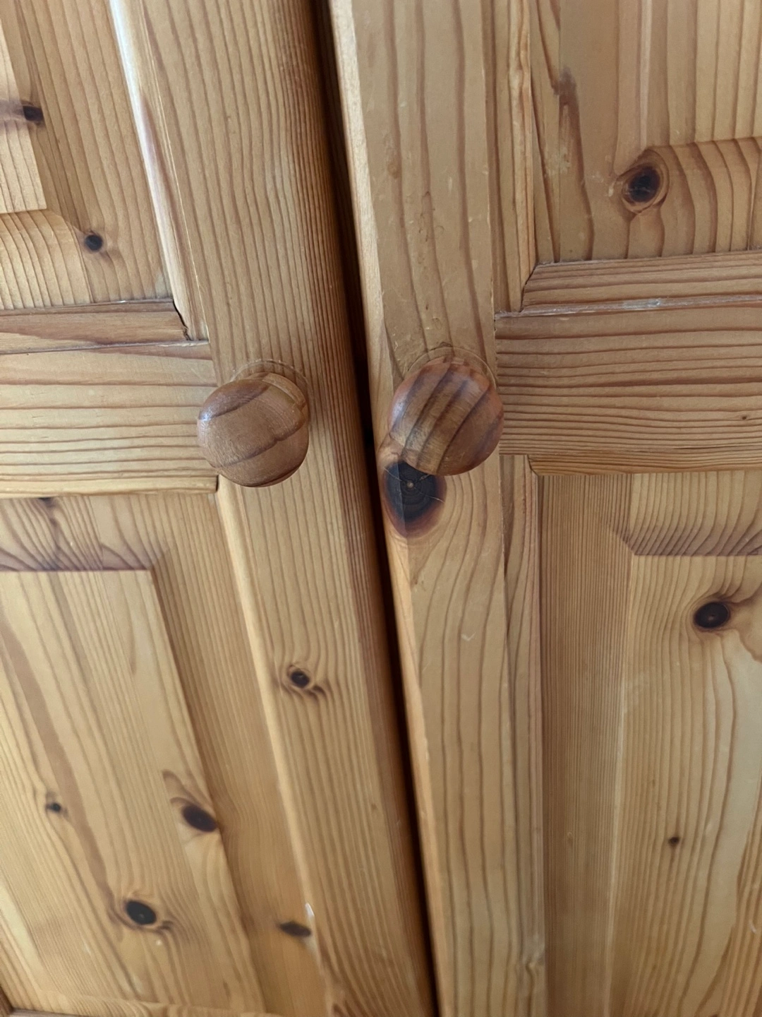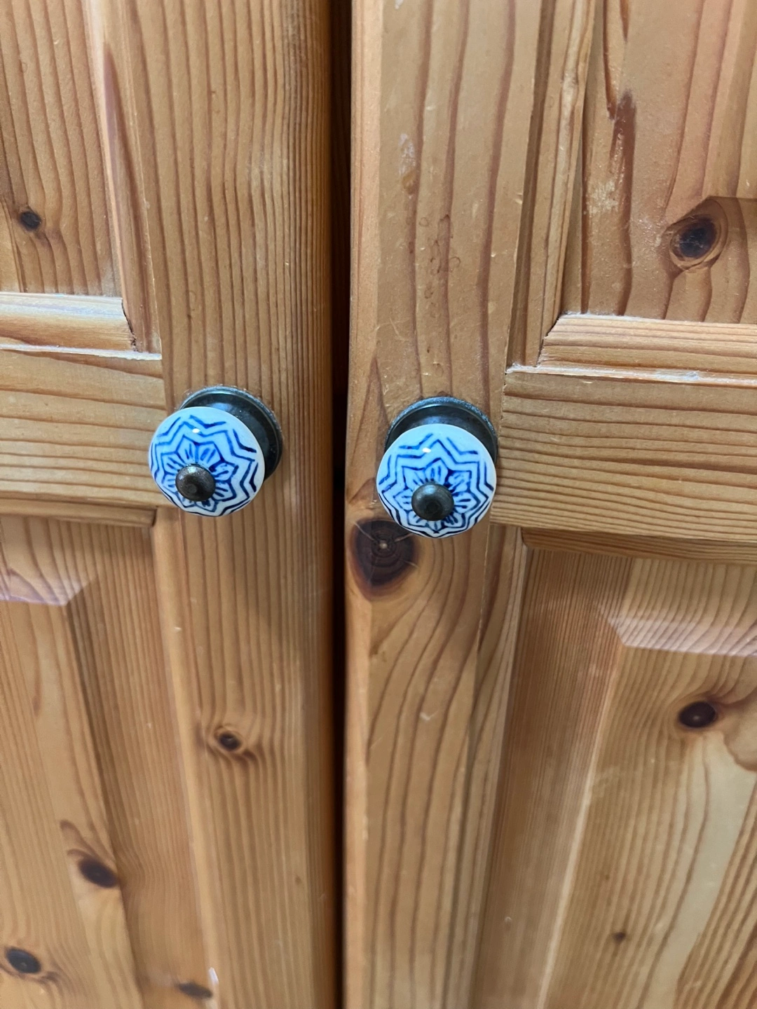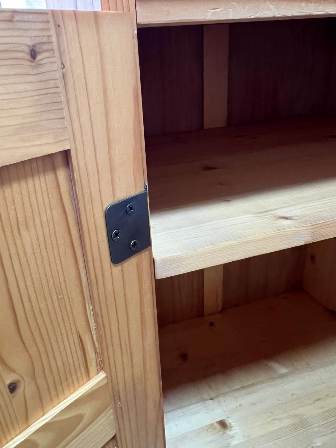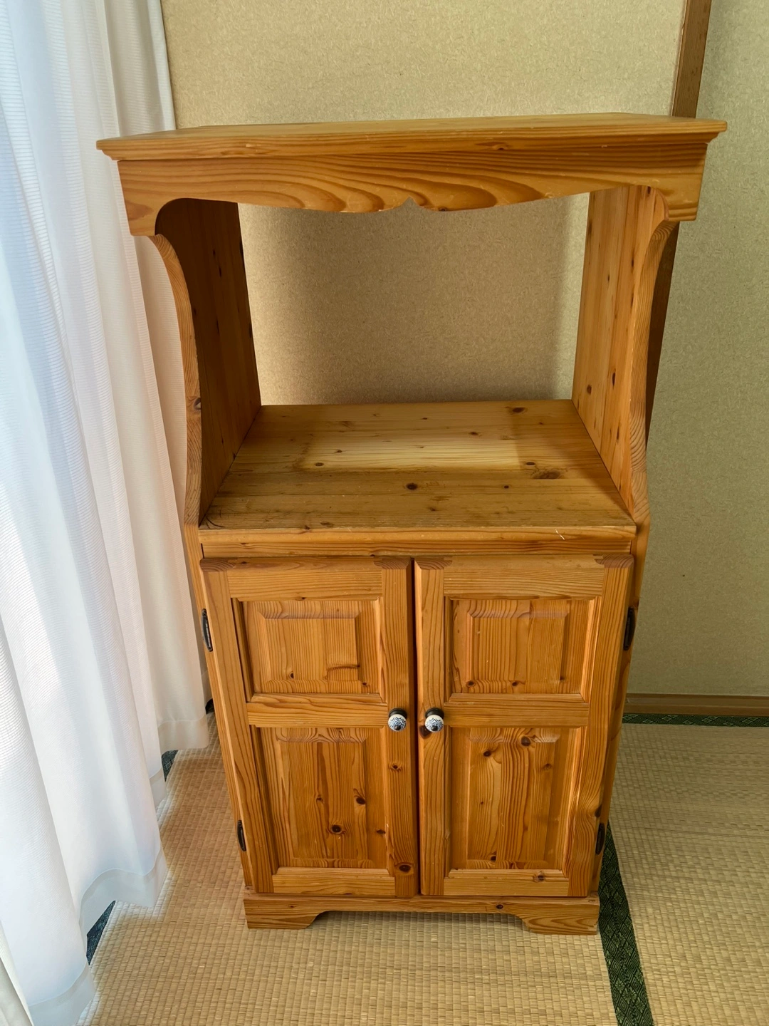 ・木製パイン材キャビネット ・棚板I枚(高さ変えられます) ・中古品 15年前に購入したキャビネットです。 商品状態:所々塗装の剥がれや傷があり、かなり使用感がありますがまだ充分お使い頂けると思います。 お好きな色でペンキを塗られたりリメイクしても良いかと思います。 取手は元々はパイン材の物でしたが陶器の取手につけ替えました。パイン材、陶器の取手どちらもお渡しします。 自宅まで取りに来て頂ける方にお譲りします。 素材:パイン材 サイズ:横幅59㎝×奥行き46㎝×高さ118㎝ 中古品であるということをご了承の上、ご購入ください。 ご不明点等ございましたらご連絡ください。