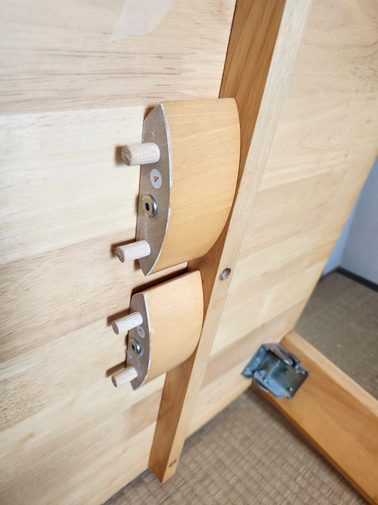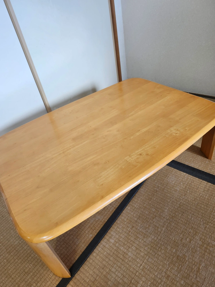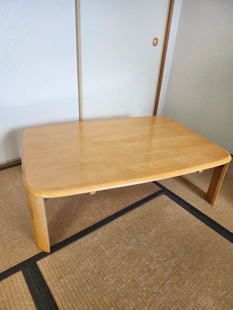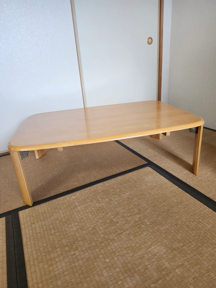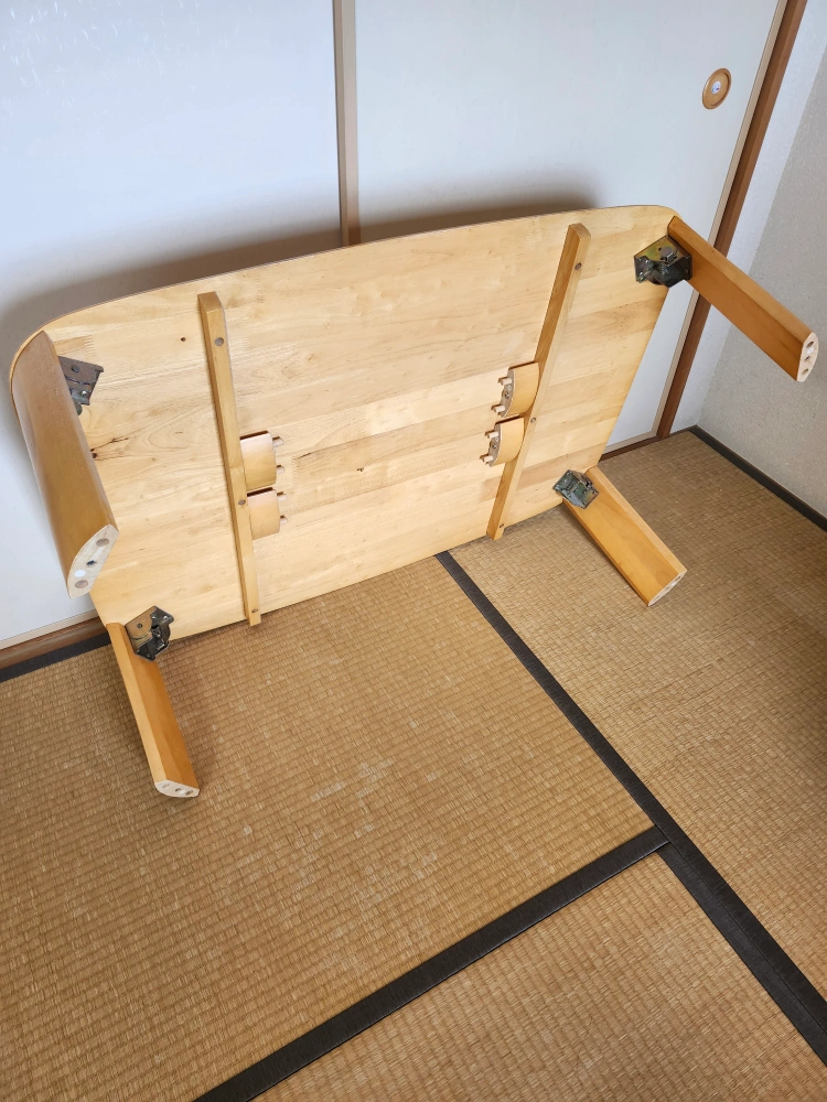 木製のローテーブルです ・色:ベージュ ・状態:使用感あり ・折りたたみ式 ・付属品で高さ5cm追加可能(テーブル裏に付属) 中古品であることご了承ください