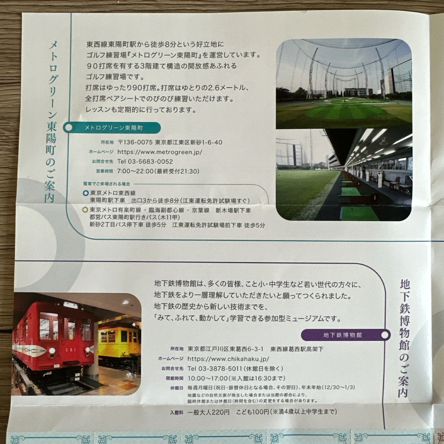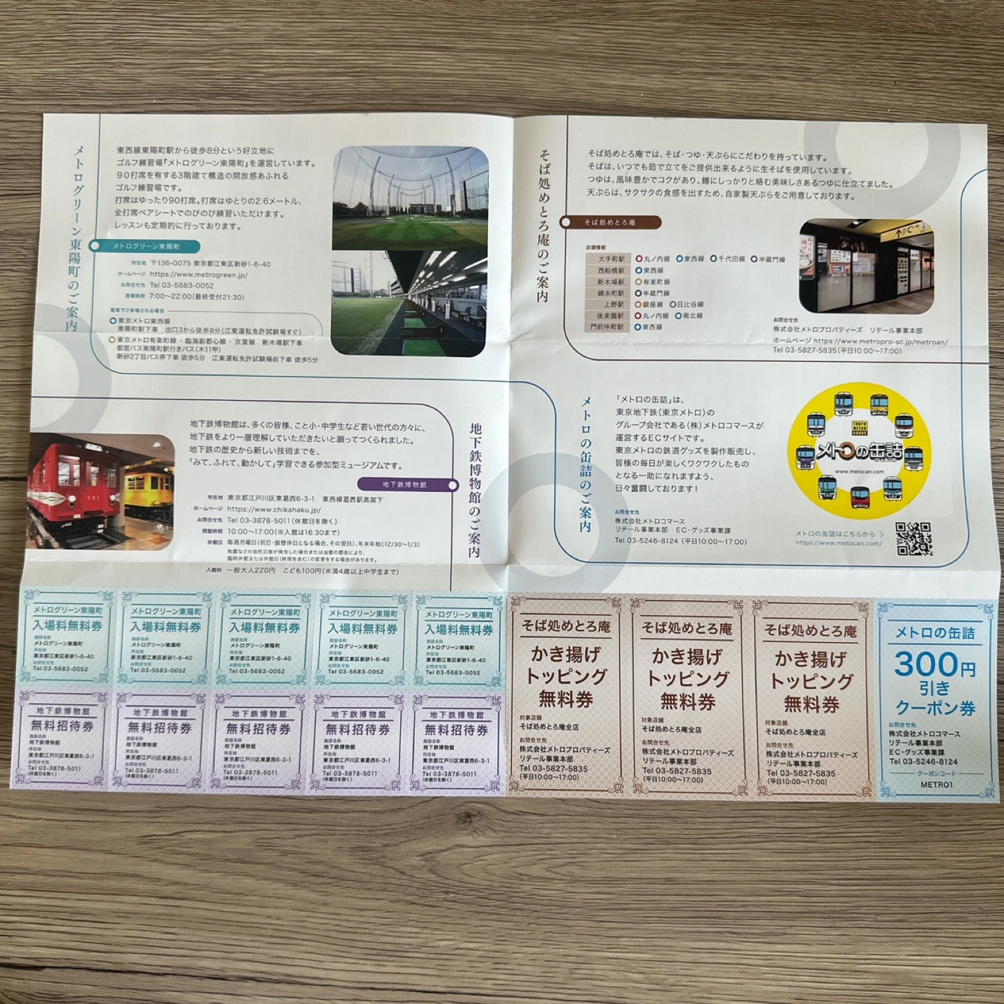 東京地下鉄 株主優待券 使用期限 2026年6月30日まで 使用予定がないのでお譲りします。 ゴルフ練習場 メトログリーン東陽町 入場無料券 5枚 葛西駅 地下鉄博物館 無料招待券 5枚 そば処めとろ庵 かき揚げトッピング無料券 3枚 メトロの缶詰 300円引きクーポン券 1枚 ※地下鉄乗車券3枚は付属しません 神経質な方の購入はご遠慮願います。 経堂駅、豪徳寺駅、周辺希望ですが、 小田急線沿い改札内と世田谷線沿いも可能です。 ご相談ください。