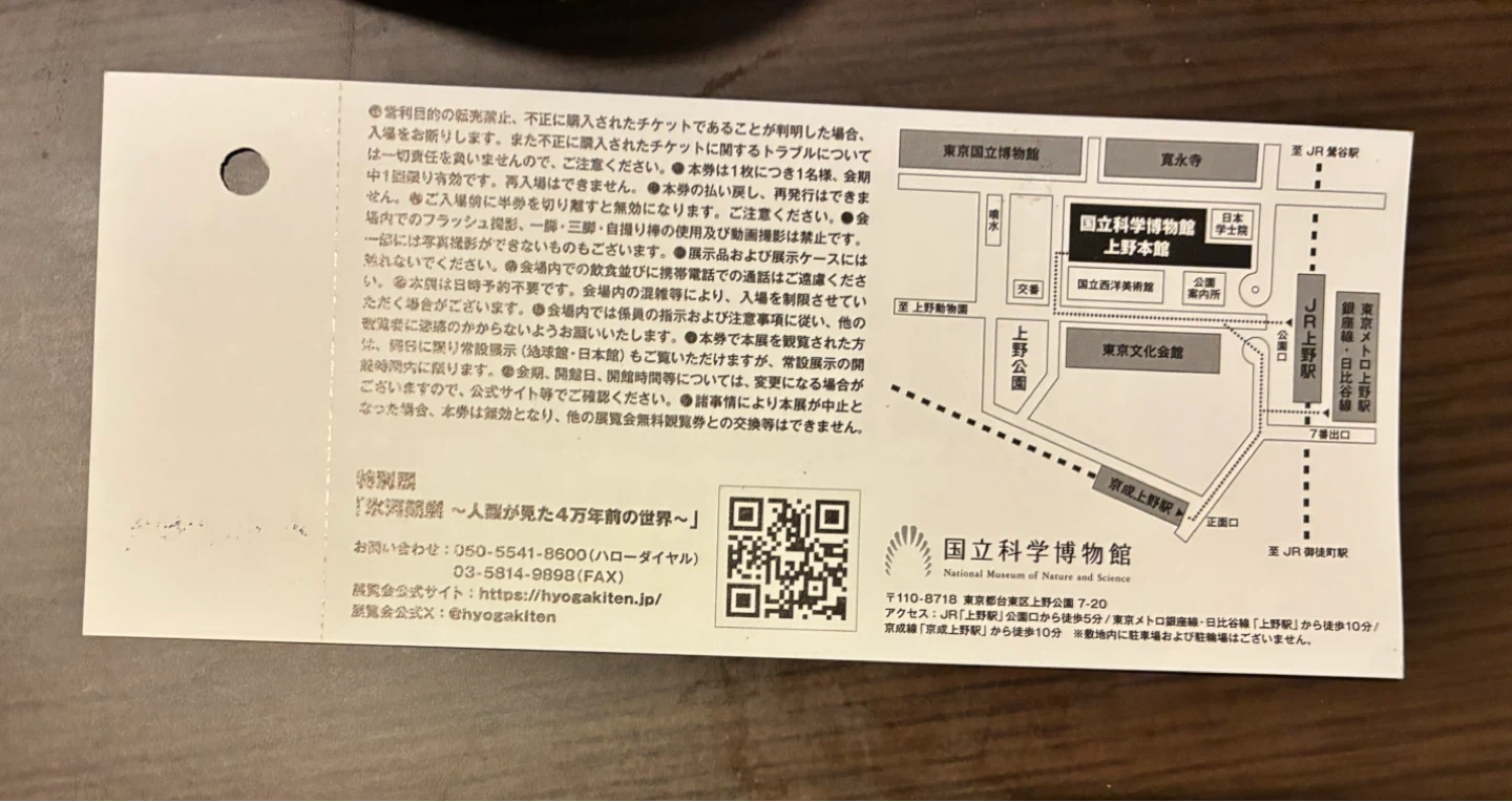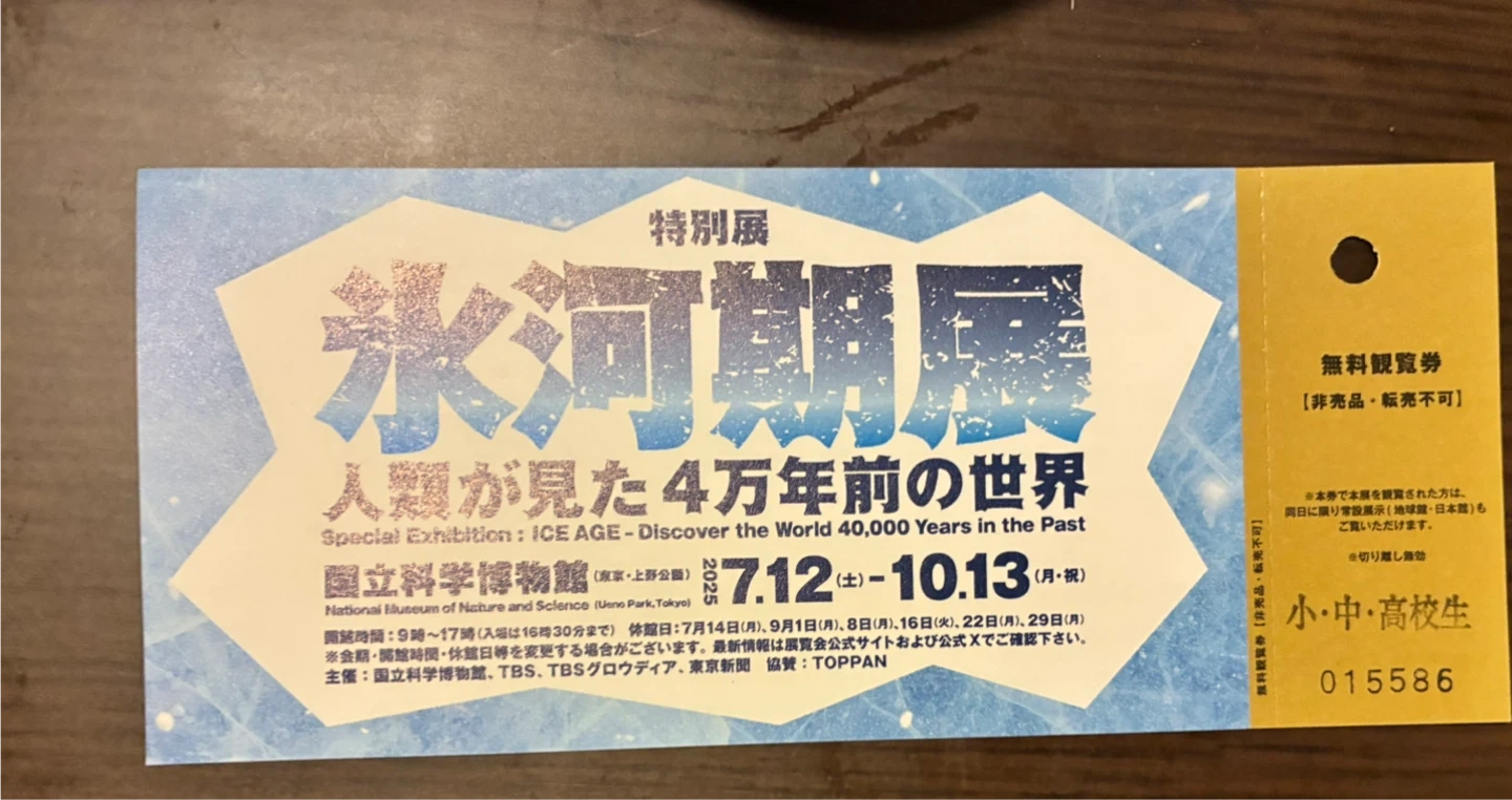 「氷河期展~人類が見た4万年前の世界~」の高校生以下用の入場券です。 10/13まで有効です。