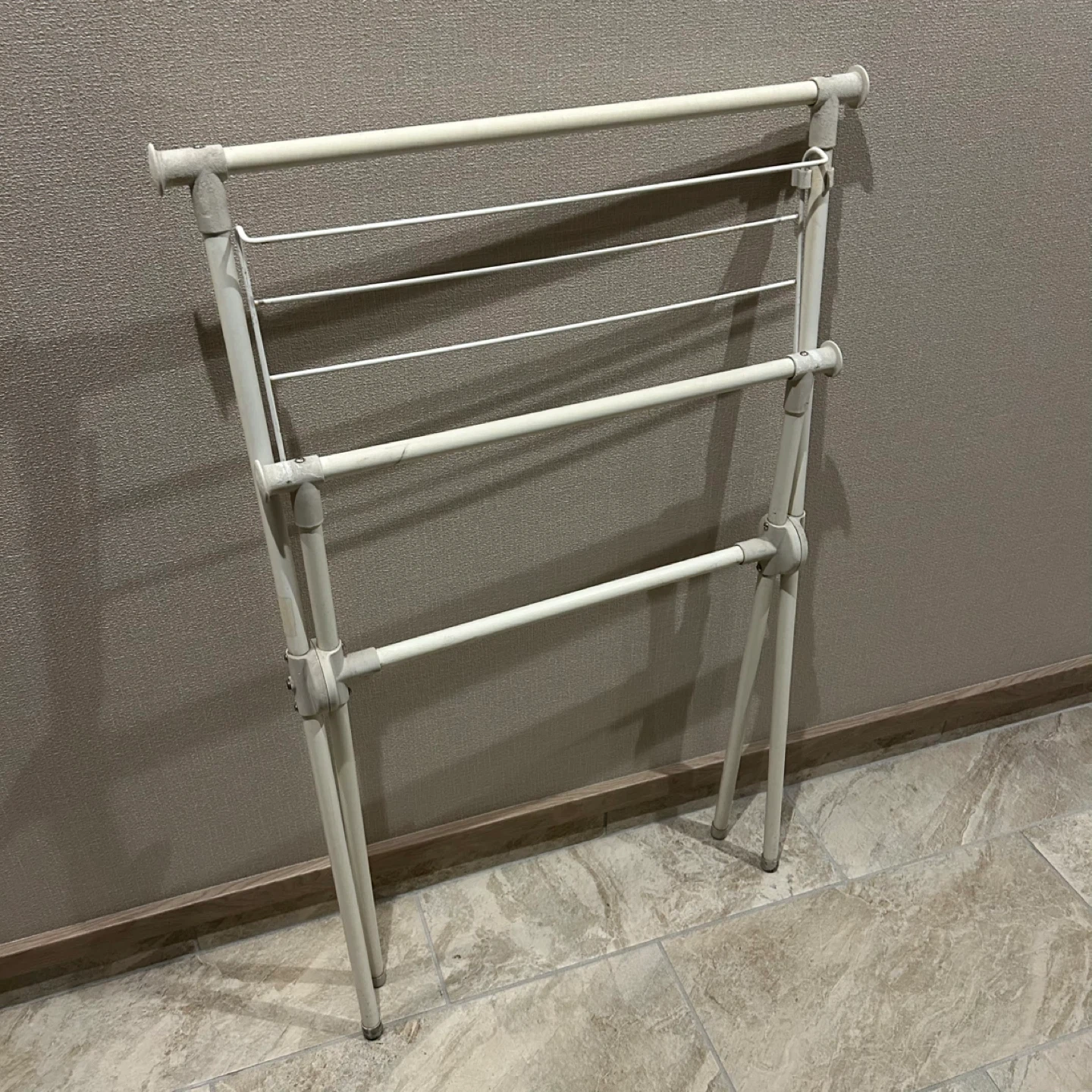 白のプラスチックの洗濯物干しスタンドです。 バスタオルをかけたりハンガーをかけることもできます。 コンパクトに折り畳めます。 約70×110cm 写真のようにサビや劣化があります。 ご理解の上お取引をお願いいたします。